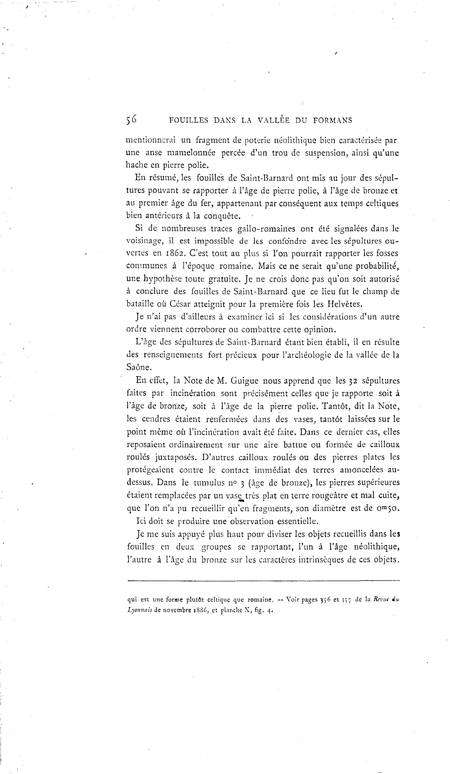 56 FOUILLES DANS LA VALLEE DU FORMANS mentionnerai un fragment de poterie néolithique bien caractérisée par une anse mamelonnée percée d'un trou de suspension, ainsi qu'une hache en pierre polie. En résumé, les fouilles de Saint-Barnard ont mis au jour des sépul- tures pouvant se rapporter à l'âge de pierre polie, à l'âge de bronze et au premier âge du fer, appartenant par conséquent aux temps celtiques bien antérieurs à la conquête. Si de nombreuses traces gallo-romaines ont été signalées dans le voisinage, il est impossible de les confo'ndre avec les sépultures ou- vertes en 1862. C'est tout au plus si l'on pourrait rapporter les fosses communes à l'époque romaine. Mais ce ne serait qu'une probabilité, une hypothèse toute gratuite. Je ne crois donc pas qu'on soit autorisé à conclure des fouilles de Saint-Barnard que ce lieu fut le champ de bataille où César atteignit pour la première fois les Helvètes. Je n'ai pas d'ailleurs à examiner ici si les considérations d'un autre ordre viennent corroborer ou combattre cette opinion. L'âge des sépultures de Saint-Barnard étant bien établi, il en résulte des renseignements fort précieux pour l'archéologie de la vallée de la Saône. En effet, la Note de M. Guigue nous apprend que les 32 sépultures faites par incinération sont précisément celles que je rapporte soit à l'âge de bronze, soit à l'âge de la pierre polie. Tantôt, dit la Note, les cendres étaient renfermées dans des vases, tantôt laissées sur le point même où l'incinération avait été faite. Dans ce dernier cas, elles reposaient ordinairement sur une aire battue ou formée de cailloux roulés juxtaposés. D'autres cailloux roulés ou des pierres plates les protégeaient contre le contact immédiat des terres amoncelées au- dessus. Dans le tumulus n° 3 (âge de bronze), les pierres supérieures étaient remplacées par un vase très plat en terre rougeâtre et mal cuite, que l'on n'a pu recueillir qu'en fragments, son diamètre est de o m 50. Ici doit se produire une observation essentielle. Je me suis appuyé plus haut pour diviser les objets recueillis dans les fouilles en deux groupes se rapportant, l'un à l'âge néolithique, l'autre à l'âge du bronze sur les caractères intrinsèques de ces objets. qui est une forme plutôt celtique que romaine. ~ Voir pages 35e et 3,7 de la Revue du Lyonnais de novembre ïSS6, et planche X, fig. 4.