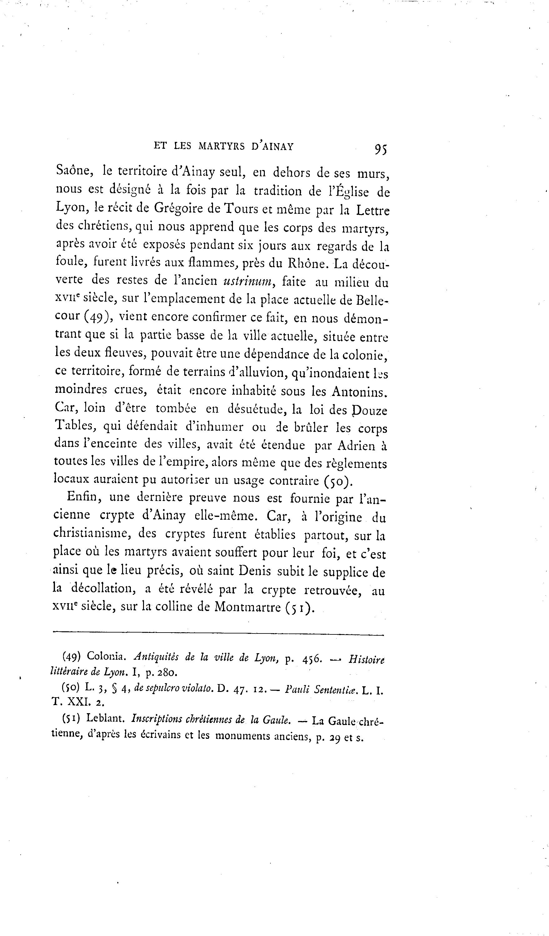 ET LES MARTYRS D'AINAY 95 Saône, le territoire d'Ainay seul, en dehors de ses murs, nous est désigné à la fois par la tradition de l'Église de Lyon, le récit de Grégoire de Tours et même par la Lettre des chrétiens, qui nous apprend que les corps des martyrs, après avoir été exposés pendant six jours aux regards de la foule, furent livrés aux flammes, près du Rhône. La décou- verte des restes de l'ancien ustrinum, faite au milieu du xvne siècle, sur l'emplacement de la place actuelle de Belle- cour (49), vient encore confirmer ce fait, en nous démon- trant que si la partie basse de la ville actuelle, située entre les deux fleuves, pouvait être une dépendance de la colonie, ce territoire, formé de terrains d'alluvion, qu'inondaient L-s moindres crues, était encore inhabité sous les Antonins. Car, loin d'être tombée en désuétude, la loi des Douze Tables, qui défendait d'inhumer ou de brûler les corps dans l'enceinte des villes, avait été étendue par Adrien à toutes les villes de l'empire, alors même que des règlements locaux auraient pu autoriser un usage contraire (50). Enfin, une dernière preuve nous est fournie par l'an- cienne crypte d'Ainay elle-même. Car, à l'origine du christianisme, des cryptes furent établies partout, sur la place où les martyrs avaient souffert pour leur foi, et c'est ainsi que le lieu précis, où saint Denis subit le supplice de la décollation, a été révélé par la crypte retrouvée, au xviie siècle, sur la colline de Montmartre (5 1). (49) Colonia. Antiquités de la ville de Lyon, p. 456. — Histoire littéraire de Lyon. I, p. 280. (50) L. 3, § 4, desepulcro violato. D. 47. 12. — Failli Sententia. L. I. T. XXI. 2. (51) Leblant. Inscriptions chrétiennes de la Gaule. — La Gaule chré- tienne, d'après les écrivains et les monuments anciens, p. 29 et s.
