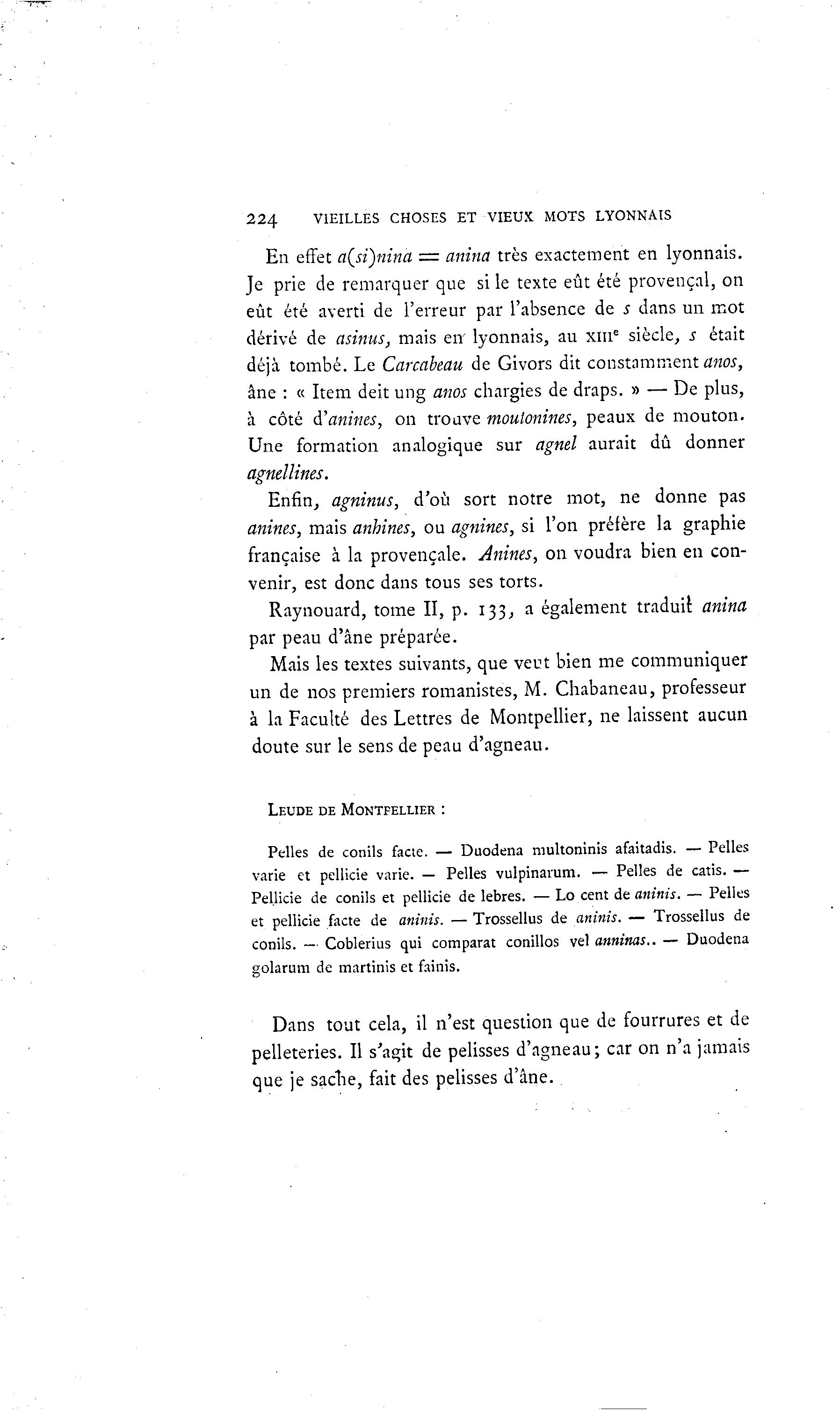 224 VIEILLES CHOSES ET VIEUX MOTS LYONNAIS En effet a(si)nina = anina très exactement en lyonnais. Je prie de remarquer que si le texte eût été provençal, on eût été averti de l'erreur par l'absence de s dans un mot dérivé de asinus, mais eir lyonnais, au xm e siècle, s était déjà tombé. Le Carcahe.au de Givors dit constamment anos, âne : « Item deit ung anos chargies de draps. » — De plus, à côté A'anines, on trouve mouionines, peaux de mouton. Une formation analogique sur agnel aurait dû donner agnellines. Enfin, agninus, d'où sort notre mot, ne donne pas anines, mais anhines, ou agnines, si l'on préfère la graphie française à la provençale. Anines, on voudra bien en con- venir, est donc dans tous ses torts. Raynouard, tome II, p. 133, a également traduit anina par peau d'âne préparée. Mais les textes suivants, que veut bien me communiquer un de nos premiers romanistes, M. Chabaneau, professeur à la Faculté des Lettres de Montpellier, ne laissent aucun doute sur le sens de peau d'agneau. LEUDE DE MONTPELLIER : Pelles de conils facte. — Duodena multoninis afaitadis. — Pelles varie et pellicie varie. — Pelles vulpinarum. — Pelles de catis. — Pellicie de conils et pellicie de lebres. — Lo cent de aninis. — Pelles et pellicie facte de aninis. — Trossellus de aninis. — Trossellus de conils. — Coblerius qui comparât conillos vel anninas.. — Duodena golarura de martinis et fainis. Dans tout cela, il n'est question que de fourrures et de pelleteries. Il s'agit de pelisses d'agneau; car on n'a jamais que je sache, fait des pelisses d'âne.