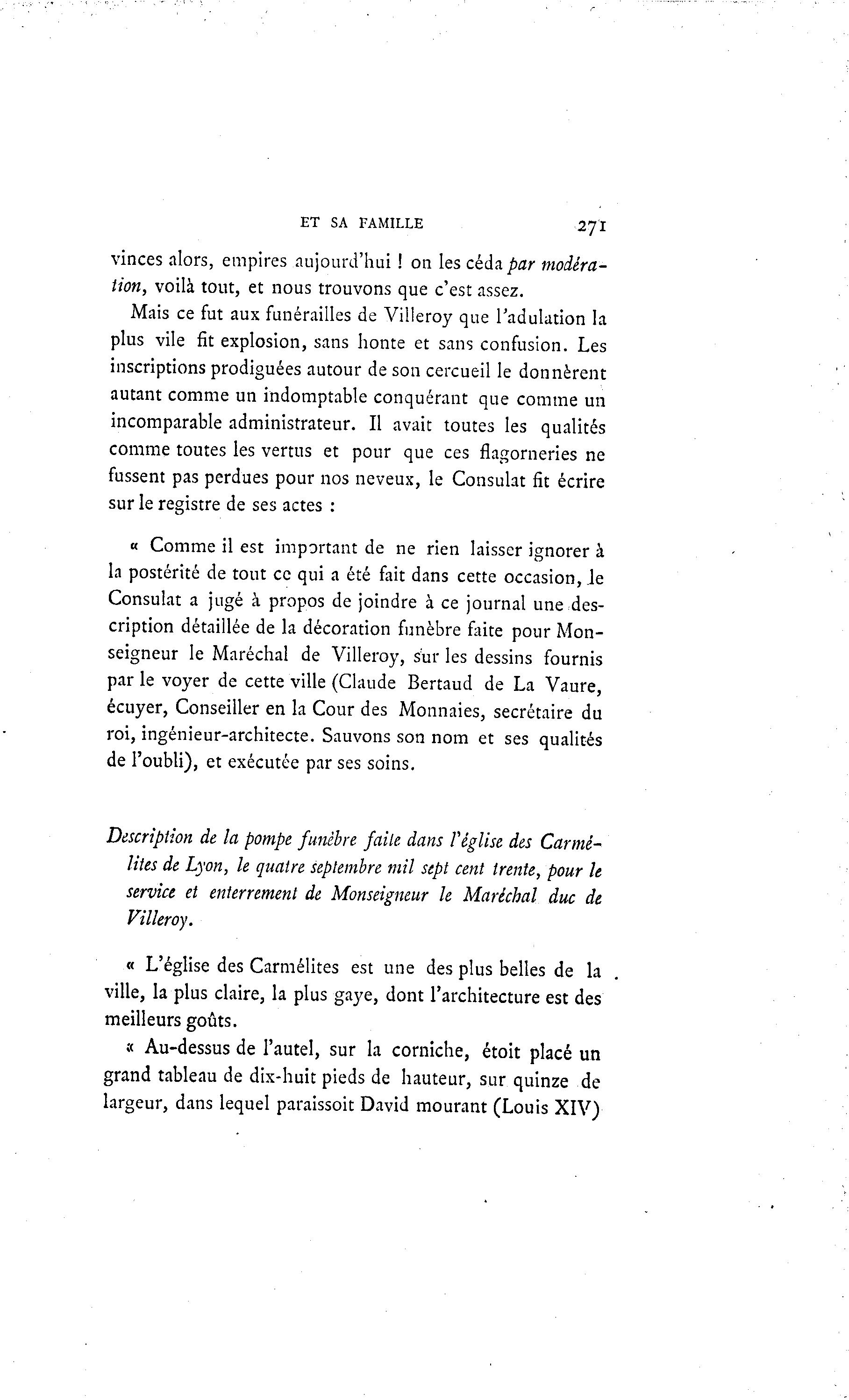 ET SA FAMILLE 27à vinces alors, empires aujourd'hui ! on les céda par modéra- tion, voilà tout, et nous trouvons que c'est assez. Mais ce fut aux funérailles de Villeroy que l'adulation la plus vile fit explosion, sans honte et sans confusion. Les inscriptions prodiguées autour de son cercueil le donnèrent autant comme un indomptable conquérant que comme un incomparable administrateur. Il avait toutes les qualités comme toutes les vertus et pour que ces flagorneries ne fussent pas perdues pour nos neveux, le Consulat fit écrire sur le registre de ses actes : « Comme il est important de ne rien laisser ignorer à la postérité de tout ce qui a été fait dans cette occasion, le Consulat a jugé à propos de joindre à ce journal une des- cription détaillée de la décoration funèbre faite pour Mon- seigneur le Maréchal de Villeroy, sur les dessins fournis par le voyer de cette ville (Claude Bertaud de La Vaure, écuyer, Conseiller en la Cour des Monnaies, secrétaire du roi, ingénieur-architecte. Sauvons son nom et ses qualités de l'oubli), et exécutée par ses soins. Description de la pompe funèbre faite dans l'église des Carmé- lites de Lyon, le quatre septembre mil sept cent trente, pour le service et enterrement de Monseigneur le Maréchal duc de Villeroy. « L'église des Carmélites est une des plus belles de la . ville, la plus claire, la plus gaye, dont l'architecture est des meilleurs goûts. « Au-dessus de l'autel, sur la corniche, étoit placé un grand tableau de dix-huit pieds de hauteur, sur quinze de largeur, dans lequel paraissoit David mourant (Louis XIV)
