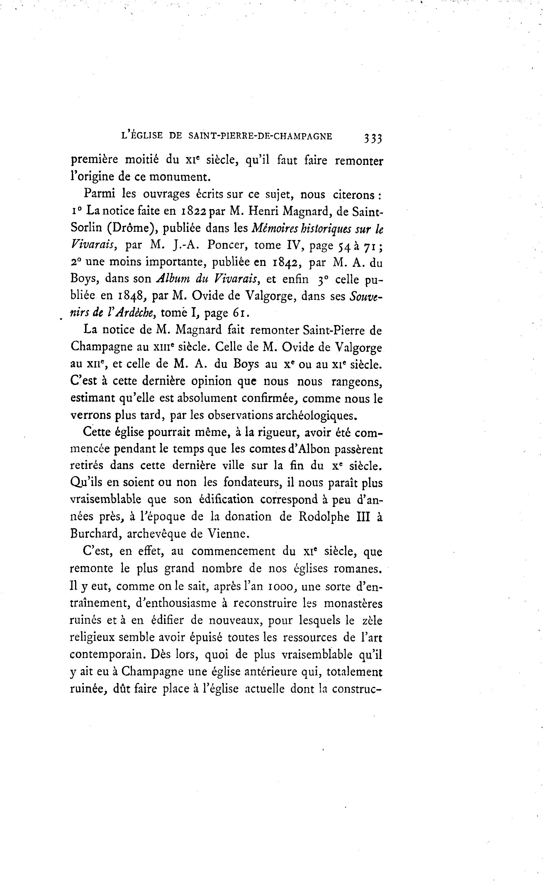 L'ÉGLISE DE SAINT-PIERRE-DE-CHAMPAGNE 333 première moitié du xie siècle, qu'il faut faire remonter l'origine de ce monument. Parmi les ouvrages écrits sur ce sujet, nous citerons : i° La notice faite en 1822 par M. Henri Magnard, de Saint- Sorlin (Drôme), publiée dans les Mémoires historiques sur le Vivarais, par M. J.-A. Poncer, tome IV, page 54 a 71 ; 2° une moins importante, publiée en 1842, par M. A. du Boys, dans son Album du Vivarais, et enfin 30 celle pu- bliée en 1848, par M. Ovide de Valgorge, dans ses Souve- nirs de VArdèche, tome I, page 61. La notice de M. Magnard fait remonter Saint-Pierre de Champagne au xme siècle. Celle de M. Ovide de Valgorge au xiie, et celle de M. A. du Boys au Xe ou au xie siècle. C'est à cette dernière opinion que nous nous rangeons, estimant qu'elle est absolument confirmée, comme nous le verrons plus tard, par les observations archéologiques. Cette église pourrait même, à la rigueur, avoir été com- mencée pendant le temps que les comtes d'Albon passèrent retirés dans cette dernière ville sur la fin du xe siècle. Qu'ils en soient ou non les fondateurs, il nous paraît plus vraisemblable que son édification correspond à peu d'an- nées près, à l'époque de la donation de Rodolphe III à Burchard, archevêque de Vienne. C'est, en effet, au commencement du xie siècle, que remonte le plus grand nombre de nos églises romanes. Il y eut, comme on le sait, après l'an 1000, une sorte d'en- traînement, d'enthousiasme à reconstruire les monastères ruinés et à en édifier de nouveaux, pour lesquels le zèle religieux semble avoir épuisé toutes les ressources de l'art contemporain. Dès lors, quoi de plus vraisemblable qu'il y ait eu à Champagne une église antérieure qui, totalement ruinée, dût faire place à l'église actuelle dont la construc-