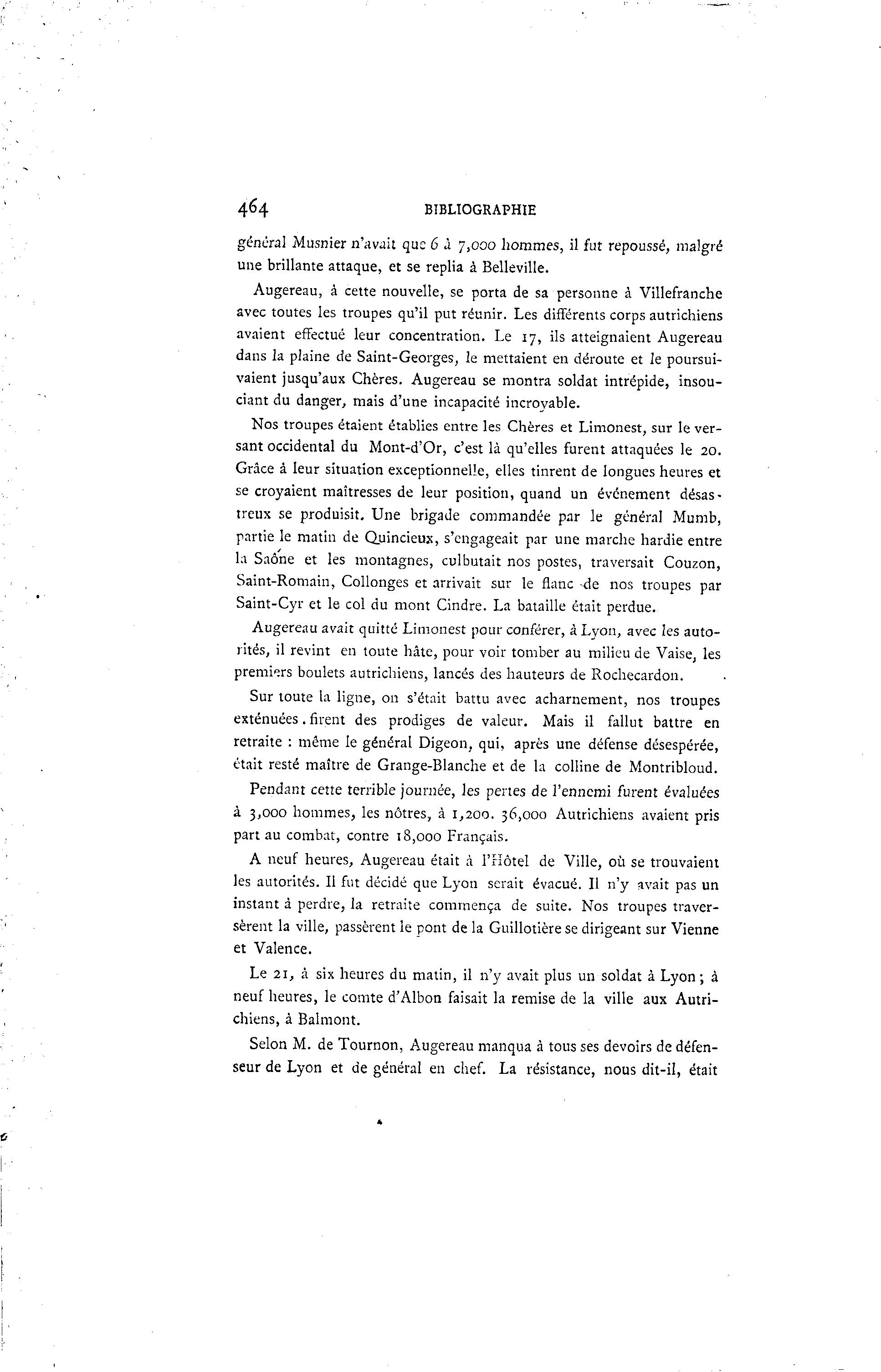 464 BIBLIOGRAPHIE général Musnier n'avait que 6 à 7,000 hommes, il fut repoussé, malgré une brillante attaque, et se replia à Belleville. Augereau, à cette nouvelle, se porta de sa personne à Villefranche avec toutes les troupes qu'il put réunir. Les différents corps autrichiens avaient effectué leur concentration. Le 17, ils atteignaient Augereau dans la plaine de Saint-Georges, le mettaient en déroute et le poursui- vaient jusqu'aux Chères. Augereau se montra soldat intrépide, insou- ciant du danger, mais d'une incapacité incroyable. Nos troupes étaient établies entre les Chères et Limonest, sur le ver- sant occidental du Mont-d'Or, c'est là qu'elles furent attaquées le 20. Grâce à leur situation exceptionnelle, elles tinrent de longues heures et se croyaient maîtresses de leur position, quand un événement désas- treux se produisit. Une brigade commandée par le général Mumb, partie le matin de Quincieux, s'engageait par une marche hardie entre la Saône et les montagnes, culbutait nos postes, traversait Couzon, Saint-Romain, Collonges et arrivait sur le flanc -de nos troupes par Saint-Cyr et le col du mont Cindre. La bataille était perdue. Augereau avait quitté Limonest pour conférer, à Lyon, avec les auto- rités, il revint en toute hâte, pour voir tomber au milieu de Vaise, les premiers boulets autrichiens, lancés des hauteurs de Rochecardon. Sur toute la ligne, on s'était battu avec acharnement, nos troupes exténuées. firent des prodiges de valeur. Mais il fallut battre en retraite : même le général Digeon, qui, après une défense désespérée, était resté maître de Grange-Blanche et de la colline de Montribloud. Pendant cette terrible journée, les pertes de l'ennemi furent évaluées à 3,000 hommes, les nôtres, à 1,200. 36,000 Autrichiens avaient pris part au combat, contre 18,000 Français. A neuf heures, Augereau était à l'Hôtel de Ville, où se trouvaient les autorités. Il fut décidé que Lyon serait évacué. Il n'y avait pas un instant à perdre, la retraite commença de suite. Nos troupes traver- sèrent la ville, passèrent le pont de la Guillotière se dirigeant sur Vienne et Valence. Le 2 1 , à six heures du matin, il n'y avait plus un soldat à Lyon ; à neuf heures, le comte d'Albon faisait la remise de la ville aux Autri- chiens, à Balmont. Selon M. de Tournon, Augereau manqua à tous ses devoirs de défen- seur de Lyon et de général en chef. La résistance, nous dit-il, était