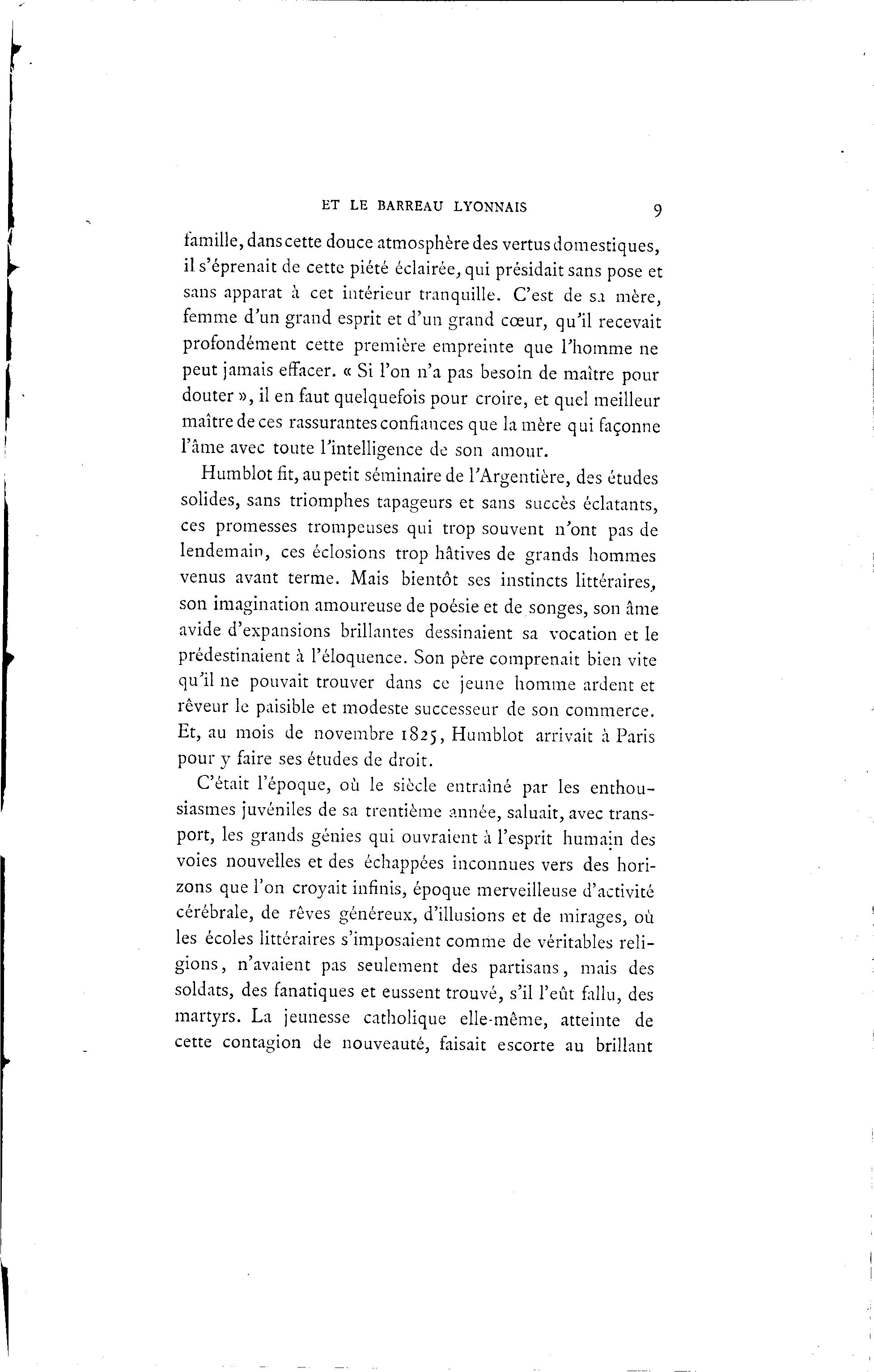 ET LE BARREAU LYONNAIS 9 famille, dans cette douce atmosphère des vertus domestiques, il s'éprenait de cette piété éclairée, qui présidait sans pose et sans apparat à cet intérieur tranquille. C'est de s.i mère, femme d'un grand esprit et d'un grand cœur, qu'il recevait profondément cette première empreinte que l'homme ne peut jamais effacer. « Si l'on n'a pas besoin de maître pour douter », il en faut quelquefois pour croire, et quel meilleur maître de ces rassurantes confiances que la mère qui façonne l'âme avec toute l'intelligence de son amour. Humblot fit, au petit séminaire de l'Argentière, des études solides, sans triomphes tapageurs et sans succès éclatants, ces promesses trompeuses qui trop souvent n'ont pas de lendemain, ces éclosions trop hâtives de grands hommes venus avant terme. Mais bientôt ses instincts littéraires, son imagination amoureuse de poésie et de songes, son âme avide d'expansions brillantes dessinaient sa vocation et le prédestinaient à l'éloquence. Son père comprenait bien vite qu'il ne pouvait trouver dans ce jeune homme ardent et rêveur le paisible et modeste successeur de son commerce. Et, au mois de novembre 1825, Humblot arrivait à Paris pour y faire ses études de droit. C'était l'époque, où le siècle entraîné par les enthou- siasmes juvéniles de sa trentième année, saluait, avec trans- port, les grands génies qui ouvraient à l'esprit humain des voies nouvelles et des échappées inconnues vers des hori- zons que l'on croyait infinis, époque merveilleuse d'activité cérébrale, de rêves généreux, d'illusions et de mirages, où les écoles littéraires s'imposaient comme de véritables reli- gions, n'avaient pas seulement des partisans, mais des soldats, des fanatiques et eussent trouvé, s'il l'eût fallu, des martyrs. La jeunesse catholique elle-même, atteinte de cette contagion de nouveauté, faisait escorte au brillant
