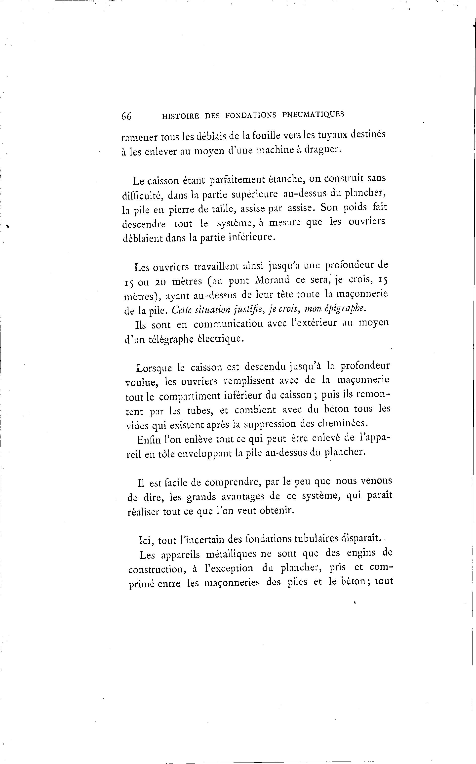 66 HISTOIRE DES FONDATIONS PNEUMATIQUES ramener tous les déblais de la fouille vers les tuyaux destinés à les enlever au moyen d'une machine à draguer. Le caisson étant parfaitement étanche, on construit sans difficulté, dans la partie supérieure au-dessus du plancher, la pile en pierre de taille, assise par assise. Son poids fait descendre tout le système, à mesure que les ouvriers déblaient dans la partie inférieure. Les ouvriers travaillent ainsi jusqu'à une profondeur de 15 ou 20 mètres (au pont Morand ce sera, je crois, 15 mètres), ayant au-des.cus de leur tête toute la maçonnerie de la pile. Cette situation justifie, je crois, mon épigraphe. Ils sont en communication avec l'extérieur au moyen d'un télégraphe électrique. Lorsque le caisson est descendu jusqu'à la profondeur voulue, les ouvriers remplissent avec de la maçonnerie tout le compartiment inférieur du caisson ; puis ils remon- tent par L-s tubes, et comblent avec du béton tous les vides qui existent après la suppression des cheminées. Enfin l'on enlève tout ce qui peut être enlevé de l'appa- reil en tôle enveloppant la pile au-dessus du plancher. Il est facile de comprendre, par le peu que nous venons de dire, les grands avantages de ce système, qui paraît réaliser tout ce que l'on veut obtenir. Ici, tout l'incertain des fondations tubulaires disparaît. Les appareils métalliques ne sont que des engins de construction, à l'exception du plancher, pris et com- primé entre les maçonneries des piles et le béton ; tout
