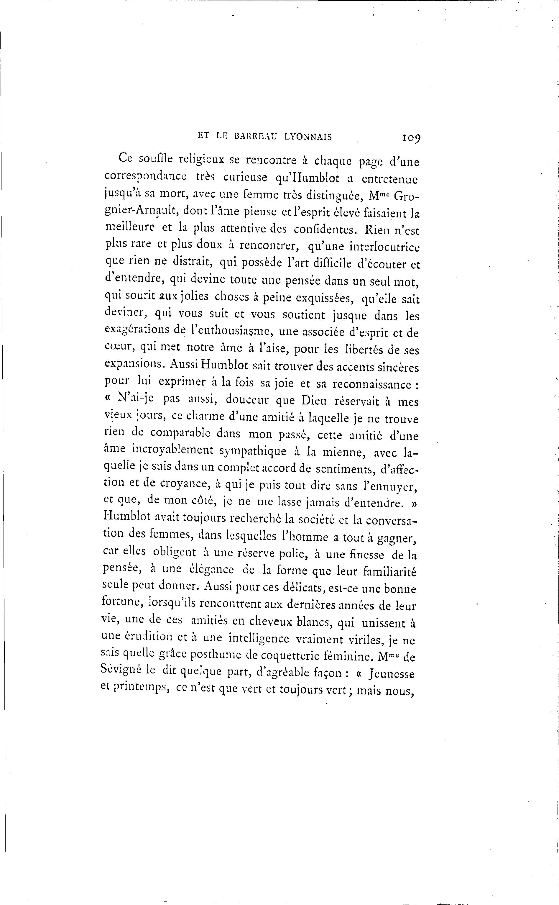 ET LE BARREAU LYONNAIS I09 Ce souffle religieux se rencontre à chaque page d'une correspondance très curieuse qu'Humblot a entretenue jusqu'à sa mort, avec une femme très distinguée, Mme Gro- gnier-Arnault, donc l'âme pieuse et l'esprit élevé faisaient la meilleure et la plus attentive des confidentes. Rien n'est plus rare et plus doux à rencontrer, qu'une interlocutrice que rien ne distrait, qui possède l'art difficile d'écouter et d'entendre, qui devine toute une pensée dans un seul mot, qui sourit aux jolies choses à peine exquissées, qu'elle sait deviner, qui vous suit et vous soutient jusque dans les exagérations de l'enthousiasme, une associée d'esprit et de cœur, qui met notre âme à l'aise, pour les libertés de ses expansions. Aussi Humblot sait trouver des accents sincères pour lui exprimer à la fois sa joie et sa reconnaissance : « N'ai-je pas aussi, douceur que Dieu réservait à mes vieux jours, ce charme d'une amitié à laquelle je ne trouve rien de comparable dans mon passé, cette amitié d'une âme incroyablement sympathique à la mienne, avec la- quelle je suis dans un complet accord de sentiments, d'affec- tion et de croyance, à qui je puis tout dire sans l'ennuyer, et que, de mon côté, je ne me lasse jamais d'entendre. » Humblot avait toujours recherché la société et la conversa- tion des femmes, dans lesquelles l'homme a tout à gagner, car elles obligent à une réserve polie, à une finesse de la pensée, à une élégance de la forme que leur familiarité seule peut donner. Aussi pour ces délicats, est-ce une bonne fortune, lorsqu'ils rencontrent aux dernières années de leur vie, une de ces amitiés en cheveux blancs, qui unissent à une érudition et à une intelligence vraiment viriles, je ne sais quelle grâce posthume de coquetterie féminine. Mme de Sévigné le dit quelque part, d'agréable façon : « Jeunesse et printemps, ce n'est que vert et toujours vert; mais nous,