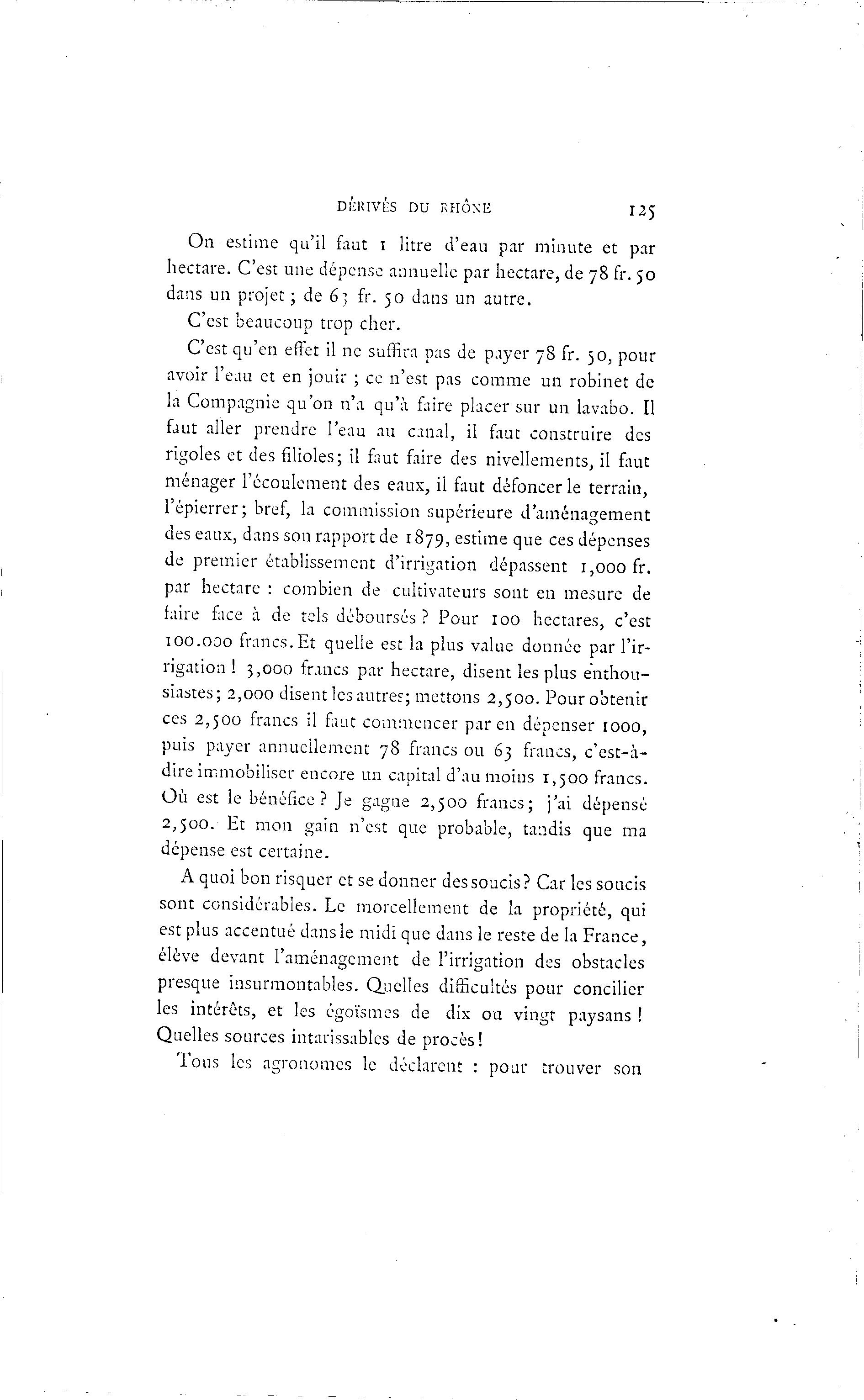 DÉRIVÉS DU KHÔXE 125 O n estime qu'il faut i litre d'eau par minute et par hectare. C'est une dépense annuelle par hectare, de 78 fr. 50 dans un projet ; de 6} fr. 50 dans un autre. C'est beaucoup trop cher. C'est qu'en effet il ne suffira pas de payer 78 fr. 50, pour avoir l'eau et en jouir ; ce n'est pas comme un robinet de la Compagnie qu'on n'a qu'à faire placer sur un lavabo. Il faut aller prendre l'eau au canal, il faut construire des rigoles et des filioles; il faut faire des nivellements, il faut ménager l'écoulement des eaux, il faut défoncer le terrain, l'épierrer; bref, la commission supérieure d'aménagement des eaux, dans son rapport de 1879, estime que ces dépenses de premier établissement d'irrigation dépassent 1,000 fr. par hectare : combien de cultivateurs sont en mesure de faire face à de tels déboursés ? P o u r 100 hectares, c'est 100.000 francs. Et quelle est la plus value donnée par l'ir- rigation ! 3,000 francs par hectare, disent les plus e n t h o u - siastes; 2,000 disent les autre?; mettons 2 , 5 0 0 . Pour obtenir ces 2,500 francs il faut commencer par en dépenser 1000, puis payer annuellement 78 francs ou 6} francs, c'est-à - dire immobiliser encore un capital d'au moins 1,500 francs. O ù est le bénéfice? Je gagne 2,500 francs; j'ai dépensé 2,500. Et m o n gain n'est que probable, tandis que ma dépense est certaine. A quoi bon risquer et se donner des soucis? Car les soucis sont considérables. Le morcellement de la propriété, qui est plus accentué dans le midi que dans le reste de la F r a n c e , élève devant l'aménagement de l'irrigation des obstacles presque insurmontables. Quelles difficultés pour concilier les intérêts, et les égoïsmes de dix ou vingt paysans ! Quelles sources intarissables de procès! T o u s les agronomes le déclarent : pour trouver son