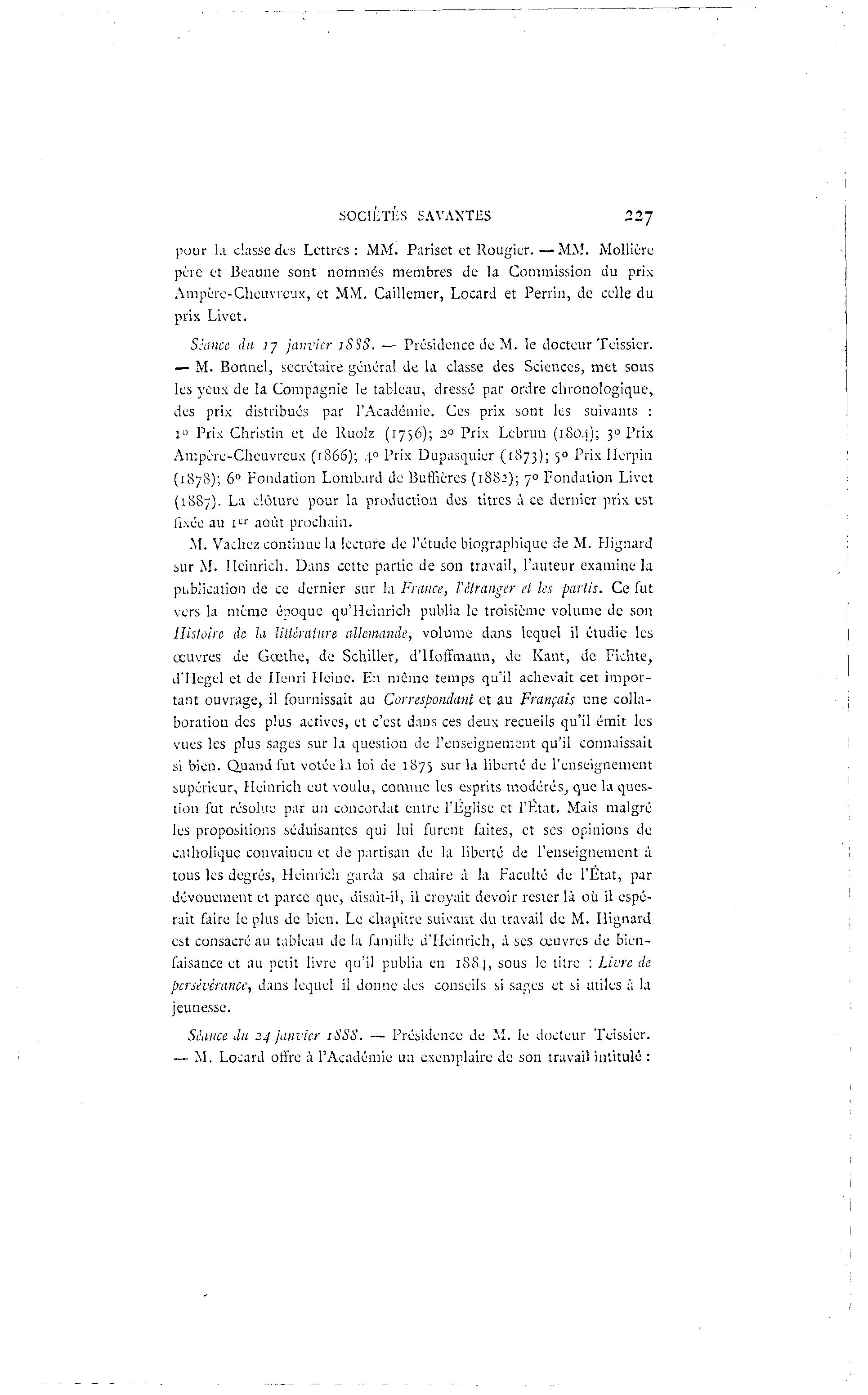 SOCIETES SAVANTES 227 pour la classe des Lettres: MM. Pariset et Rougier.—MM. Mollière père et Beaune sont nommés membres de la Commission du prix Ampcre-Cheuvrcux, et MM. Caillemer, Locard et Perrin, de celle du prix Livet. Séance du ly janvier iSSS. — Présidence de M. le docteur Teissicr. — M. Bonnel, secrétaire général de la classe des Sciences, met sous les yeux de la Compagnie le tableau, dressé par ordre chronologique, des prix distribués par l'Académie. Ces prix sont les suivants : 1° Prix Christin et de Ruolz (1756); 2° Prix Lebrun (1804); 3 0 Prix Ampcre-Cheuvrcux (1866); 4 0 Prix Dupasquier (1873); 5° Prix Herpin (1878); 6° Fondation Lombard de Bufficres (1882); 70 Fondation Livet (1887). La clôture pour la production des titres à ce dernier prix est fixée au 1 " août prochain. M. Vachez continue la lecture de l'étude biographique de M. Hignard sur M. lleinrich. Dans cette partie de son travail, l'auteur examine la publication de ce dernier sur la France, l'étranger et les partis. Ce fut vers la même époque qu'Heinrich publia le troisième volume de son Histoire de la littérature allemande, volume dans lequel il étudie les œuvres de Gœthe, de Schiller, d'Hoffmann, de Kant, de Fichte, d'Hegel et de Henri Heine. En même temps qu'il achevait cet impor- tant ouvrage, il fournissait au Correspondant et au Français une colla- boration des plus actives, et c'est dans ces deux recueils qu'il émit les vues les plus sages sur la question de l'enseignement qu'il connaissait si bien. Quand fut votée la loi de 1875 sur la liberté de l'enseignement supérieur, Heinrich eut voulu, comme les esprits modérés, que la ques- tion fut résolue par un concordat entre l'Église et l'État. Mais malgré les propositions séduisantes qui lui furent faites, et ses opinions de catholique convaincu et de partisan de la liberté de l'enseignement à tous les degrés, lleinrich garda sa chaire à la Faculté de l'État, par dévouement et parce que, disait-il, il croyait devoir rester là où il espé- rait faire le plus de bien. Le chapitre suivant du travail de M. Hignard est consacré au tableau de la famille d'Hcinrich, à ses œuvres de bien- faisance et au petit livre qu'il publia en 1884, sous le titre : Livre de persévérance, dans lequel il donne des conseils si sages et si utiles à la jeunesse. Séance du 24 janvier iSSS. — Présidence de M. le docteur Teissicr. —• M. Locard offre à l'Académie un exemplaire de son travail intitulé :