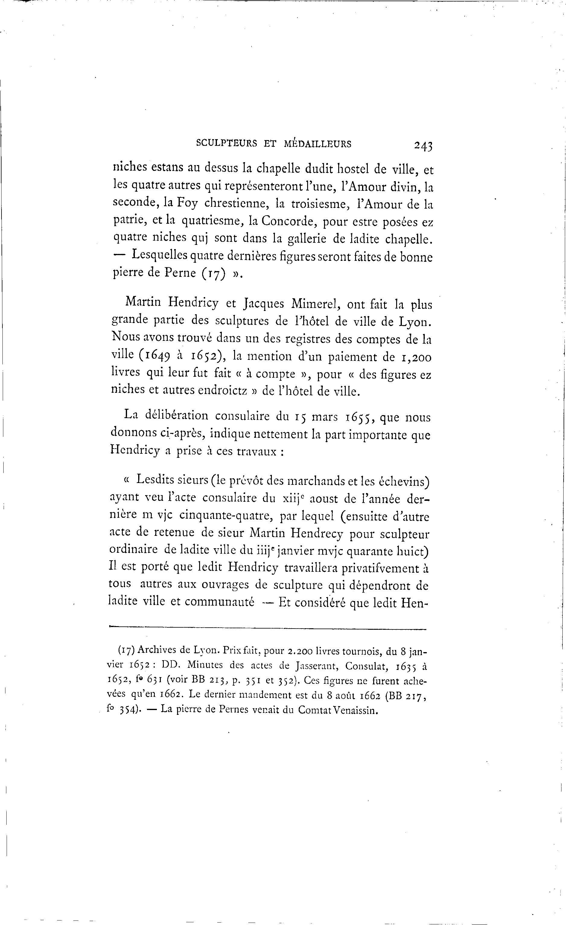 SCULPTEURS ET MÉDAILLEURS 243 niches estans au dessus la chapelle dudit hostel de ville, et les quatre autres qui représenteront l'une, l'Amour divin, la seconde, la Foy chrestienne, la troisiesme, l'Amour de la patrie, et la quatriesme, la Concorde, pour estre posées ez quatre niches quj sont dans la gallerie de ladite chapelle. — Lesquelles quatre dernières figures seront faites de bonne pierre de Perne (17) ». Martin Hendricy et Jacques Mimerel, ont fait la plus grande partie des sculptures de Fhôtel de ville de Lyon. Nous avons trouvé dans un des registres des comptes de la ville (1649 à 1652), la mention d'un paiement de 1,200 livres qui leur fut fait « à compte », pour « des figures ez niches et autres endroictz » de l'hôtel de ville. La délibération consulaire du 15 mars 1655, que nous donnons ci-après, indique nettement la part importante que Hendricy a prise à ces travaux : « Lesdits sieurs (le prévôt des marchands et les échevins) ayant veu l'acte consulaire du xiijc aoust de l'année der- nière m vjc cinquante-quatre, par lequel (ensuitte d'autre acte de retenue de sieur Martin Hendrecy pour sculpteur ordinaire de ladite ville du iiije janvier mvjc quarante huict) Il est porté que ledit Hendricy travaillera privatifvement à tous autres aux ouvrages de sculpture qui dépendront de ladite ville et communauté — Et considéré que ledit Hen- (17) Archives de Lyon. Prix fait, pour 2.200 livres tournois, du 8 jan- vier 1652 : DD. Minutes des actes de Jasserant, Consulat, 1635 à 1652, f° 631 (voir BB 213, p. 351 et 352). Ces figures ne furent ache- vées qu'en 1662. Le dernier mandement est du 8 août 1662 (BB 217, f° 354). — La pierre de Peines venait du ComtatVenaissin.