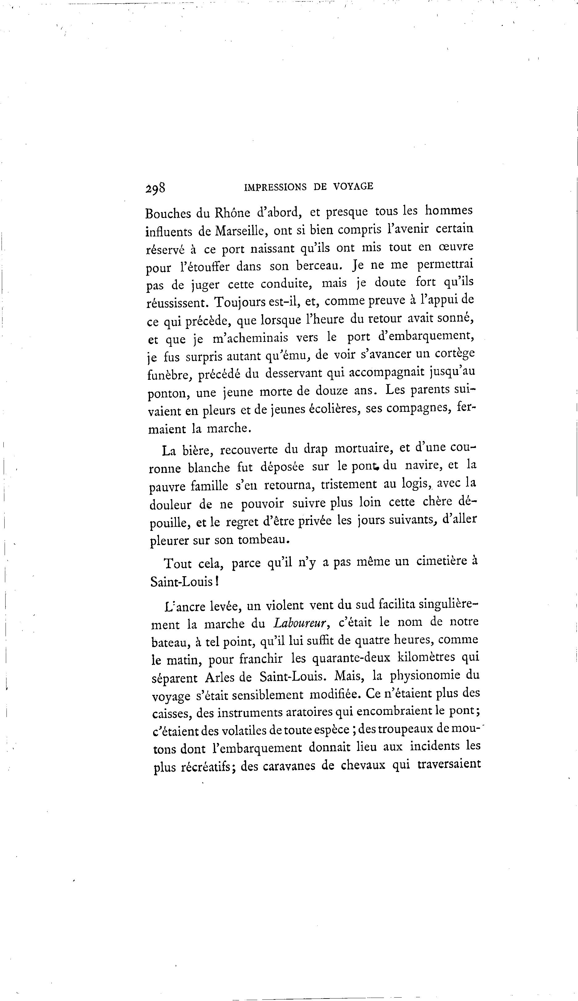 298 IMPRESSIONS DE VOYAGE Bouches du Rhône d'abord, et presque tous les hommes influents de Marseille, ont si bien compris l'avenir certain réservé à ce port naissant qu'ils ont mis tout en œuvre pour l'étouffer dans son berceau. Je ne me permettrai pas de juger cette conduite, mais je doute fort qu'ils réussissent. Toujours est-il, et, comme preuve à l'appui de ce qui précède, que lorsque l'heure du retour avait sonné, et que je m'acheminais vers le port d'embarquement, je fus surpris autant qu'ému, de voir s'avancer un cortège funèbre, précédé du desservant qui accompagnait jusqu'au ponton, une jeune morte de douze ans. Les parents sui- vaient en pleurs et de jeunes écolières, ses compagnes, fer- maient la marche. La bière, recouverte du drap mortuaire, et d'une cou- ronne blanche fut déposée sur le pont, du navire, et la pauvre famille s'en retourna, tristement au logis, avec la douleur de ne pouvoir suivre plus loin cette chère dé- pouille, et le regret d'être privée les jours suivants, d'aller pleurer sur son tombeau. Tout cela, parce qu'il n'y a pas même un cimetière à Saint-Louis ! Vancre levée, un violent vent du sud facilita singulière- ment la marche du Laboureur, c'était le nom de notre bateau, à tel point, qu'il lui suffit de quatre heures, comme le matin, pour franchir les quarante-deux kilomètres qui séparent Arles de Saint-Louis. Mais, la physionomie du voyage s'était sensiblement modifiée. Ce n'étaient plus des caisses, des instruments aratoires qui encombraient le pont ; c'étaient des volatiles de toute espèce ; des troupeaux de mou- ' tons dont l'embarquement donnait lieu aux incidents les plus récréatifs; des caravanes de chevaux qui traversaient