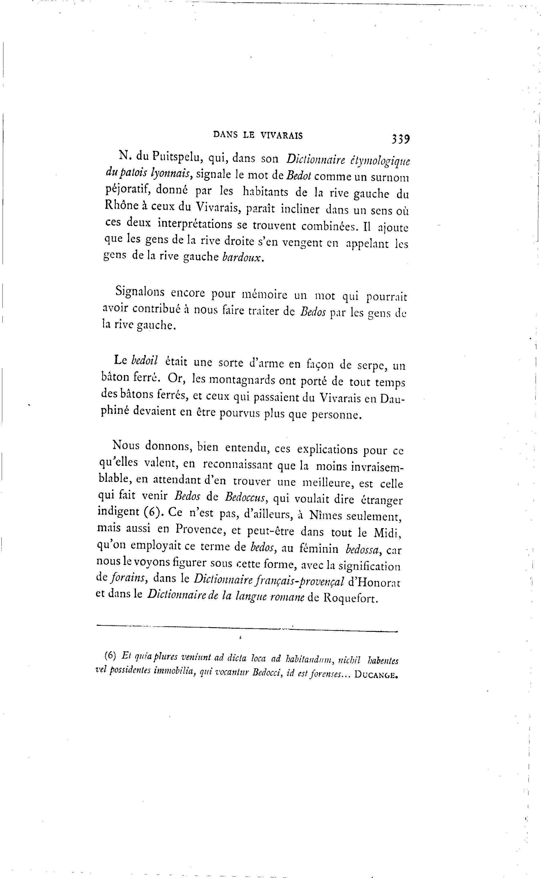 DANS LE VIVARAIS 339 N. du Puitspelu, qui, dans son Dictionnaire étymologique du patois lyonnais, signale le mot deBedot comme un surnom péjoratif, donné par les habitants de la rive gauche du Rhône à ceux du Vivarais, paraît incliner dans un sens où ces deux interprétations se trouvent combinées. Il ajoute que les gens de la rive droite s'en vengent en appelant les gens de la rive gauche bardoux. Signalons encore pour mémoire un mot qui pourrait avoir contribué à nous faire traiter de Bedos par les gens de la rive gauche. Le bedoil était une sorte d'arme en façon de serpe, un bâton ferré. Or, les montagnards ont porté de tout temps des bâtons ferrés, et ceux qui passaient du Vivarais en Dau- phiné devaient en être pourvus plus que personne. Nous donnons, bien entendu, ces explications pour ce qu'elles valent, en reconnaissant que la moins invraisem- blable, en attendant d'en trouver une meilleure, est celle qui fait venir Bedos de Bedoccus, qui voulait dire étranger indigent (6). Ce n'est pas, d'ailleurs, à Nîmes seulement, mais aussi en Provence, et peut-être dans tout le Midi, qu'on employait ce terme de bedos, au féminin bedossa, car nous le voyons figurer sous cette forme, avec la signification de forains, dans le Dictionnaire français-provençal d'Honorat et dans le Dictionnaire de la langue romane de Roquefort. (6) Et qia'aplures veniunt ad dicta toca ad hahitandum, nichil hà bentcs vet possidentes immohilia, qui vocanlur Bedocci, id est foreuses... DuCANGE.