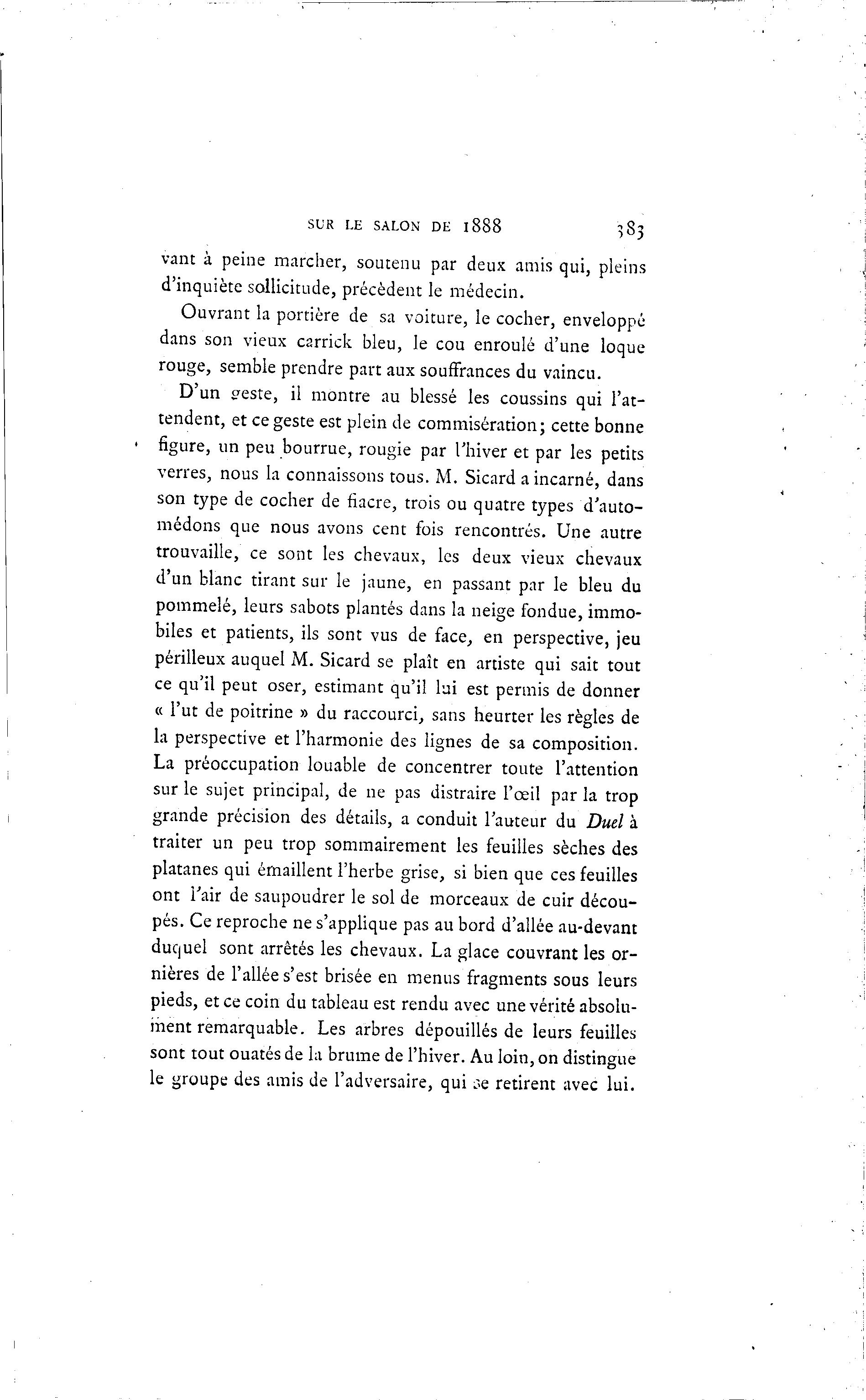 SUR LE SALON DE 18S8 ^83 vant à peine marcher, soutenu par deux amis qui, pleins d'inquiète sollicitude, précèdent le médecin. Ouvrant la portière de sa voiture, le cocher, enveloppé dans son vieux C2rrick bleu, le cou enroulé d'une loque rouge, semble prendre part aux souffrances du vaincu. D'un s'este, il montre au blessé les coussins qui l'at- tendent, et ce geste est plein de commisération; cette bonne figure, un peu bourrue, rougie par l'hiver et par les petits verres, nous la connaissons tous. M. Sicard a incarné, dans son type de cocher de fiacre, trois ou quatre types d'auto- médons que nous avons cent fois rencontrés. Une autre trouvaille, ce sont les chevaux, les deux vieux chevaux d'un blanc tirant sur le jaune, en passant par le bleu du pommelé, leurs sabots plantés dans la neige fondue, immo- biles et patients, ils sont vus de face, en perspective, jeu périlleux auquel M. Sicard se plaît en artiste qui sait tout ce qu'il peut oser, estimant qu'il lui est permis de donner « l'ut de poitrine » du raccourci, sans heurter les règles de la perspective et l'harmonie des lignes de sa composition. La préoccupation louable de concentrer toute l'attention sur le sujet principal, de ne pas distraire l'œil par la trop grande précision des détails, a conduit l'auteur du Duel à traiter un peu trop sommairement les feuilles sèches des platanes qui érnaillent l'herbe grise, si bien que ces feuilles ont l'air de saupoudrer le sol de morceaux de cuir décou- pés. Ce reproche ne s'applique pas au bord d'allée au-devant duquel sont arrêtés les chevaux. La glace couvrant les or- nières de l'allée s'est brisée en menus fragments sous leurs pieds, et ce coin du tableau est rendu avec une vérité absolu- ment remarquable. Les arbres dépouillés de leurs feuilles sont tout ouatés de la brume de l'hiver. Au loin, on distingue le groupe des amis de l'adversaire, qui se retirent avec lui.