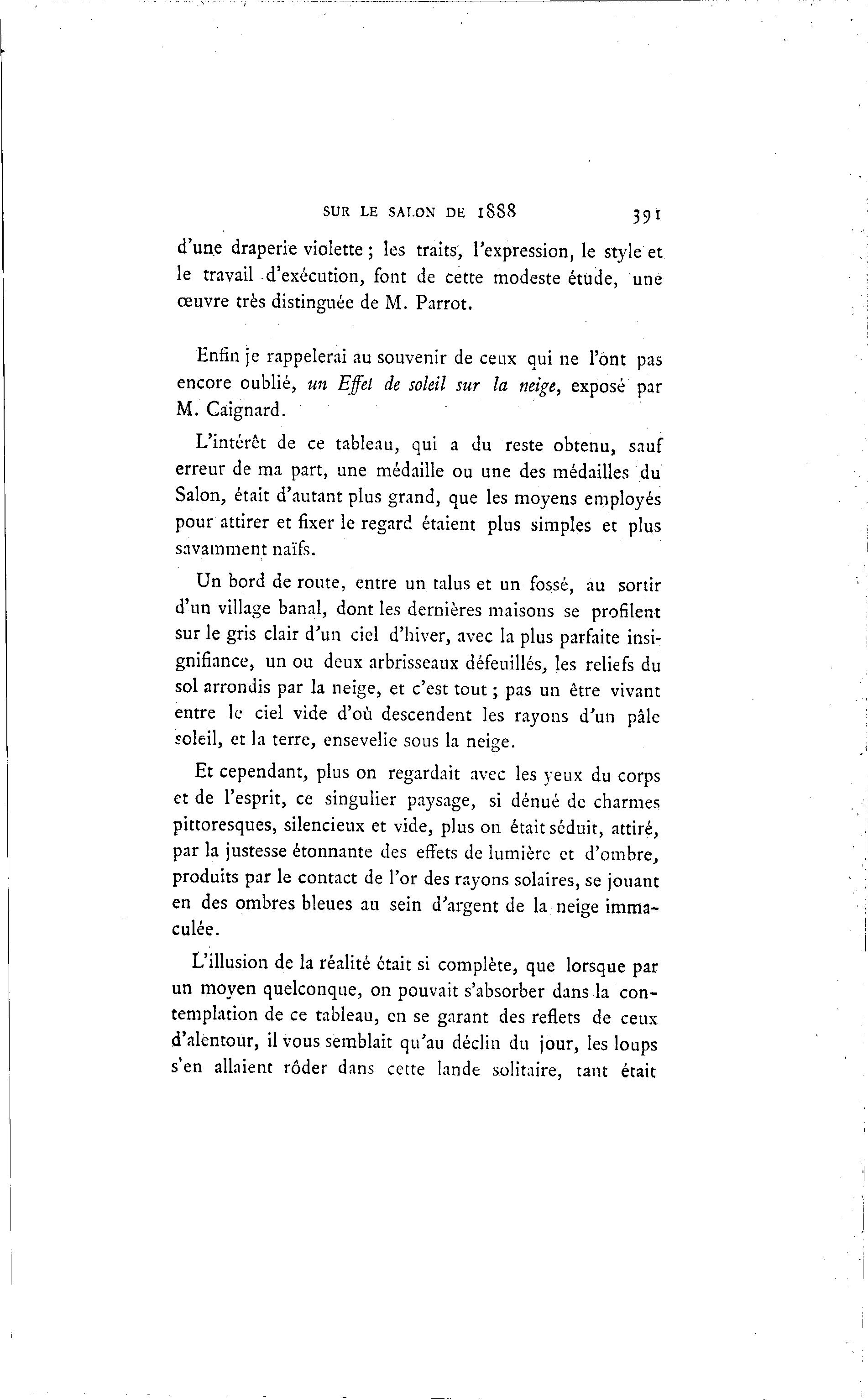 SUR LE SALON DE l 8 8 8 39 I d'une draperie violette ; les traits, l'expression, le style et le travail d'exécution, font de cette modeste étude, une œuvre très distinguée de M. Parrot. Enfin je rappelerai au souvenir de ceux qui ne l'ont pas encore oublié, un Effet de soleil sur la neige, exposé par M. Caignard. L'intérêt de ce tableau, qui a du reste obtenu, sauf erreur de ma part, une médaille ou une des médailles du Salon, était d'autant plus grand, que les moyens employés pour attirer et fixer le regard étaient plus simples et plus savamment naïfs. Un bord de route, entre un talus et un fossé, au sortir d'un village banal, dont les dernières maisons se profilent sur le gris clair d'un ciel d'hiver, avec la plus parfaite insi- gnifiance, un ou deux arbrisseaux défeuillés, les reliefs du sol arrondis par la neige, et c'est tout ; pas un être vivant entre le ciel vide d'où descendent les rayons d'un pâle soleil, et la terre, ensevelie sous la neige. Et cependant, plus on regardait avec les yeux du corps et de l'esprit, ce singulier paysage, si dénué de charmes pittoresques, silencieux et vide, plus on était séduit, attiré, par la justesse étonnante des effets de lumière et d'ombre, produits par le contact de l'or des rayons solaires, se jouant en des ombres bleues au sein d'argent de la neige imma- culée. L'illusion de la réalité était si complète, que lorsque par un moyen quelconque, on pouvait s'absorber dans la con- templation de ce tableau, en se garant des reflets de ceux d'alentour, il vous semblait qu'au déclin du jour, les loups s'en allaient rôder dans cette lande solitaire, tant était