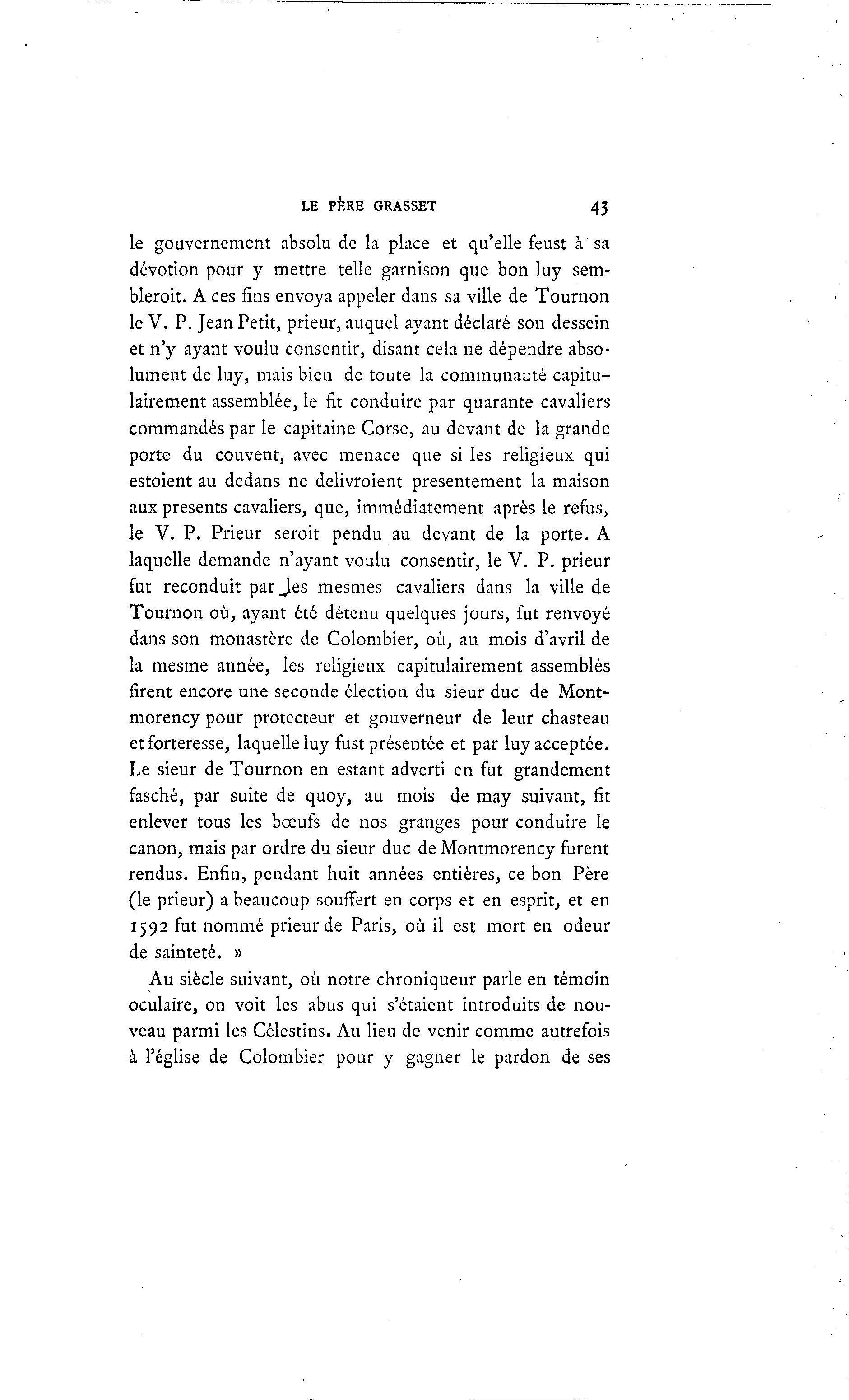 LE PERE GRASSET 43 le gouvernement absolu de la place et qu'elle feust à sa dévotion pour y mettre telle garnison que bon luy sem- blerait. A ces fins envoya appeler dans sa ville de Tournon le V. P. Jean Petit, prieur, auquel ayant déclaré son dessein et n'y ayant voulu consentir, disant cela ne dépendre abso- lument de luy, mais bien de toute la communauté capitu- lairement assemblée, le fit conduire par quarante cavaliers commandés par le capitaine Corse, au devant de la grande porte du couvent, avec menace que si les religieux qui estoient au dedans ne délivraient présentement la maison aux présents cavaliers, que, immédiatement après le refus, le V. P. Prieur serait pendu au devant de la porte. A laquelle demande n'ayant voulu consentir, le V. P. prieur fut reconduit par Jes mesmes cavaliers dans la ville de Tournon où, ayant été détenu quelques jours, fut renvoyé dans son monastère de Colombier, où, au mois d'avril de la mesme année, les religieux capitulairement assemblés firent encore une seconde élection du sieur duc de Mont- morency pour protecteur et gouverneur de leur chasteau et forteresse, laquelle luy fust présentée et par luy acceptée. Le sieur de Tournon en estant adverti en fut grandement fasché, par suite de quoy, au mois de may suivant, fit enlever tous les bœufs de nos granges pour conduire le canon, mais par ordre du sieur duc de Montmorency furent rendus. Enfin, pendant huit années entières, ce bon Père (le prieur) a beaucoup souffert en corps et en esprit, et en 1592 fut nommé prieur de Paris, où il est mort en odeur de sainteté. » Au siècle suivant, où notre chroniqueur parle en témoin oculaire, on voit les abus qui s'étaient introduits de nou- veau parmi les Célestins. Au lieu de venir comme autrefois à l'église de Colombier pour y gagner le pardon de ses