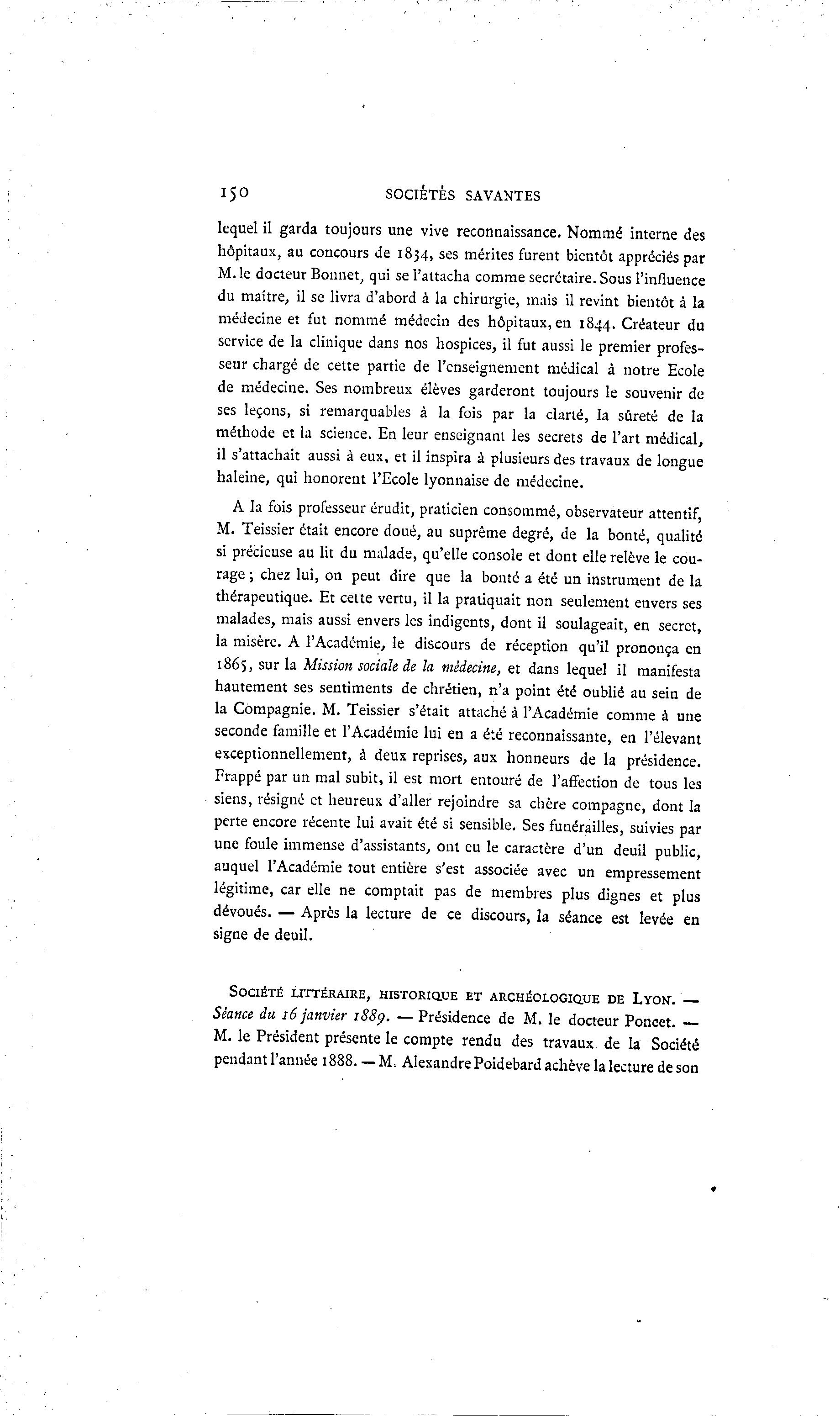150 SOCIÉTÉS SAVANTES lequel il garda toujours une vive reconnaissance. Nommé interne des hôpitaux, au concours de 1834, ses mérites furent bientôt appréciés par M. le docteur Bonnet, qui se l'attacha comme secrétaire. Sous l'influence du maître, il se livra d'abord à la chirurgie, mais il revint bientôt à la médecine et fut nommé médecin des hôpitaux, en 1844. Créateur du service de la clinique dans nos hospices, il fut aussi le premier profes- seur chargé de cette partie de l'enseignement médical à notre Ecole de médecine. Ses nombreux élèves garderont toujours le souvenir de ses leçons, si remarquables à la fois par la clarté, la sûreté de la méthode et la science. En leur enseignant les secrets de l'art médical, il s'attachait aussi à eux, et il inspira à plusieurs des travaux de longue haleine, qui honorent l'Ecole lyonnaise de médecine. A la fois professeur érudit, praticien consommé, observateur attentif, M. Teissier était encore doué, au suprême degré, de la bonté, qualité si précieuse au lit du malade, qu'elle console et dont elle relève le cou- rage ; chez lui, on peut dire que la bonté a été un instrument de la thérapeutique. Et cette vertu, il la pratiquait non seulement envers ses malades, mais aussi envers les indigents, dont il soulageait, en secret, la misère. A l'Académie, le discours de réception qu'il prononça en 1865, sur la Mission sociale de la médecine, et dans lequel il manifesta hautement ses sentiments de chrétien, n'a point été oublié au sein de la Compagnie. M. Teissier s'était attaché à l'Académie comme à une seconde famille et l'Académie lui en a été reconnaissante, en l'élevant exceptionnellement, à deux reprises, aux honneurs de la présidence. Frappé par un mal subit, il est mort entouré de l'affection de tous les siens, résigné et heureux d'aller rejoindre sa chère compagne, dont la perte encore récente lui avait été si sensible. Ses funérailles, suivies par une foule immense d'assistants, ont eu le caractère d'un deuil public, auquel l'Académie tout entière s'est associée avec un empressement légitime, car elle ne comptait pas de membres plus dignes et plus dévoués. — Après la lecture de ce discours, la séance est levée en signe de deuil. SOCIÉTÉ LITTÉRAIRE, HISTORIQUE ET ARCHÉOLOGIQUE DE LYON'. — Séance du 16 janvier 1889. — Présidence de M. le docteur Poncet. — M. le Président présente le compte rendu des travaux de la Société pendant l'année 1888. — M, Alexandre Poidebard achève la lecture de son