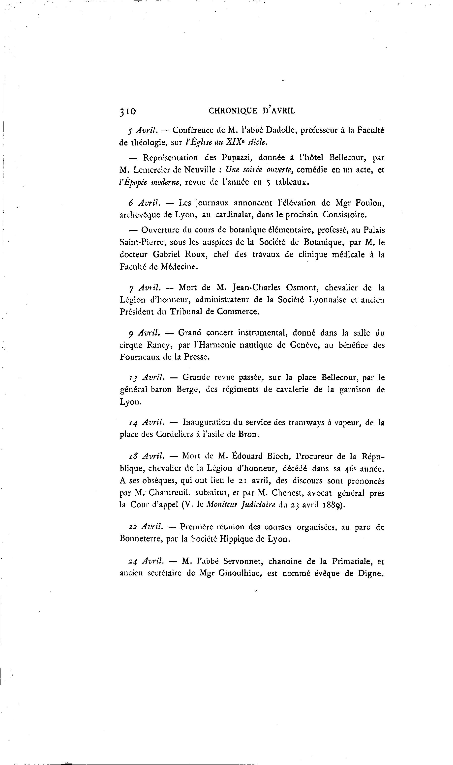 310 CHRONIQUE D'AVRIL / Avril. — Conférence de M. l'abbé Dadolle, professeur à la Faculté de théologie, sur l'Église au XIX' siècle. — Représentation des Pupazzi, donnée à l'hôtel Bellecour, par M. Lemercier de Neuville : Une soirée ouverte, comédie en un acte, et l'Épopée moderne, revue de l'année en 5 tableaux. 6 Avril. — Les journaux annoncent l'élévation de Mgr Foulon, archevêque de Lyon, au cardinalat, dans le prochain Consistoire. — Ouverture du cours de botanique élémentaire, professé, au Palais Saint-Pierre, sous les auspices de la Société de Botanique, par M. le docteur Gabriel Roux, chef des travaux de clinique médicale à la Faculté de Médecine. 7 Avtil. — Mort de M. Jean-Charles Osmont, chevalier de la Légion d'honneur, administrateur de la Société Lyonnaise et ancien Président du Tribunal de Commerce. 9 Avril. — Grand concert instrumental, donné dans la salle du cirque Rancy, par l'Harmonie nautique de Genève, au bénéfice des Fourneaux de la Presse. i j Avril. — Grande revue passée, sur la place Bellecour, par le général baron Berge, des régiments de cavalerie de la garnison de Lyon. 14 Avril. — Inauguration du service des tramways à vapeur, de la place des Cordeliers à l'asile de Bron. 18 Avril. — Mort de M. Edouard Bloch, Procureur de la Répu- blique, chevalier de la Légion d'honneur, décédé dans sa 46= année. A ses obsèques, qui ont lieu le 21 avril, des discours sont prononcés par M. Chantreuil, substitut, et par M. Chenest, avocat général près la Cour d'appel (V. le Moniteur judiciaire du 23 avril 18S9). 22 Avril. — Première réunion des courses organisées, au parc de Bonneterre, par la Société Hippique de Lyon. 24 Avril. — M. l'abbé Servonnet, chanoine de la Primatiale, et ancien secrétaire de Mgr Ginoulhiac, est nommé évêque de Digne.