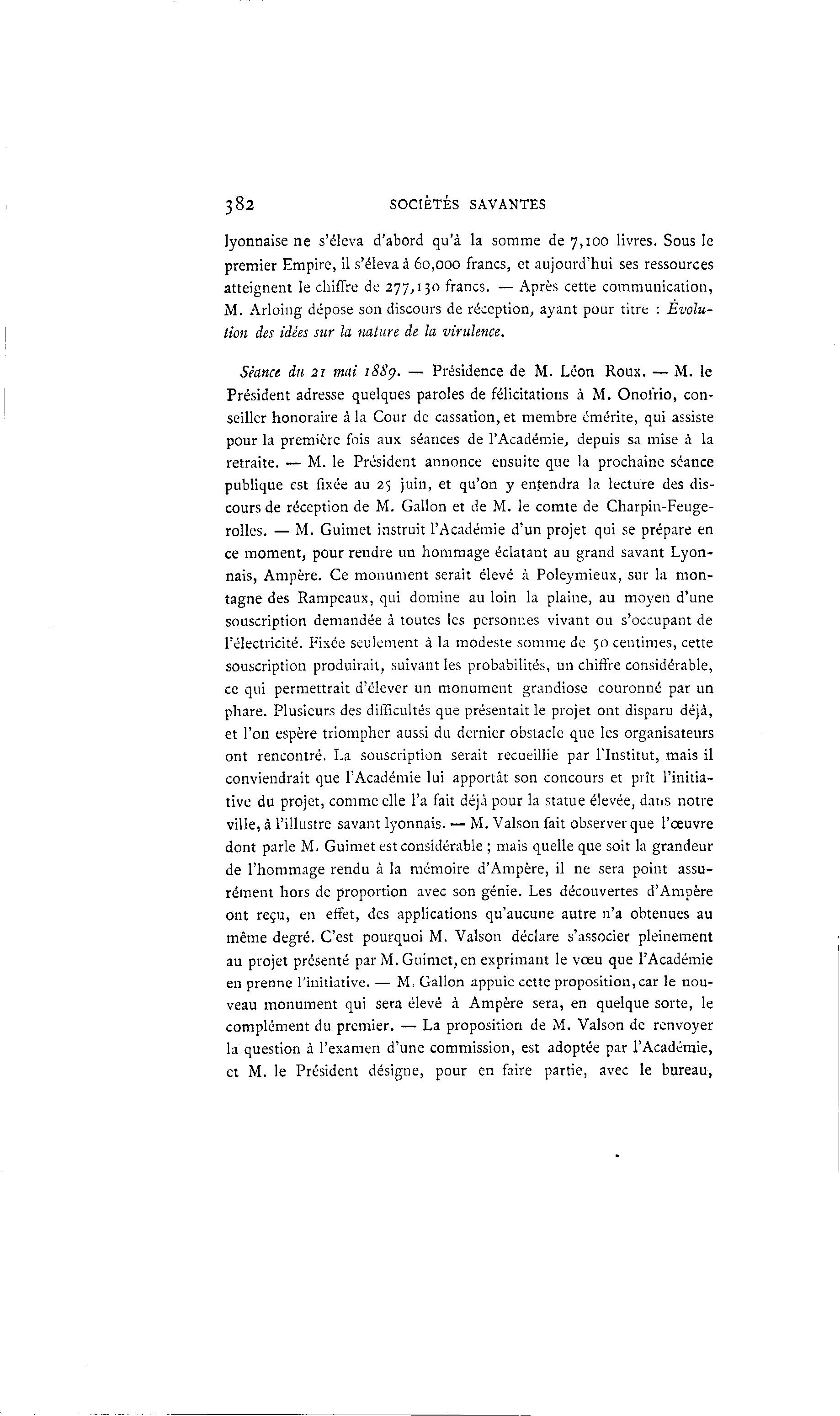 382 SOCIÉTÉS SAVANTES lyonnaise ne s'éleva d'abord qu'à la somme de 7,100 livres. Sous le premier Empire, il s'éleva à 60,000 francs, et aujourd'hui ses ressources atteignent le chiffre de 277,130 francs. — Après cette communication, M. Arloing dépose son discours de réception, ayant pour titre : Evolu- tion des idées sur la nature de la virulence. Séance du 21 mai 1S89. — Présidence de M. Léon Roux. — M. le Président adresse quelques paroles de félicitations à M. Onofrio, con- seiller honoraire à la Cour de cassation, et membre émérite, qui assiste pour la première fois aux séances de l'Académie, depuis sa mise à la retraite. — M. le Président annonce ensuite que la prochaine séance publique est fixée au 25 juin, et qu'on y entendra la lecture des dis- cours de réception de M. Gallon et de M. le comte de Charpin-Feuge- rolles. — M. Guimet instruit l'Académie d'un projet qui se prépare en ce moment, pour rendre un hommage éclatant au grand savant Lyon- nais, Ampère. Ce monument serait élevé à Poleymieux, sur la mon- tagne des Rampeaux, qui domine au loin la plaine, au moyen d'une souscription demandée à toutes les personnes vivant ou s'occupant de l'électricité. Fixée seulement à la modeste somme de 50 centimes, cette souscription produirait, suivant les probabilités, un chiffre considérable, ce qui permettrait d'élever un monument grandiose couronné par un phare. Plusieurs des difficultés que présentait le projet ont disparu déjà , et l'on espère triompher aussi du dernier obstacle que les organisateurs ont rencontré. La souscription serait recueillie par l'Institut, mais il conviendrait que l'Académie lui apportât son concours et prît l'initia- tive du projet, comme elle l'a fait déjà pour la statue élevée, dans notre ville, à l'illustre savant lyonnais. — M. Valson fait observer que l'œuvre dont parle M. Guimet est considérable ; mais quelle que soit la grandeur de l'hommage rendu à la mémoire d'Ampère, il ne sera point assu- rément hors de proportion avec son génie. Les découvertes d'Ampère ont reçu, en effet, des applications qu'aucune autre n'a obtenues au même degré. C'est pourquoi M. Valson déclare s'associer pleinement au projet présenté par M. Guimet, en exprimant le vœu que l'Académie en prenne l'initiative. — M. Gallon appuie cette proposition,car le nou- veau monument qui sera élevé à Ampère sera, en quelque sorte, le complément du premier. — La proposition de M. Valson de renvoyer la question à l'examen d'une commission, est adoptée par l'Académie, et M. le Président désigne, pour en faire partie, avec le bureau,
