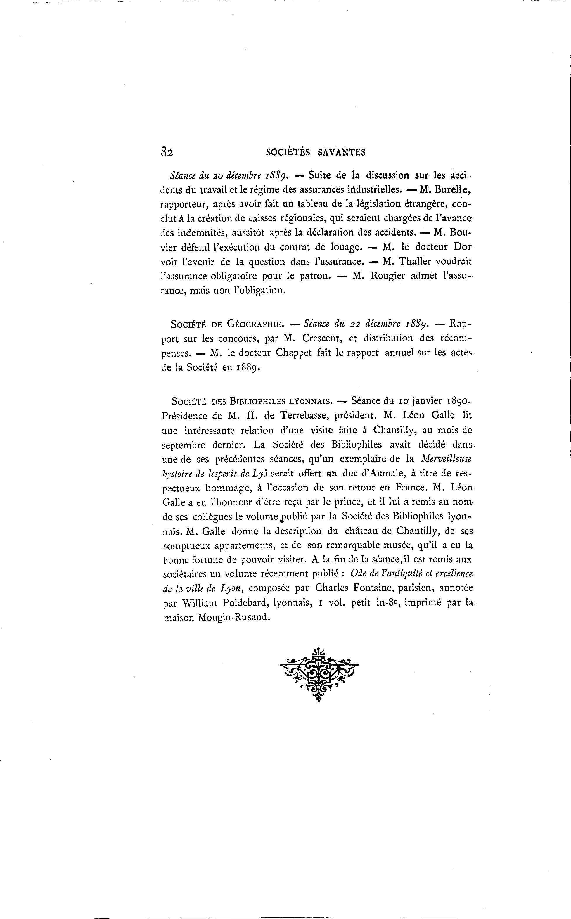82 SOCIÉTÉS SAVANTES Séance du 20 décembre 1S89. — Suite de la discussion sur les acci- dents du travail et le régime des assurances industrielles. — M. Burelle, rapporteur, après avoir fait un tableau de la législation étrangère, con- clut à la création de caisses régionales, qui seraient chargées de l'avance des indemnités, aussitôt après la déclaration des accidents. — M. Bou- vier défend l'exécution du contrat de louage. — M. le docteur D o r voit l'avenir de la question dans l'assurance. — M. Thaller voudrait l'assurance obligatoire pour le patron. — M. RoUgier admet l'assu- rance, mais non l'obligation. SOCIÉTÉ DE GÉOGRAPHIE. — Séance du 22 décembre 18S9. — Rap- port sur les concours, par M. Crescent, et distribution des récom- penses. — M. le docteur Chappet fait le rapport annuel sur les actes, de la Société en 1889. SOCIÉTÉ DES BIBLIOPHILES LYONNAIS. — Séance du 10 janvier 1890. Présidence de M. H. de Terrebasse, président. M. Léon Galle lit une intéressante relation d'une visite faite à Chantilly, au mois de septembre dernier. La Société des Bibliophiles avait décidé dans une de ses précédentes séances, qu'un exemplaire de la Merveilleuse hystoire de Usperit de Lyo serait offert au duc d'Aumale, à titre de res- pectueux hommage, à l'occasion de son retour en France. M. Léon Galle a eu l'honneur d'être reçu par le prince, et il lui a remis au nom- de ses collègues le volume publié par la Société des Bibliophiles lyon- nais. M. Galle donne la description du château de Chantilly, de ses somptueux appartements, et de son remarquable musée, qu'il a eu la bonne fortune de pouvoir visiter. A la fin de la séance.il est remis aux sociétaires un volume récemment publié : Ode de l'antiquité et excellence de la ville de Lyon, composée par Charles Fontaine, parisien, annotée par William Poidebard, lyonnais, 1 vol. petit in-8°, imprimé par la. maison Mougin-Rusand.