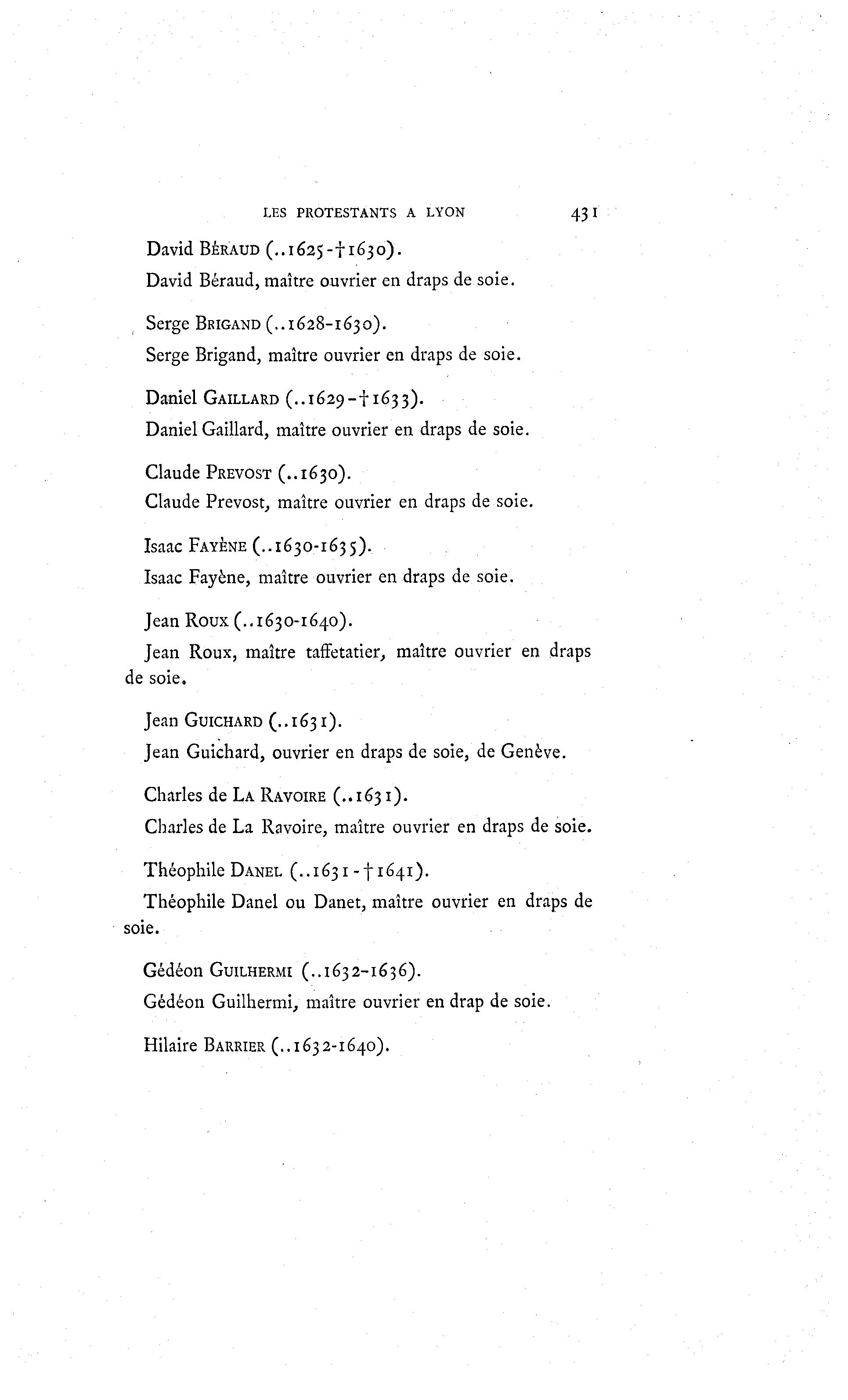 LES PROTESTANTS A LYON 43I David BÉRAUD (..1625-f 1630). David Béraud, maître ouvrier en draps de soie. Serge BRIGAND (..1628-1630). Serge Brigand, maître ouvrier en draps de soie. Daniel GAILLARD (..1629-11633). Daniel Gaillard, maître ouvrier en draps de soie. Claude PRÉVOST (..1630). Claude Prévost, maître ouvrier en draps de soie. Isaac FAYÈNE (..1630-163 5). Isaac Fayène, maître ouvrier en draps de soie. Jean Roux (..1630-1640). Jean Roux, maître taffetatier, maître ouvrier en draps de soie. Jean GUICHARD (..1631). Jean Guichard, ouvrier en draps de soie, de Genève. Charles de LA RAVOIRE (..163 I). Charles de La Ravoire, maître ouvrier en draps de soie. Théophile DANEL (..1631-11641). Théophile Danel ou Danet, maître ouvrier en draps de soie. Gédéon GUILHERMI (..1632-1636). Gédéon Guilhermi, maître ouvrier en drap de soie. Hilaire BARRIER (..1632-1640).