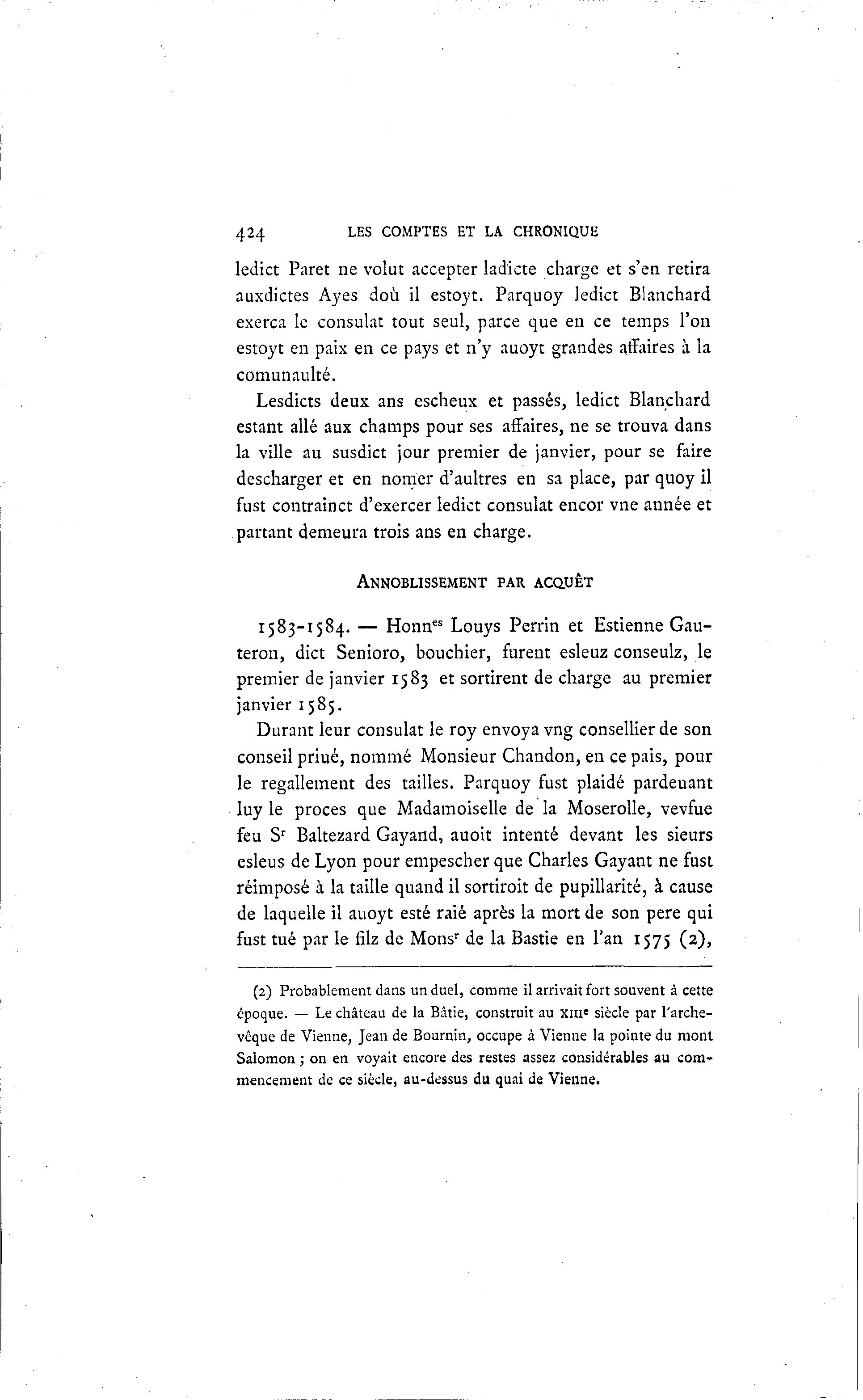 424 LES COMPTES ET LA CHRONIQUE ledict Paret ne volut accepter ladicte charge et s'en retira auxdictes Ayes doù il estoyt. Parquoy ledict Blanchard exerça le consulat tout seul, parce que en ce temps l'on estoyt en paix en ce pays et n'y auoyt grandes affaires à la comunaulté. Lesdicts deux ans escheux et passés, ledict Blanchard estant allé aux champs pour ses affaires, ne se trouva dans la ville au susdict jour premier de janvier, pour se faire descharger et en nomer d'aultres en sa place, par quoy il fust contrainct d'exercer ledict consulat encor vne année et partant demeura trois ans en charge. ANNOBLISSEMENT PAR ACQUÊT I583-1584- — Honn es Louys Perrin et Estienne Gau- teron, dict Senioro, bouchier, furent esleuz conseulz, le premier de janvier 1583 et sortirent de charge au premier janvier 1585. Durant leur consulat le roy envoya vng consellier de son conseil priué, nommé Monsieur Chandon, en ce pais, pour le regallement des tailles. Parquoy fust plaidé pardeuant luy le procès que Madamoiselle de la Moserolle, vevfue feu Sr Baltezard Gayand, auoit intenté devant les sieurs esleus de Lyon pour empescher que Charles Gayant ne fust réimposé à la taille quand il sortirait de pupillarité, à cause de laquelle il auoyt esté raie après la mort de son père qui fust tué par le filz de Monsr de la Bastie en l'an 1575 (2), (2) Probablement dans un duel, comme il arrivait fort souvent à cette époque. — Le château de la Bâtie, construit au m i ' siècle par l'arche- vêque de Vienne, Jean de Bournin, occupe à Vienne la pointe du mont Salomon ; on en voyait encore des restes assez considérables au com- mencement de ce siècle, au-dessus du quai de Vienne.
