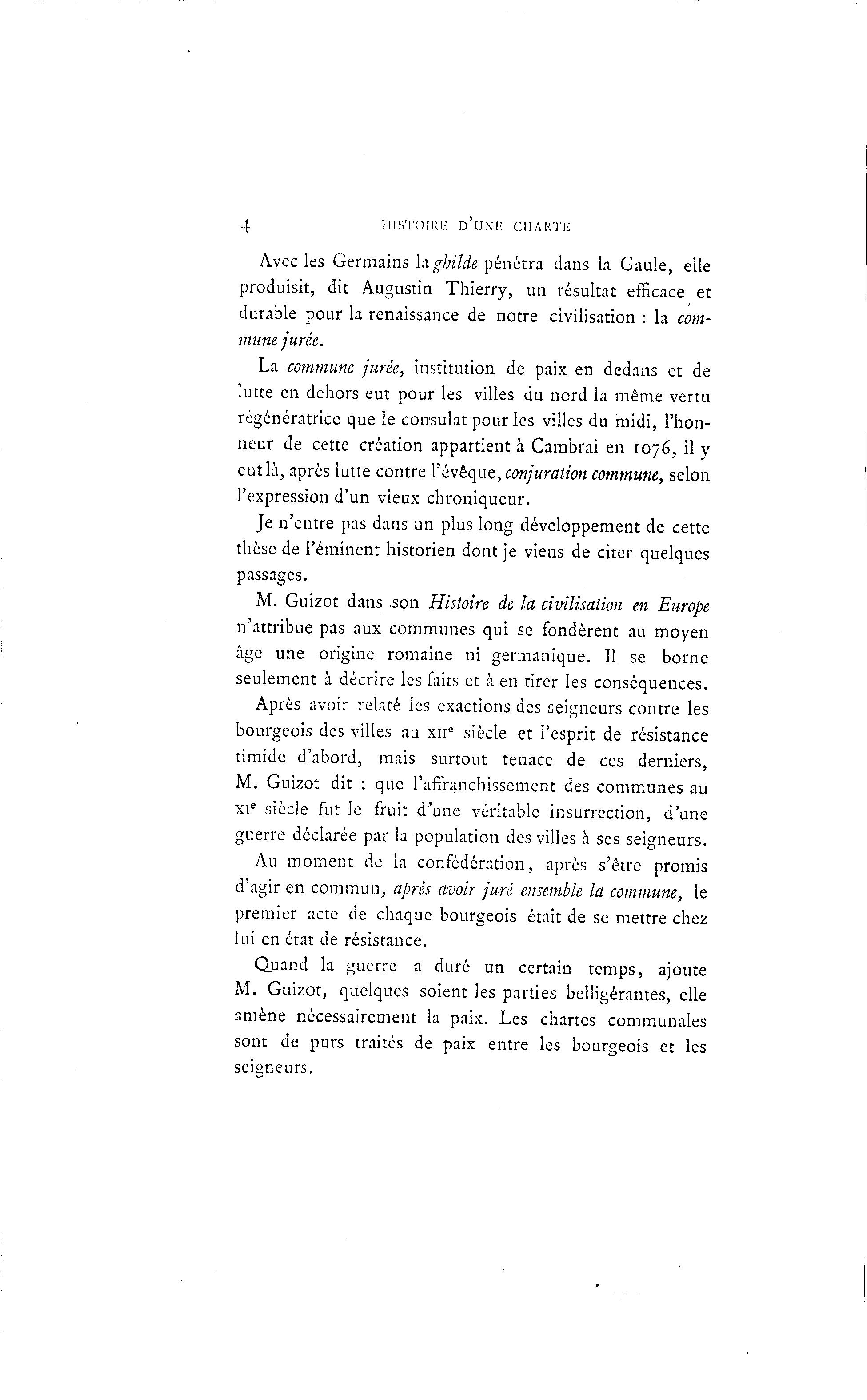 4 HISTOIRE D'UNI-: CIIAKTIi Avec les Germains la ghilde pénétra dans la Gaule, elle produisit, dit Augustin Thierry, un résultat efficace et durable pour la renaissance de notre civilisation : la com- mune jurée. La commune jurée, institution de paix en dedans et de lutte en dehors eut pour les villes du nord la même vertu régénératrice que le consulat pour les villes du midi, l'hon- neur de cette création appartient à Cambrai en 1076, il y eut là , après lutte contre l'évêque, conjuration commune, selon l'expression d'un vieux chroniqueur. Je n'entre pas dans un plus long développement de cette thèse de l'éminent historien dont je viens de citer quelques passages. M. Guizot dans .son Histoire de la civilisation en Europe n'attribue pas aux communes qui se fondèrent au moyen âge une origine romaine ni germanique. Il se borne seulement à décrire les faits et à en tirer les conséquences. Après avoir relaté les exactions des seigneurs contre les bourgeois des villes au xn e siècle et l'esprit de résistance timide d'abord, mais surtout tenace de ces derniers, M. Guizot dit : que l'affranchissement des communes au xie siècle fut le fruit d'une véritable insurrection, d'une guerre déclarée par la population des villes à ses seigneurs. Au moment de la confédération, après s'être promis d'agir en commun, après avoir juré ensemble la commune, le premier acte de chaque bourgeois était de se mettre chez lui en état de résistance. Quand la guerre a duré un certain temps, ajoute M. Guizot, quelques soient les parties belligérantes, elle amène nécessairement la paix. Les chartes communales sont de purs traités de paix entre les bourgeois et les seigneurs.