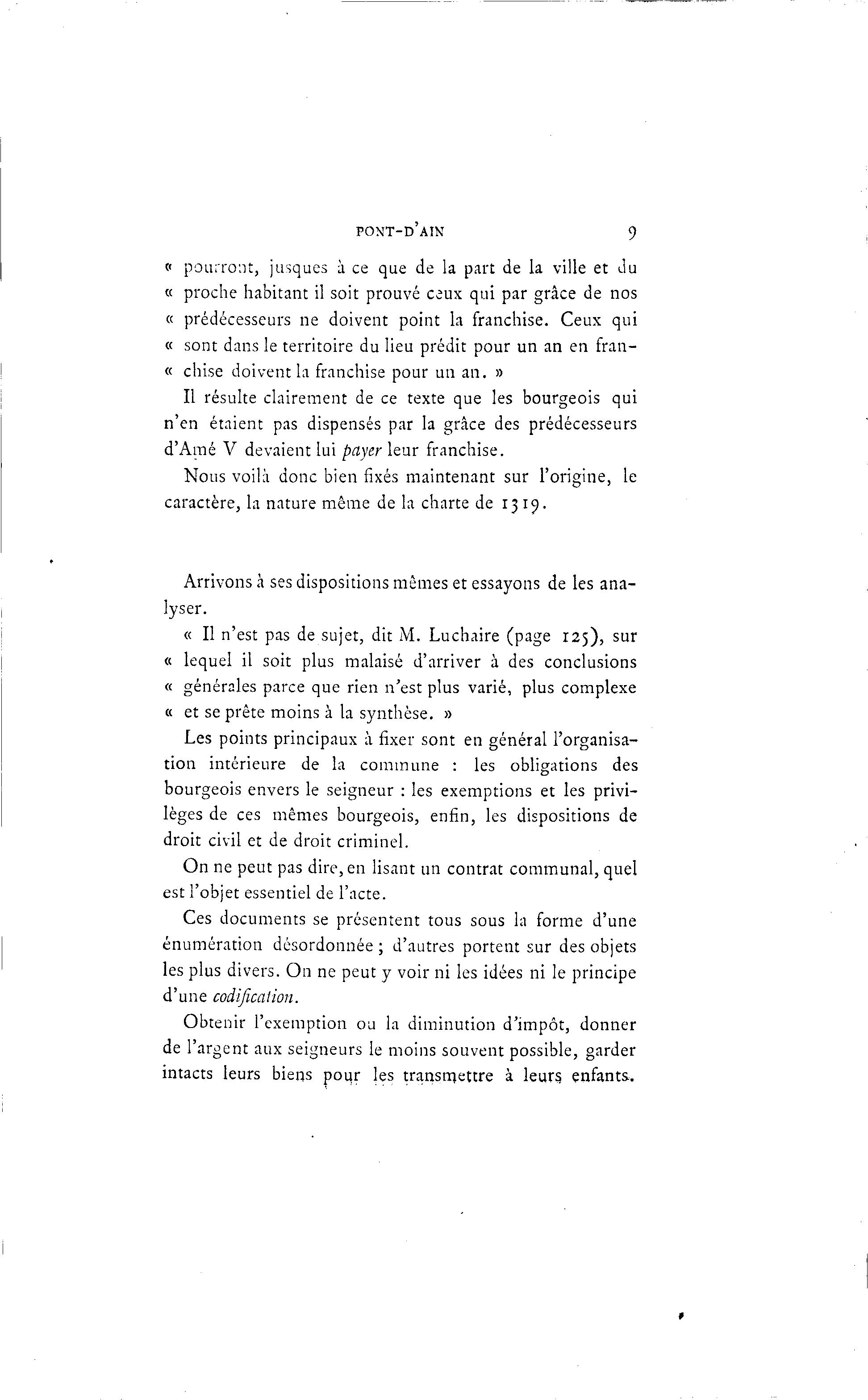 PONT-D'AIN 9 « pourront, jusques à ce que de la part de la ville et du « proche habitant il soit prouvé ceux qui par grâce de nos « prédécesseurs ne doivent point la franchise. Ceux qui « sont dans le territoire du lieu prédit pour un an en fran- « chise doivent la franchise pour un an. » Il résulte clairement de ce texte que les bourgeois qui n'en étaient pas dispensés par la grâce des prédécesseurs d'Ame V devaient lui payer leur franchise. Nous voilà donc bien fixés maintenant sur l'origine, le caractère, la nature même de la charte de 13 19. Arrivons à ses dispositions mêmes et essayons de les ana- lyser. « Il n'est pas de sujet, dit M. Luchaire (page 125), sur « lequel il soit plus malaisé d'arriver à des conclusions « générales parce que rien n'est plus varié, plus complexe « et se prête moins à la synthèse. » Les points principaux à fixer sont en général l'organisa- tion intérieure de la commune : les obligations des bourgeois envers le seigneur : les exemptions et les privi- lèges de ces mêmes bourgeois, enfin, les dispositions de droit civil et de droit criminel. On ne peut pas dire, en lisant un contrat communal, quel est l'objet essentiel de l'acte. Ces documents se présentent tous sous la forme d'une énumération désordonnée ; d'autres portent sur des objets les plus divers. On ne peut y voir ni les idées ni le principe d'une codification. Obtenir l'exemption ou la diminution d'impôt, donner de l'argent aux seigneurs le moins souvent possible, garder intacts leurs biens pour les transrnettre à leurs enfants.