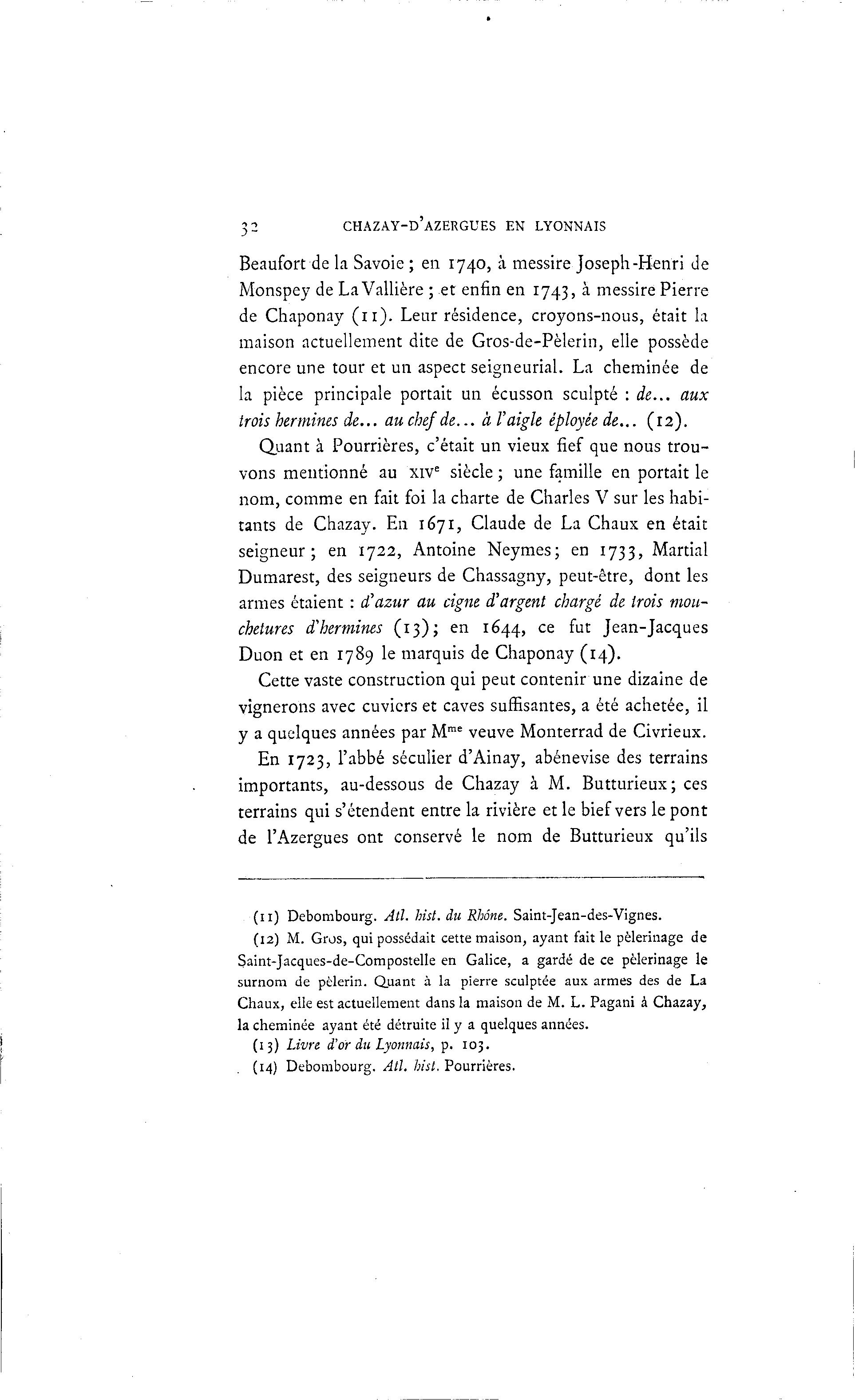 32 CHAZAY-D'AZERGUES EN LYONNAIS Beaufort de la Savoie ; en 1740, à messire Joseph-Henri de Monspey de La Vallière ; et enfin en 1743, à messire Pierre de Chaponay ( n ) . Leur résidence, croyons-nous, était la maison actuellement dite de Gros-de-Pèlerin, elle possède encore une tour et un aspect seigneurial. La cheminée de la pièce principale portait un écusson sculpté : de... aux trois hermines de... auchefde... à l'aigle éployéede... (12). Quant à Pourrières, c'était un vieux fief que nous trou- vons mentionné au xivE siècle ; une famille en portait le nom, comme en fait foi la charte de Charles V sur les habi- tants de Chazay. En 1671, Claude de La Chaux en était seigneur; en 1722, Antoine Neymes; en 1733, Martial Dumarest, des seigneurs de Chassagny, peut-être, dont les armes étaient : d'azur au cigne d'argent chargé de trois mou- chetures d'hermines ( 1 3 ) ; en 1644, ce fut Jean-Jacques Duon et en 1789 le marquis de Chaponay (14). Cette vaste construction qui peut contenir une dizaine de vignerons avec cuvicrs et caves suffisantes, a été achetée, il y a quelques années par Mme veuve Monterrad de Civrieux. En 1723, l'abbé séculier d'Ainay, abénevise des terrains importants, au-dessous de Chazay à M. Butturieux; ces terrains qui s'étendent entre la rivière et le bief vers le pont de l'Azergues ont conservé le nom de Butturieux qu'ils (11) Debombourg. Att. hist. du Rhône. Saint-Jean-des-Vignes. (12) M. Gros, qui possédait cette maison, ayant fait le pèlerinage de Saint-Jacques-de-Compostelle en Galice, a gardé de ce pèlerinage le surnom de pèlerin. Quant à la pierre sculptée aux armes des de La Chaux, elle est actuellement dans la maison de M. L. Pagani à Chazay, la cheminée ayant été détruite il y a quelques années. (13) Livre d'or du Lyonnais, p. 103. (14) Debombourg. AU. hist. Pourrières.