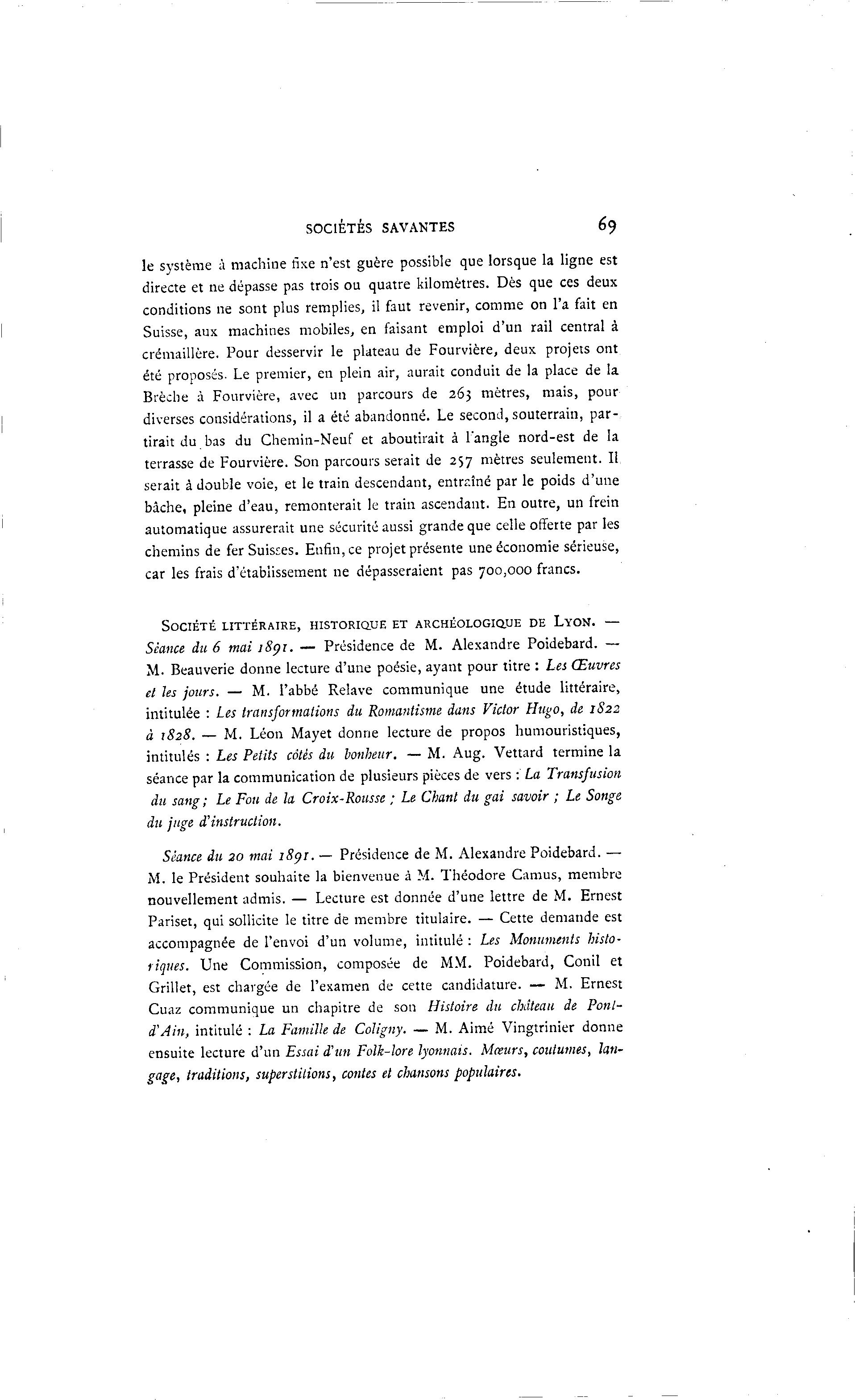 SOCIÉTÉS SAVANTES 69 le système à machine fixe n'est guère possible que lorsque la ligne est directe et ne dépasse pas trois ou quatre kilomètres. Dès que ces deux conditions ne sont plus remplies, il faut revenir, comme on l'a fait en Suisse, aux machines mobiles, en faisant emploi d'un rail central à crémaillère. Pour desservir le plateau de Fourvière, deux projets ont été proposés. Le premier, en plein air, aurait conduit de la place de la Brèche à Fourvière, avec un parcours de 263 mètres, mais, pour diverses considérations, il a été abandonné. Le second, souterrain, par- tirait du bas du Chemin-Neuf et aboutirait à l'angle nord-est de la terrasse de Fourvière. Son parcours serait de 257 mètres seulement. Il serait à double voie, et le train descendant, entraîné par le poids d'une bâche, pleine d'eau, remonterait le train ascendant. En outre, un frein automatique assurerait une sécurité aussi grande que celle offerte par les chemins de fer Suisses. Enfin, ce projet présente une économie sérieuse, car les frais d'établissement ne dépasseraient pas 700,000 francs. SOCIÉTÉ LITTÉRAIRE, HISTORIQUE ET ARCHÉOLOGIQUE DE LYON. — Séance du 6 mai 1891. — Présidence de M. Alexandre Poidebard. — M. Beauverie donne lecture d'une poésie, ayant pour titre : Les Œuvres et les jours. — M. l'abbé Relave communique une étude littéraire, intitulée : Les transformations du Romantisme dans Victor Hugo, de 1S22 à 1828. — M. Léon Mayet donne lecture de propos humouristiques, intitulés : Les Petits côtés du bonheur. — M. Aug. Vettard termine la séance par la communication de plusieurs pièces de vers : La Transfusion du sang ; Le Fou de la Croix-Rousse ; Le Chant du gai savoir ; Le Songe du juge d'instruction. Séance du 20 mai 1891. — Présidence de M. Alexandre Poidebard. — M. le Président souhaite la bienvenue à M. Théodore Camus, membre nouvellement admis. — Lecture est donnée d'une lettre de M. Ernest Pariset, qui sollicite le titre de membre titulaire. — Cette demande est accompagnée de l'envoi d'un volume, intitulé : Les Monuments histo- riques. Une Commission, composée de MM. Poidebard, Conil et Griller, est chargée de l'examen de cette candidature. — M. Ernest Cuaz communique un chapitre de son Histoire du château de Ponl- à " Ain, intitulé : La Famille de Coligny. — M. Aimé Vingtrinier donne ensuite lecture d'un Essai d'un Folk-lore lyonnais. Mœurs, coutumes, lan- gage, traditions, superstitions, contes et chansons populaires.