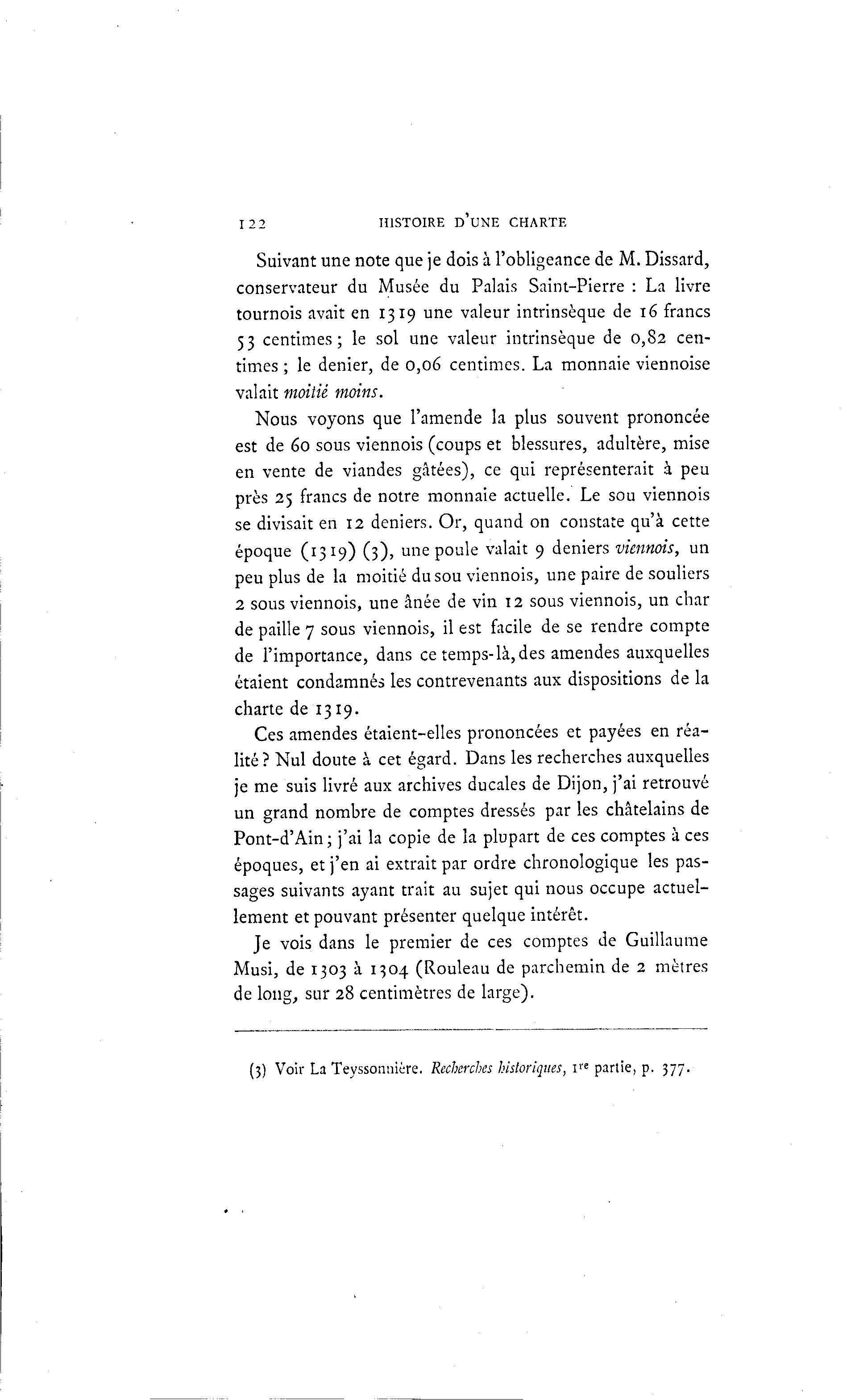 122 HISTOIRE D'UNE CHARTE Suivant une note que je dois à l'obligeance de M. Dissard, conservateur du Musée du Palais Saint-Pierre : La livre tournois avait en 1319 une valeur intrinsèque de 16 francs 53 centimes; le sol une valeur intrinsèque de 0,82 cen- times ; le denier, de 0,06 centimes. La monnaie viennoise valait moitié moins. Nous voyons que l'amende la plus souvent prononcée est de 60 sous viennois (coups et blessures, adultère, mise en vente de viandes gâtées), ce qui représenterait à peu près 25 francs de notre monnaie actuelle. Le sou viennois se divisait en 12 deniers. Or, quand on constate qu'à cette époque (1319) (3), une poule valait 9 deniers viennois, un peu plus de la moitié du sou viennois, une paire de souliers 2 sous viennois, une ânée de vin 12 sous viennois, un char de paille 7 sous viennois, il est facile de se rendre compte de l'importance, dans ce temps-là , des amendes auxquelles étaient condamnés les contrevenants aux dispositions de la charte de 1319. Ces amendes étaient-elles prononcées et payées en réa- lité? Nul doute à cet égard. Dans les recherches auxquelles je me suis livré aux archives ducales de Dijon, j'ai retrouvé un grand nombre de comptes dressés par les châtelains de Pont-d'Ain; j'ai la copie de la plupart de ces comptes à ces époques, et j'en ai extrait par ordre chronologique les pas- sages suivants ayant trait au sujet qui nous occupe actuel- lement et pouvant présenter quelque intérêt. Je vois dans le premier de ces comptes de Guillaume Musi, de 1303 à 1304 (Rouleau de parchemin de 2 mètres de long, sur 28 centimètres de large). (3) Voir La Teyssonniire. Recherches historiques, Vs partie, p. 377.