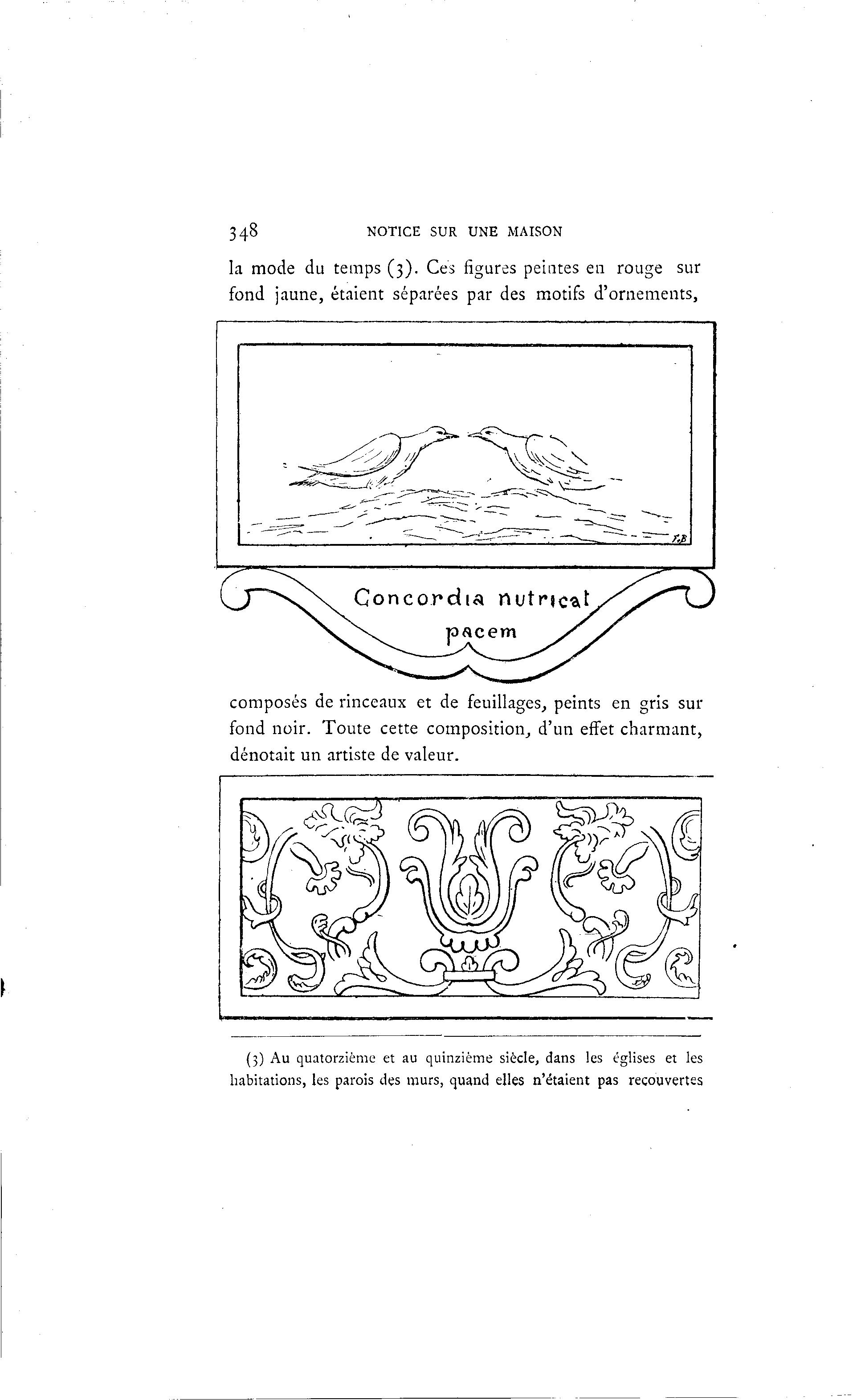 348 NOTICE SUR UNE MAISON la mode du temps (3). Ces figures peintes en rouge sur fond jaune, étaient séparées par des motifs d'ornements, composés de rinceaux et de feuillages, peints en gris sur fond noir. Toute cette composition, d'un effet charmant, dénotait un artiste de valeur. (3) Au quatorzième et au quinzième siècle, dans les églises et les habitations, les parois des murs, quand elles n'étaient pas recouvertes