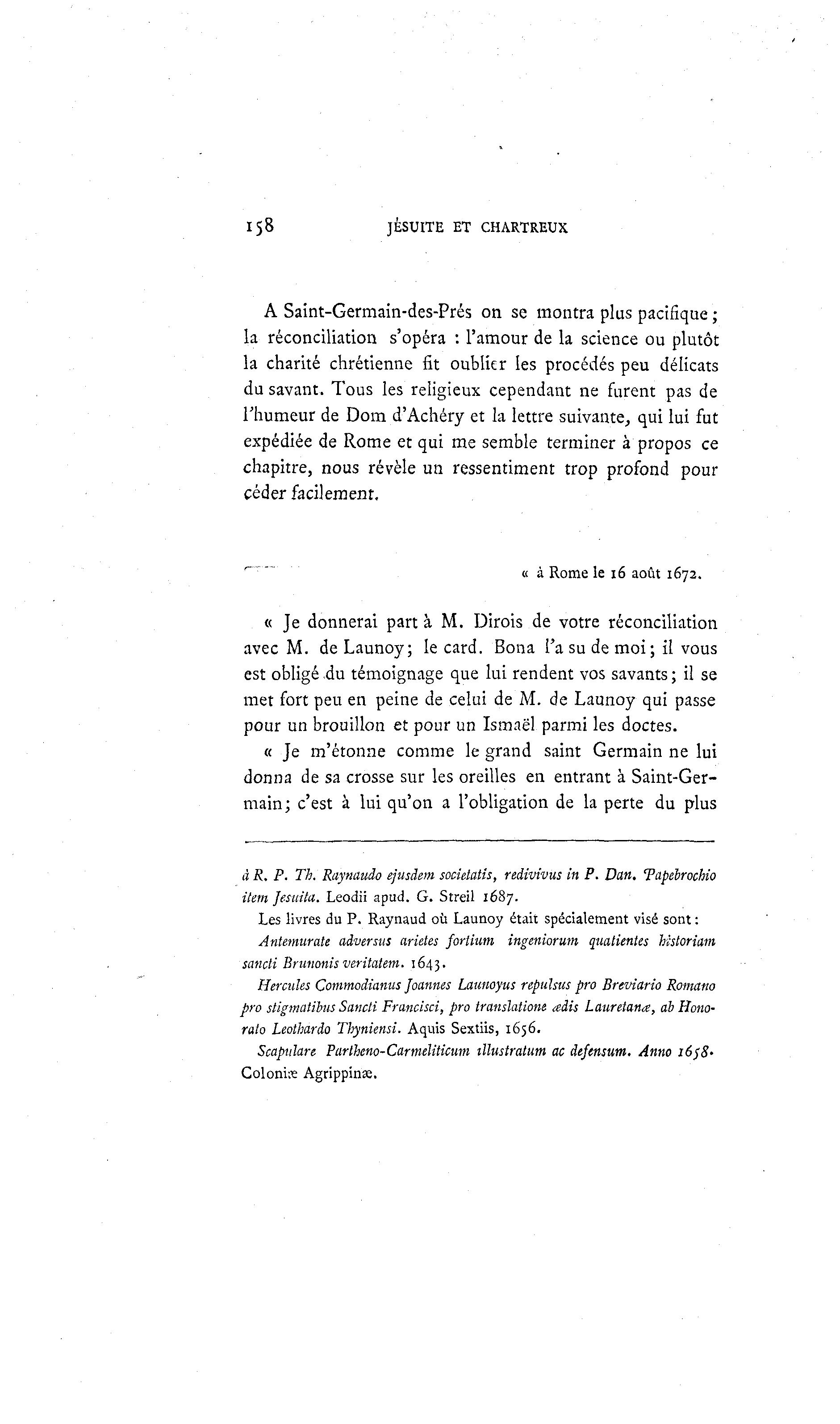 158 JÉSUITE ET CHARTREUX A Saint-Germain-des-Prés on se montra plus pacifique ; la réconciliation s'opéra : l'amour de la science ou plutôt la charité chrétienne fit oublier les procédés peu délicats du savant. Tous les religieux cependant ne furent pas de l'humeur de Dom d'Achéry et la lettre suivante, qui lui fut expédiée de Rome et qui me semble terminer à propos ce chapitre, nous révèle un ressentiment trop profond pour céder facilement. '"T" «à Rome le 16 août 1672. « Je donnerai part à M. Dirois de votre réconciliation avec M. de Launoy; le card. Bona l'a su de moi; il vous est obligé .du témoignage que lui rendent vos savants; il se met fort peu en peine de celui de M. de Launoy qui passe pour un brouillon et pour un Ismaël parmi les doctes. « Je m'étonne comme le grand saint Germain ne lui donna de sa crosse sur les oreilles en entrant à Saint-Ger- main; c'est à lui qu'on a l'obligation de la perte du plus à R. P. Th. Raynaudo ejusdem societatis, redivivus in P. Dan. Tapebrochio item Jesuita. Leodii apud. G. Streil 1687. Les livres du P. Raynaud où Launoy était spécialement visé sont : Antemurate adversus arides fortium ingeniorum quatientes Ustoriam sancti Brunonis veritatem. 1643. Hercules Çommodianus Joannes Launoyus repuhus pro Breviario Romatto pro stigmatïbus Sancti Francisci, pro translatione adis Lauretana, à b Hono- rato Leothardo Thyniensi. Aquis Sextiis, 1656. Scapulare Purtheno-Carmeliticum illustratum ac defensum. Anno 1658- Colonie Agrippinae.