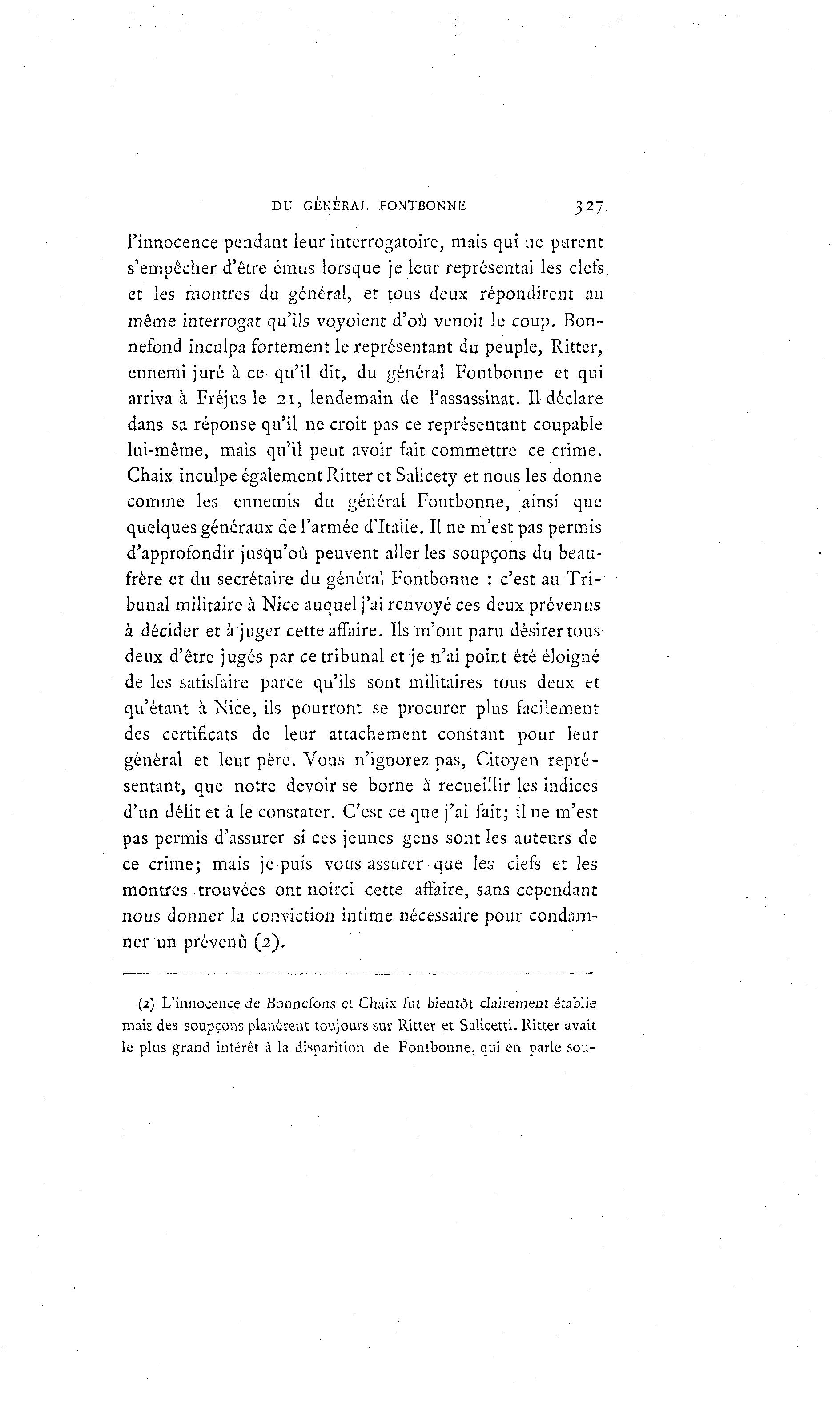 DU GÉNÉRAL FONTBONNE 327. l'innocence pendant leur interrogatoire, mais qui ne purent s'empêcher d'être émus lorsque je leur représentai les clefs, et les montres du général, et tous deux répondirent au même interrogat qu'ils voyoient d'où venoiî le coup. Bon- nefond inculpa fortement le représentant du peuple, Ritter, ennemi juré à ce qu'il dit, du général Fontbonne et qui arriva à Fréjus le 21, lendemain de l'assassinat. Il déclare dans sa réponse qu'il ne croit pas ce représentant coupable lui-même, mais qu'il peut avoir fait commettre ce crime. Chaix inculpe également Ritter et Salicety et nous les donne comme les ennemis du général Fontbonne, ainsi que quelques généraux de l'armée d'Italie. Il ne m'est pas permis d'approfondir jusqu'où peuvent aller les soupçons du beau- frère et du secrétaire du général Fontbonne : c'est au Tri- bunal militaire à Nice auquel j'ai renvoyé ces deux prévenus à décider et à juger cette affaire. Ils m'ont paru désirer tous deux d'être jugés par ce tribunal et je n'ai point été éloigné de les satisfaire parce qu'ils sont militaires tous deux et qu'étant à Nice, ils pourront se procurer plus facilement des certificats de leur attachement constant pour leur général et leur père. Vous n'ignorez pas, Citoyen repré- sentant, que notre devoir se borne a recueillir les indices d'un délit et à le constater. C'est ce que j'ai fait; il ne m'est pas permis d'assurer si ces jeunes gens sont les auteurs de ce crime; mais je puis vous assurer que les clefs et les montres trouvées ont noirci cette affaire, sans cependant nous donner la conviction intime nécessaire pour condam- ner un prévenu (2). (2) L'innocence de Bonnefons et Chaix fut bientôt clairement établie mais des soupçons planèrent toujours sur Ritter et Salicetti. Ritter avait le plus grand intérêt à la disparition de Fontbonne, qui en parle sou-