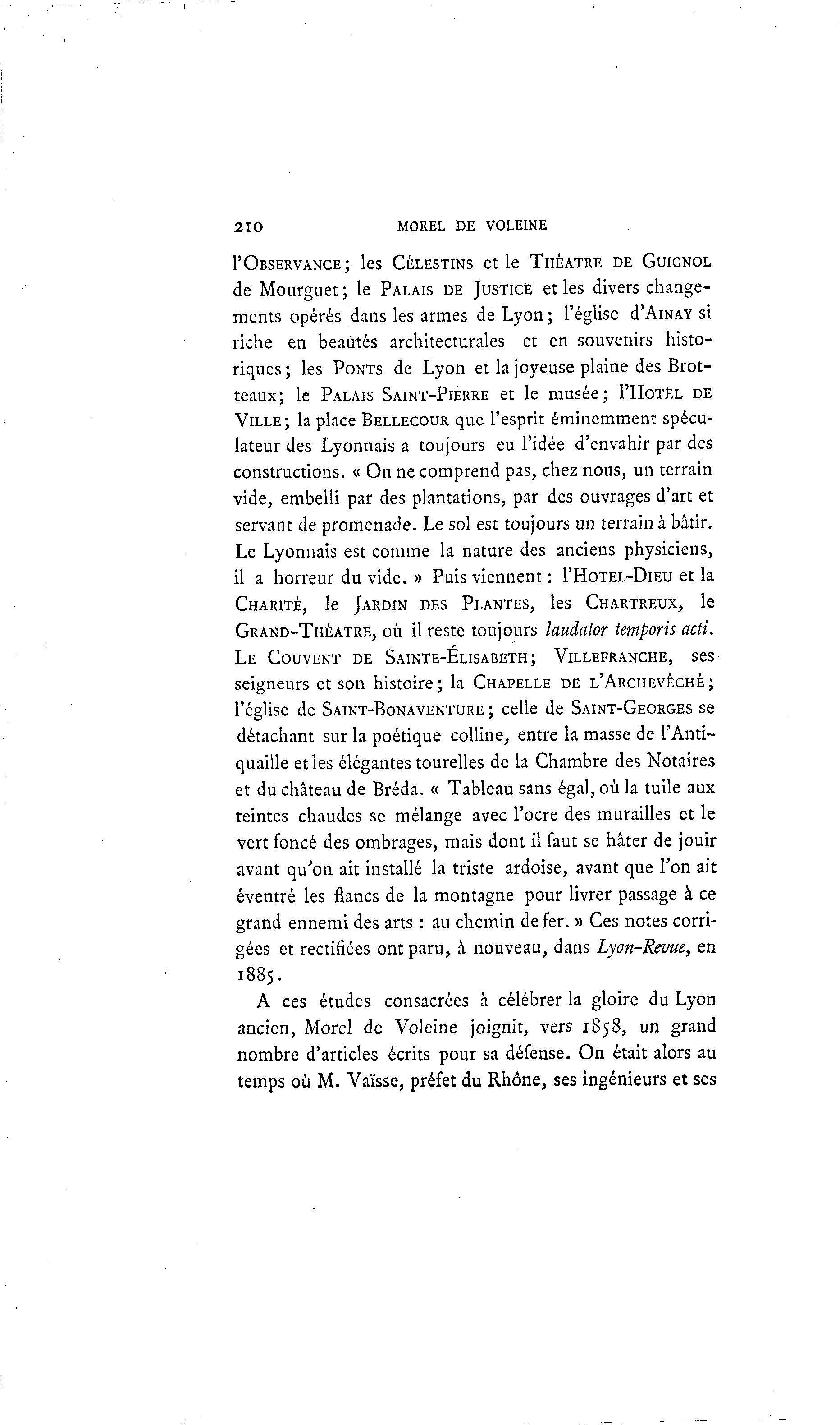 210 MOREL DE VOLEIKE 1'OBSERVANCE; les CÊLESTINS et le THÉÂTRE DE GUIGNOL de Mourguet ; le PALAIS DE JUSTICE et les divers change- ments opérés dans les armes de Lyon ; l'église d'AiNAY si riche en beautés architecturales et en souvenirs histo- riques ; les PONTS de Lyon et la joyeuse plaine des Brot- teaux; le PALAIS SAINT-PIERRE et le musée; I'HOTÈL DE VILLE ; la place BELLECOUR que l'esprit éminemment spécu- lateur des Lyonnais a toujours eu l'idée d'envahir par des constructions. « On ne comprend pas, chez nous, un terrain vide, embelli par des plantations, par des ouvrages d'art et servant de promenade. Le sol est toujours un terrain à bâtir. Le Lyonnais est comme la nature des anciens physiciens, il a horreur du vide. » Puis viennent : I'HOTEL-DIEU et la CHARITÉ, le JARDIN DES PLANTES, les CHARTREUX, le GRAND-THÊATRE, OÙ il reste toujours laudaior temporis acti. LE COUVENT DE SAINTE-ELISABETH; VILLEFRANCHE, ses seigneurs et son histoire ; la CHAPELLE DE L'ARCHEVÊCHÉ ; l'église de SAINT-BONAVENTURE ; celle de SAINT-GEORGES se détachant sur la poétique colline, entre la masse de l'Anti~ quaille et les élégantes tourelles de la Chambre des Notaires et du château de Bréda. « Tableau sans égal, où la tuile aux teintes chaudes se mélange avec l'ocre des murailles et le vert foncé des ombrages, mais dont il faut se hâter de jouir avant qu'on ait installé la triste ardoise, avant que l'on ait éventré les flancs de la montagne pour livrer passage à ce grand ennemi des arts : au chemin de fer. » Ces notes corri- gées et rectifiées ont paru, à nouveau, dans Lyon-Revue, en 1885. A ces études consacrées à célébrer la gloire du Lyon ancien, Morel de Voleine joignit, vers 1858, un grand nombre d'articles écrits pour sa défense. On était alors au temps où M. Vaïsse, préfet du Rhône, ses ingénieurs et ses