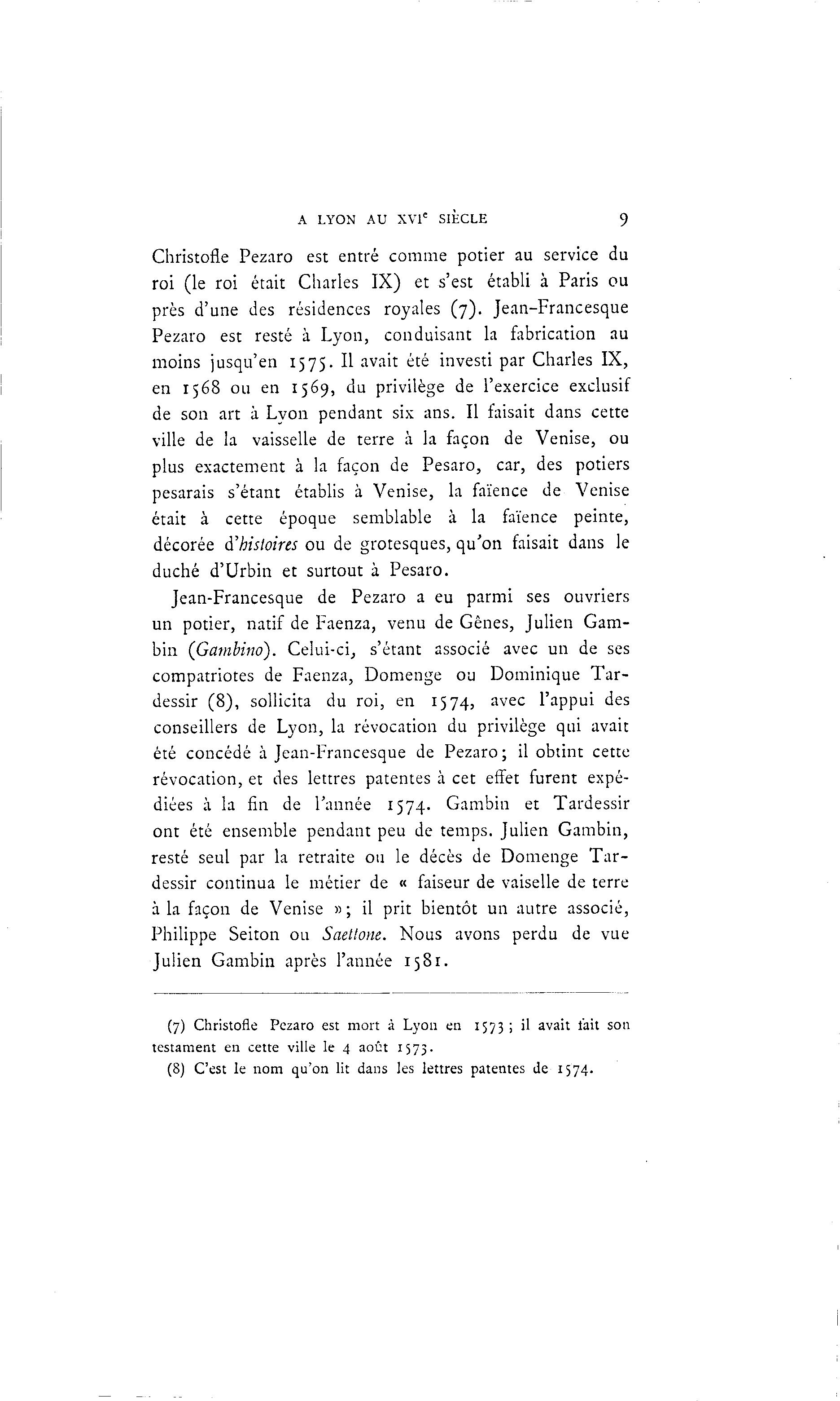 A LYON AU XVIe SIECLE 9 Christofle Pezaro est entré comme potier au service du roi (le roi était Charles IX) et s'est établi à Paris ou près d'une des résidences royales (7). Jean-Francesque Pezaro est resté à Lyon, conduisant la fabrication au moins jusqu'en 1575. Il avait été investi par Charles IX, en 1568 ou en 1569, du privilège de l'exercice exclusif de son art à Lyon pendant six ans. Il faisait dans cette ville de la vaisselle de terre à la façon de Venise, ou plus exactement à la façon de Pesaro, car, des potiers pesarais s'étant établis à Venise, la faïence de Venise était à cette époque semblable à la faïence peinte, décorée d'histoires ou de grotesques, qu'on faisait dans le duché d'Urbin et surtout à Pesaro. Jean-Francesque de Pezaro a eu parmi ses ouvriers un potier, natif de Faenza, venu de Gênes, Julien Gam- bin (Gambino). Celui-ci, s'étant associé avec un de ses compatriotes de Faenza, Domenge ou Dominique Tar- dessir (8), sollicita du roi, en 1574, avec l'appui des conseillers de Lyon, la révocation du privilège qui avait été concédé à Jean-Francesque de Pezaro; il obtint cette révocation, et des lettres patentes à cet effet furent expé- diées à la fin de l'année 1574. Gambin et Tardessir ont été ensemble pendant peu de temps. Julien Gambin, resté seul par la retraite ou le décès de Domenge Tar- dessir continua le métier de « faiseur de vaiselle de terre à la façon de Venise » ; il prit bientôt un autre associé, Philippe Seiton ou Saetlone. Nous avons perdu de vue Julien Gambin après l'année 1581. (7) Christofle Pezaro est mort à Lyon en 1573 ; il avait l'ait son testament en cette ville le 4 août 1573. (8) C'est le nom qu'on lit dans les lettres patentes de 1574.