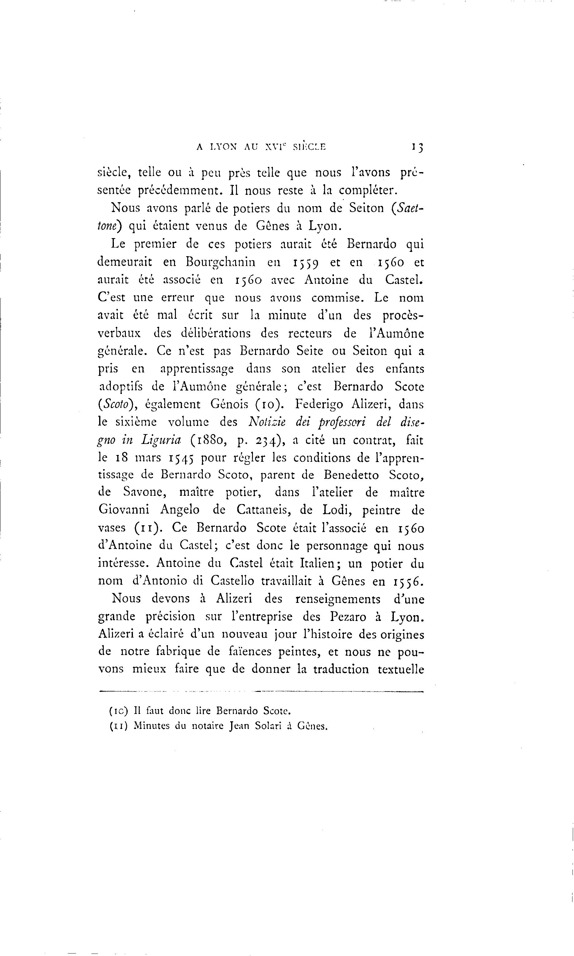 A LYON AU XVI e Sll'CLE 13 siècle, telle ou à peu près telle que nous l'avons pré- sentée précédemment. Il nous reste à la compléter. Nous avons parlé de potiers du nom de Seiton (Saet- tone) qui étaient venus de Gênes à Lyon. Le premier de ces potiers aurait été Bernardo qui demeurait en Bourgchanin en 1559 et en 1560 et aurait été associé en 1560 avec Antoine du Castel. C'est une erreur que nous avons commise. Le nom avait été mal écrit sur la minute d'un des procès- verbaux des délibérations des recteurs de l'Aumône générale. Ce n'est pas Bernardo Seite ou Seiton qui a pris en apprentissage dans son atelier des enfants adoptifs de l'Aumône générale ; c'est Bernardo Scote (Scoto), également Génois ( r o ) . Federigo Alizeri, dans le sixième volume des Notizie dei professori deî dise- gno in Liguria (1880, p. 234), a cité un contrat, fait le 18 mars 1545 pour régler les conditions de l'appren- tissage de Bernardo Scoto, parent de Benedetto Scoto, de Savone, maître potier, dans l'atelier de maître Giovanni Angelo de Cattaneis, de Lodi, peintre de vases ( n ) . Ce Bernardo Scote était l'associé en 1560 d'Antoine du Castel; c'est donc le personnage qui nous intéresse. Antoine du Castel était Italien; un potier du nom d'Antonio di Castelîo travaillait à Gênes en 1556. Nous devons à Alizeri des renseignements d'une grande précision sur l'entreprise des Pezaro à Lyon. Alizeri a éclairé d'un nouveau jour l'histoire des origines de notre fabrique de faïences peintes, et nous ne pou- vons mieux faire que de donner la traduction textuelle (ic) Il faut donc lire Bernardo Scote. ( n ) Minutes du notaire Jean Solari à Gênes.