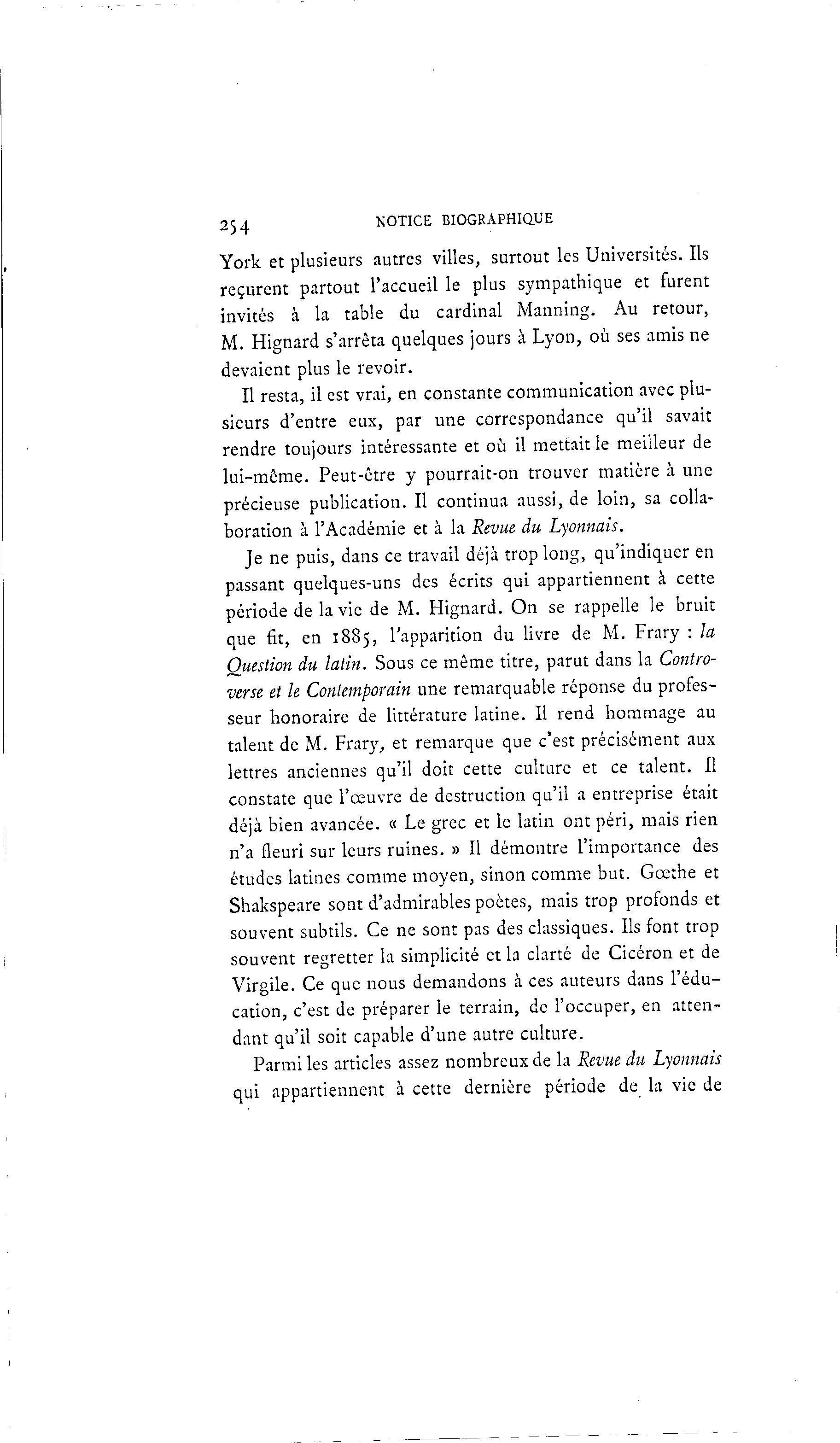 254 NOTICE BIOGRAPHIQUE York et plusieurs autres villes, surtout les Universités. Ils reçurent partout l'accueil le plus sympathique et furent invités à la table du cardinal Manning. Au retour, M. Hignard s'arrêta quelques jours à Lyon, où ses amis ne devaient plus le revoir. Il resta, il est vrai, en constante communication avec plu- sieurs d'entre eux, par une correspondance qu'il savait rendre toujours intéressante et où il mettait le meilleur de lui-même. Peut-être y pourrait-on trouver matière à une précieuse publication. Il continua aussi, de loin, sa colla- boration à l'Académie et à la Revue du Lyonnais. Je ne puis, dans ce travail déjà trop long, qu'indiquer en passant quelques-uns des écrits qui appartiennent à cette période de la vie de M. Hignard. On se rappelle le bruit que fit, en 1885, l'apparition du livre de M. Frary : la Question du latin. Sous ce même titre, parut dans la Contro- verse et le Contemporain une remarquable réponse du profes- seur honoraire de littérature latine. Il rend hommage au talent de M. Frary, et remarque que c'est précisément aux lettres anciennes qu'il doit cette culture et ce talent. Il constate que l'œuvre de destruction qu'il a entreprise était déjà bien avancée. « Le grec et le latin ont péri, mais rien n'a fleuri sur leurs ruines. » Il démontre l'importance des études latines comme moyen, sinon comme but. Goethe et Shakspeare sont d'admirables poètes, mais trop profonds et souvent subtils. Ce ne sont pas des classiques. Ils font trop souvent regretter la simplicité et la clarté de Cicéron et de Virgile. Ce que nous demandons à ces auteurs dans l'édu- cation, c'est de préparer le terrain, de l'occuper, en atten- dant qu'il soit capable d'une autre culture. Parmi les articles assez nombreux de la Revue du Lyonnais qui appartiennent à cette dernière période de la vie de