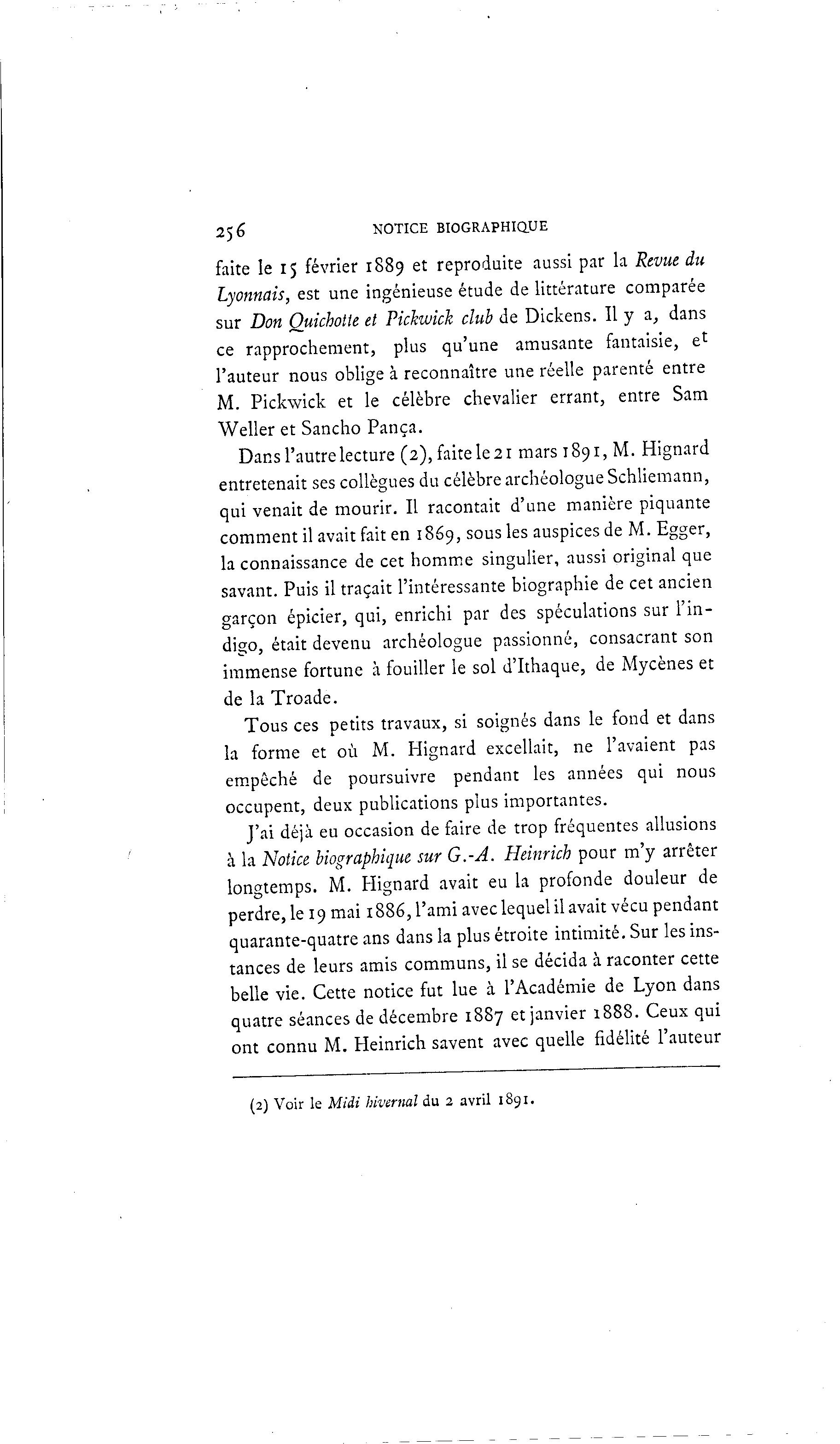 256 NOTICE BIOGRAPHIQUE faite le 15 février 1889 et reproduite aussi par la Revue du Lyonnais, est une ingénieuse étude de littérature comparée sur Don Quichotte et Pickwick club de Dickens. Il y a, dans ce rapprochement, plus qu'une amusante fantaisie, e 1 l'auteur nous oblige à reconnaître une réelle parenté entre M. Pickwick et le célèbre chevalier errant, entre Sam Weller et Sancho Pança. Dans l'autre lecture (2), faite le 21 mars 1891, M. Hignard entretenait ses collègues du célèbre archéologue Schliemann, qui venait de mourir. Il racontait d'une manière piquante comment il avait fait en 1869, sous les auspices de M. Egger, la connaissance de cet homme singulier, aussi original que savant. Puis il traçait l'intéressante biographie de cet ancien garçon épicier, qui, enrichi par des spéculations sur l'in- digo, était devenu archéologue passionné, consacrant son immense fortune à fouiller le sol d'Ithaque, de Mycènes et de la Troade. Tous ces petits travaux, si soignés dans le fond et dans la forme et où M. Hignard excellait, ne l'avaient pas empêché de poursuivre pendant les années qui nous occupent, deux publications plus importantes. J'ai déjà eu occasion de faire de trop fréquentes allusions à la Notice biographique sur G.-A. Heinrich pour m'y arrêter longtemps. M. Hignard avait eu la profonde douleur de perdre, le 19 mai 1886, l'ami avec lequel il avait vécu pendant quarante-quatre ans dans la plus étroite intimité. Sur les ins- tances de leurs amis communs, il se décida à raconter cette belle vie. Cette notice fut lue à l'Académie de Lyon dans quatre séances de décembre 1887 et janvier 1888. Ceux qui ont connu M. Heinrich savent avec quelle fidélité l'auteur (2) Voir le Midi hivernal du 2 avril 1891.