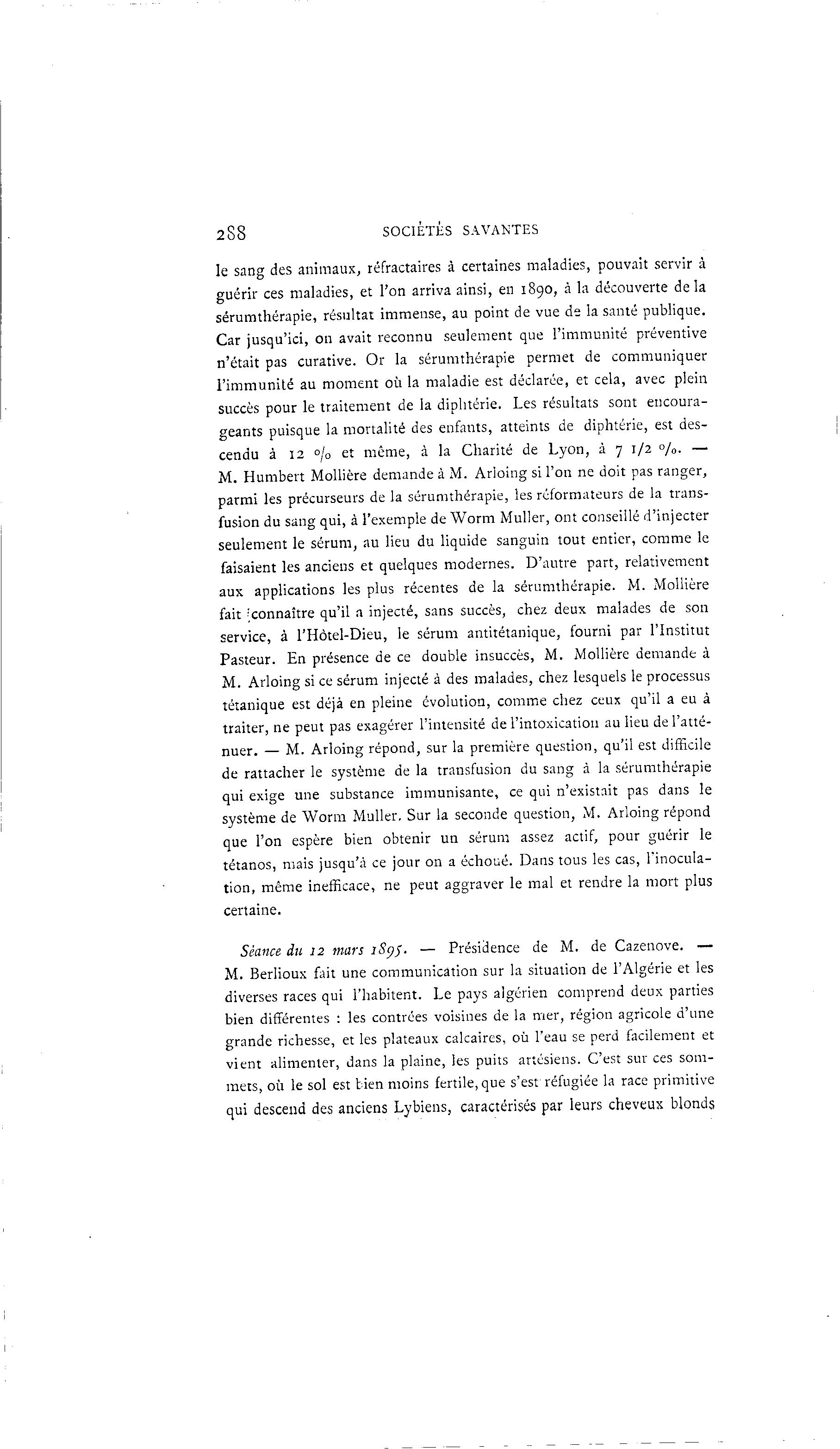 238 SOCIÉTÉS SAVANTES le sang des animaux, réfractaires à certaines maladies, pouvait servir à guérir ces maladies, et l'on arriva ainsi, en 1890, à la découverte delà sérumthérapie, résultat immense, au point de vue de la santé publique. Car jusqu'ici, on avait reconnu seulement que l'immunité préventive n'était pas curative. Or la sérumthérapie permet de communiquer l'immunité au moment où la maladie est déclarée, et cela, avec plein succès pour le traitement de la diphtérie. Les résultats sont encoura- geants puisque la mortalité des enfants, atteints de diphtérie, est des- cendu à 12 °/o et même, à la Charité de Lyon, à 7 1/2 % . — M. Humbert Mollière demande à M. Arloing si l'on ne doit pas ranger, parmi les précurseurs de la sérumthérapie, les réformateurs de la trans- fusion du sang qui, à l'exemple de Worm Muller, ont conseillé d'injecter seulement le sérum, au lieu du liquide sanguin tout entier, comme le faisaient les anciens et quelques modernes. D'autre part, relativement aux applications les plus récentes de la sérumthérapie. M. Mollière fait ^connaître qu'il a injecté, sans succès, chez deux malades de son service, à l'Hôtel-Dieu, le sérum antitétanique, fourni par l'Institut Pasteur. En présence de ce double insuccès, M. Mollière demande à M. Arloing si ce sérum injecté à des malades, chez lesquels le processus tétanique est déjà en pleine évolution, comme chez ceux qu'il a eu à traiter, ne peut pas exagérer l'intensité de l'intoxication au lieu de l'atté- nuer. — M. Arloing répond, sur la première question, qu'il est difficile de rattacher le système de la transfusion du sang à la sérumthérapie qui exige une substance immunisante, ce qui n'existait pas dans le système de Worm Muller. Sur la seconde question, M. Arloing répond que l'on espère bien obtenir un sérum assez actif, pour guérir le tétanos, mais jusqu'à ce jour on a échoué. Dans tous les cas, l'inocula- tion, même inefficace, ne peut aggraver le mal et rendre la mort plus certaine. Séance du 12 mars iSpf. — Présidence de M. de Cazenove. — M. Berlioux fait une communication sur la situation de l'Algérie et les diverses races qui l'habitent. Le pays algérien comprend deux parties bien différentes : les contrées voisines de la mer, région agricole d'une grande richesse, et les plateaux calcaires, où l'eau se perd facilement et vient alimenter, dans la plaine, les puits artésiens. C'est sur ces som- mets, où le sol est bien moins fertile, que s'est réfugiée la race primitive qui descend des anciens Lybiens, caractérisés par leurs cheveux blonds