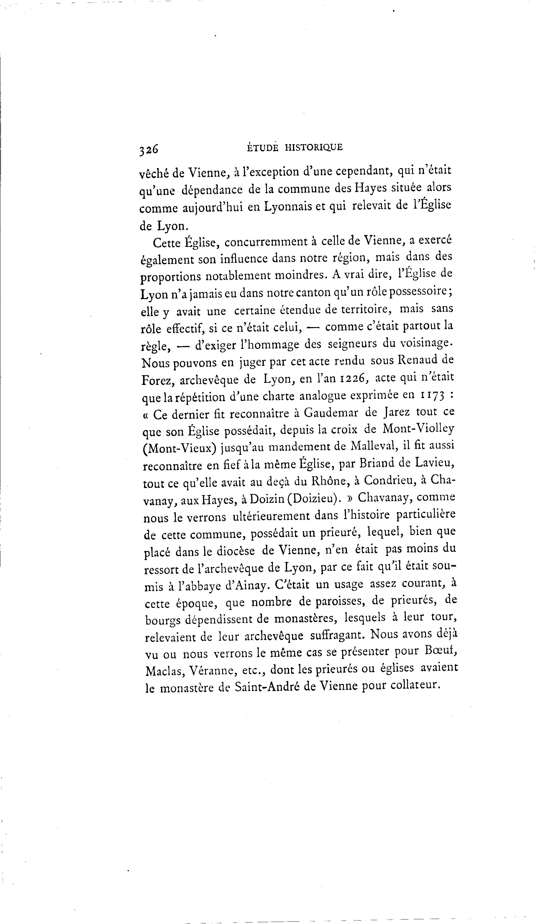 326 ÉTUDE HISTORIQUE vêché de Vienne, à l'exception d'une cependant, qui n'était qu'une dépendance de la commune des Hayes située alors comme aujourd'hui en Lyonnais et qui relevait de l'Église de Lyon. Cette Église, concurremment à celle de Vienne, a exercé également son influence dans notre région, mais dans des proportions notablement moindres. A vrai dire, l'Église de Lyon n'a jamais eu dans notre canton qu'un rôlepossessoire; elle y avait une certaine étendue de territoire, mais sans rôle effectif, si ce n'était celui, — comme c'était partout la règle, — d'exiger l'hommage des seigneurs du voisinage. Nous pouvons en juger par cet acte rendu sous Renaud de Forez, archevêque de Lyon, en l'an 1226, acte qui n'était que la répétition d'une charte analogue exprimée en 1173 : « Ce dernier fit reconnaître à Gaudemar de Jarez tout ce que son Église possédait, depuis la croix de Mont-Violley (Mont-Vieux) jusqu'au mandement de Malleval, il fit aussi reconnaître en fief à la même Église, par Briand de Lavieu, tout ce qu'elle avait au deçà du Rhône, à Condrieu, à Cha- vanay, aux Hayes, à Doizin(Doizieu). » Chavanay, comme nous le verrons ultérieurement dans l'histoire particulière de cette commune, possédait un prieuré, lequel, bien que placé dans le diocèse de Vienne, n'en était pas moins du ressort de l'archevêque de Lyon, par ce fait qu'il était sou- mis à l'abbaye d'Ainay. C'était un usage assez courant, à cette époque, que nombre de paroisses, de prieurés, de bourgs dépendissent de monastères, lesquels à leur tour, relevaient de leur archevêque suffragant. Nous avons déjà vu ou nous verrons le même cas se présenter pour Bœuf, Maclas, Véranne, etc., dont les prieurés ou églises avaient le monastère de Saint-André de Vienne pour collateur.