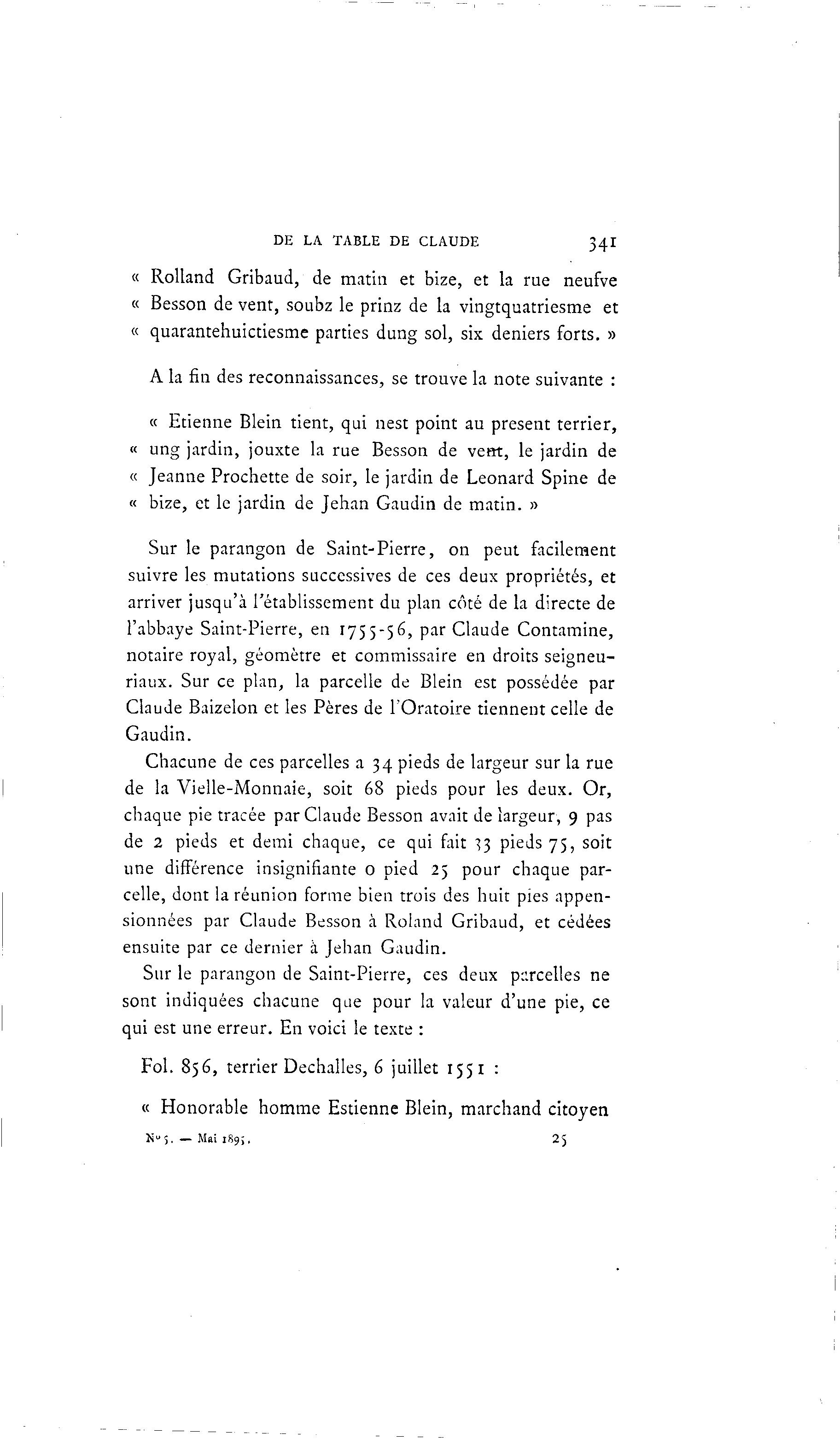 DE LA TABLE DE CLAUDE 341 « Rolland Gribaud, de matin et bize, et la rue neufve « Besson de vent, soubz le prinz de la vingtquatriesme et « quarantehuictiesme parties dung sol, six deniers forts. » A la fin des reconnaissances, se trouve la note suivante : « Etienne Blein tient, qui nest point au présent terrier, « ung jardin, jouxte la rue Besson de veat, le jardin de « Jeanne Prochette de soir, le jardin de Léonard Spine de « bize, et le jardin de Jehan Gaudin de matin. » Sur le parangon de Saint-Pierre, on peut facilement suivre les mutations successives de ces deux propriétés, et arriver jusqu'à l'établissement du plan côté de la directe de l'abbaye Saint-Pierre, en 1755-56, par Claude Contamine, notaire royal, géomètre et commissaire en droits seigneu- riaux. Sur ce plan, la parcelle de Blein est possédée par Claude Baizelon et les Pères de l'Oratoire tiennent celle de Gaudin. Chacune de ces parcelles a 34 pieds de largeur sur la rue de la Vielle-Monnaie, soit 68 pieds pour les deux. Or, chaque pie tracée par Claude Besson avait de largeur, 9 pas de 2 pieds et demi chaque, ce qui fait 33 pieds 75, soit une différence insignifiante 0 pied 25 pour chaque par- celle, dont la réunion forme bien trois des huit pies appen- sionnées par Claude Besson à Roland Gribaud, et cédées ensuite par ce dernier à Jehan Gaudin. Sur le parangon de Saint-Pierre, ces deux parcelles ne sont indiquées chacune que pour la valeur d'une pie, ce qui est une erreur. En voici le texte : Fol. 856, terrier Dechalles, 6 juillet 1551 : « Honorable homme Estienne Blein, marchand citoyen î i " î . — Mai 189;, 25