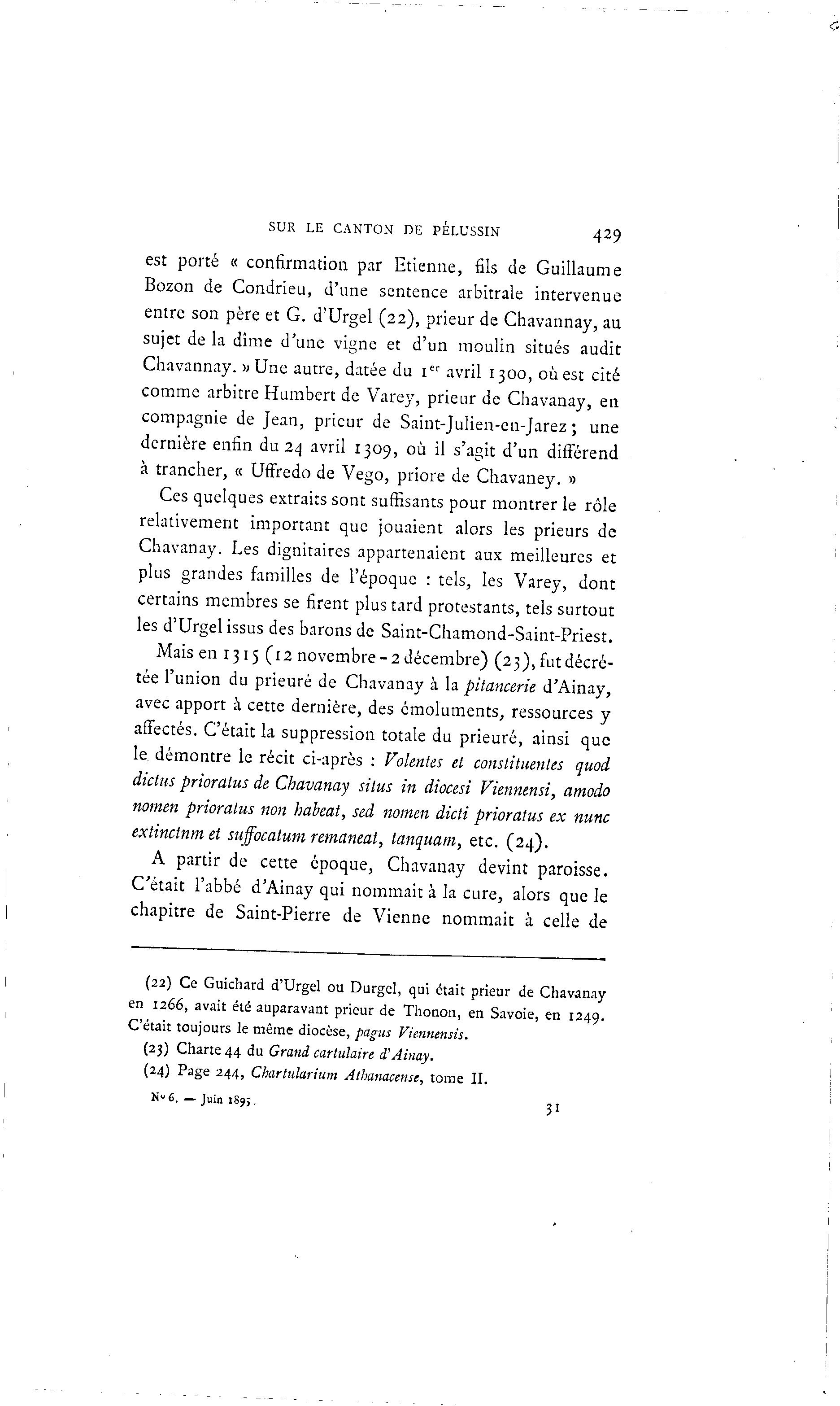 SUR LE CANTON DE PELUSSIN 429 est porté « confirmation par Etienne, fils de Guillaume Bozon de Condrieu, d'une sentence arbitrale intervenue entre son père et G. d'Urgel (22), prieur de Chavannay, au sujet de la dîme d'une vigne et d'un moulin situés audit Chavannay. >J Une autre, datée du 1" avril 1300, où est cité comme arbitre Humbert de Varey, prieur de Chavanay, en compagnie de Jean, prieur de Saint-Julien-en-Jarez ; une dernière enfin du 24 avril 1309, où il s'agit d'un différend à trancher, « UfFredo de Vego, priore de Chavaney. » Ces quelques extraits sont suffisants pour montrer le rôle relativement important que jouaient alors les prieurs de Chavanay. Les dignitaires appartenaient aux meilleures et plus grandes familles de l'époque : tels, les Varey, dont certains membres se firent plus tard protestants, tels surtout les d'Urgel issus des barons de Saint-Chamond-Saint-Priest. Mais en 1315 (12 novembre-2 décembre) (23), fut décré- tée l'union du prieuré de Chavanay à la pitancerie d'Ainay, avec apport à cette dernière, des émoluments, ressources y affectés. C'était la suppression totale du prieuré, ainsi que le démontre le récit ci-après : Volentes et conslituentes quoi dictus prioralus de Chavanay silus in diocesi Viennensi, amodo nomen prioralus non habeat, sed nomen dicti prioralus ex nunc extinctnmet suffocatum remaneat, tanquam, etc. (24). A partir de cette époque, Chavanay devint paroisse. C'était l'abbé d'Ainay qui nommait à la cure, alors que le chapitre de Saint-Pierre de Vienne nommait à celle de (22) Ce Guichard d'Urgel ou Durgel, qui était prieur de Chavanay en 1266, avait été auparavant prieur de Thonon, en Savoie, en 1249. C'était toujours le même diocèse, pagus Viennensis. (23) Charte 44 du Grand cartulaire d'Ainay. (24) Page 244, Chartularium Athanacense, tome II. N u 6. — juin 1895. 31