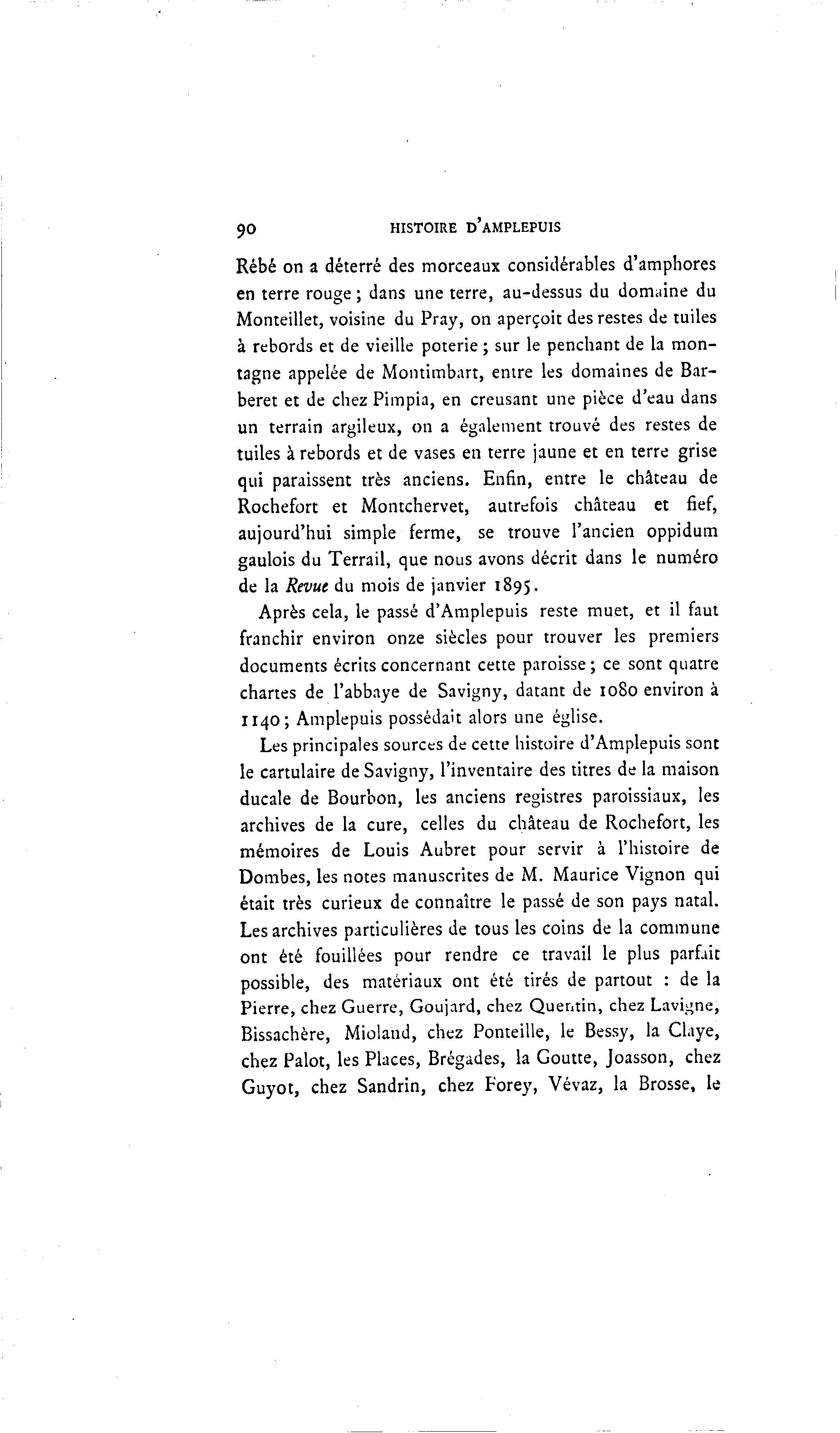 90 HISTOIRE D'AMPLEPUIS Rébé on a déterré des morceaux considérables d'amphores en terre rouge ; dans une terre, au-dessus du domaine du Monteillet, voisine du Pray, on aperçoit des restes de tuiles à rebords et de vieille poterie ; sur le penchant de la mon- tagne appelée de Montimbart, entre les domaines de Bar- beret et de chez Pimpia, en creusant une pièce d'eau dans un terrain argileux, on a également trouvé des restes de tuiles à rebords et de vases en terre jaune et en terre grise qui paraissent très anciens. Enfin, entre le château de Rochefort et Montchervet, autrefois château et fief, aujourd'hui simple ferme, se trouve l'ancien oppidum gaulois du Terrail, que nous avons décrit dans le numéro de la Revue du mois de janvier 1895. Après cela, le passé d'Amplepuis reste muet, et il faut franchir environ onze siècles pour trouver les premiers documents écrits concernant cette paroisse; ce sont quatre chartes de l'abbaye de Savigny, datant de 1080 environ à 1140; Amplepuis possédait alors une église. Les principales sources de cette histoire d'Amplepuis sont le cartulaire de Savigny, l'inventaire des titres de la maison ducale de Bourbon, les anciens registres paroissiaux, les archives de la cure, celles du château de Rochefort, les mémoires de Louis Aubret pour servir à l'histoire de Dombes, les notes manuscrites de M. Maurice Vignon qui était très curieux de connaître le passé de son pays natal. Les archives particulières de tous les coins de la commune ont été fouillées pour rendre ce travail le plus parfait possible, des matériaux ont été tirés de partout : de la Pierre, chez Guerre, Goujard, chez Quentin, chez Lavi^ne, Bissachère, Mioland, chez Ponteille, le Bessy, la Claye, chez Pâlot, les Places, Brégades, la Goutte, Joasson, chez Guyot, chez Sandrin, chez Forey, Vévaz, la Brosse, le