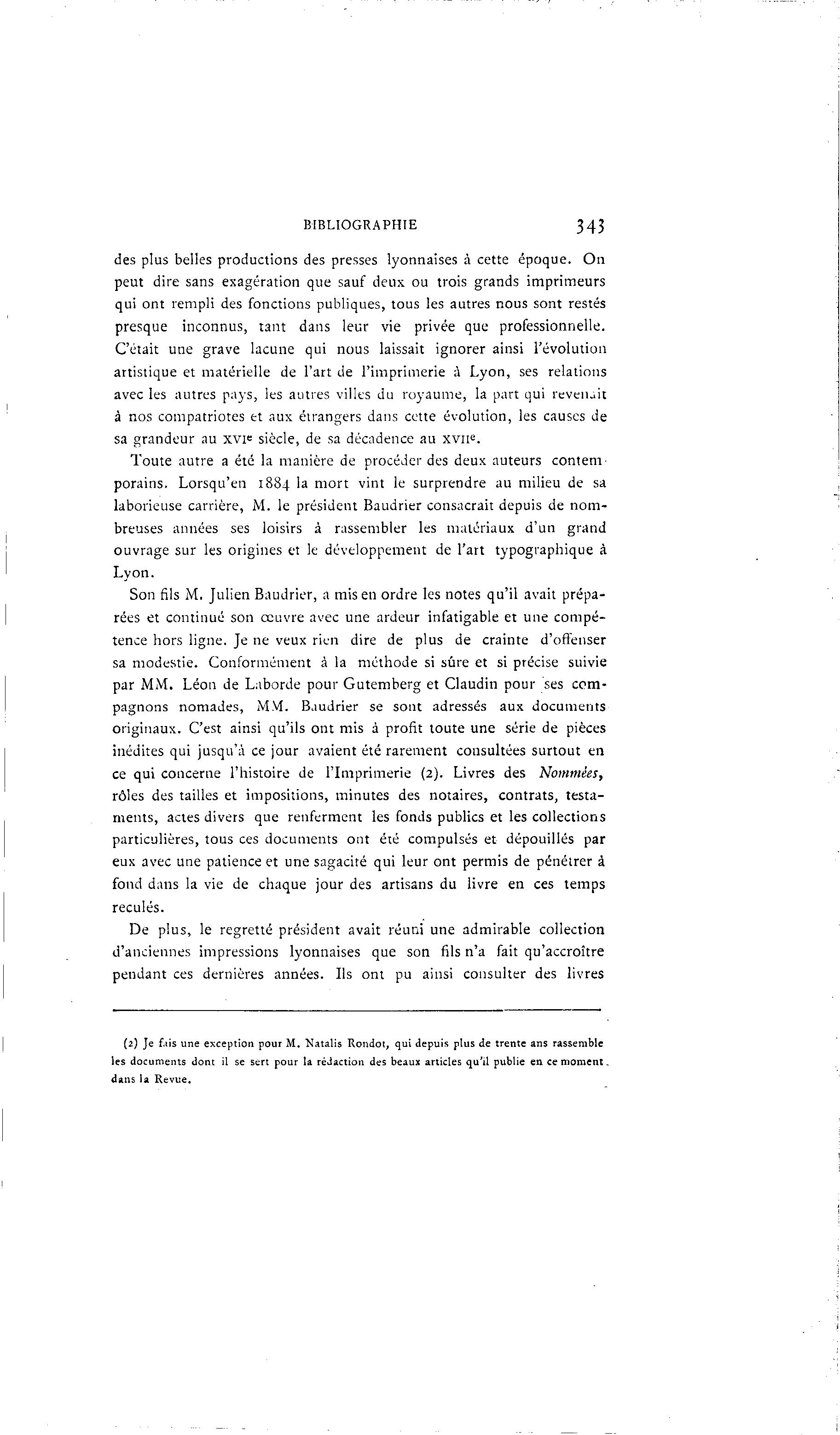 BIBLIOGRAPHIE 343 des plus belles productions des presses lyonnaises à cette époque. On peut dire sans exagération que sauf deux ou trois grands imprimeurs qui ont rempli des fonctions publiques, tous les autres nous sont restés presque inconnus, tant dans leur vie privée que professionnelle. C'était une grave lacune qui nous laissait ignorer ainsi l'évolution artistique et matérielle de l'art de l'imprimerie à Lyon, ses relations avec les autres pays, les autres villes du royaume, la part qui revenait à nos compatriotes et aux étrangers dans cette évolution, les causes de sa grandeur au xvi= siècle, de sa décadence au xvue. Toute autre a été la manière de procéder des deux auteurs contem porains. Lorsqu'en 1884 la mort vint le surprendre au milieu de sa laborieuse carrière, M. le président Baudrier consacrait depuis de nom- breuses années ses loisirs à rassembler les matériaux d'un grand ouvrage sur les origines et le développement de l'art typographique à Lyon. Son fils M. Julien Baudrier, a mis en ordre les notes qu'il avait prépa- rées et continué son œuvre avec une ardeur infatigable et une compé- tence hors ligne. Je ne veux rien dire de plus de crainte d'offenser sa modestie. Conformément à la méthode si sûre et si précise suivie par MM. Léon de Laborde pour Gutemberg et Claudin pour ses com- pagnons nomades, MM. Baudrier se sont adressés aux documents originaux. C'est ainsi qu'ils ont mis à profit toute une série de pièces inédites qui jusqu'à ce jour avaient été rarement consultées surtout en ce qui concerne l'histoire de l'Imprimerie (2). Livres des Nommées, rôles des tailles et impositions, minutes des notaires, contrats, testa- ments, actes divers que renferment les fonds publics et les collections particulières, tous ces documents ont été compulsés et dépouillés par eux avec une patience et une sagacité qui leur ont permis de pénétrer à fond dans la vie de chaque jour des artisans du livre en ces temps reculés. De plus, le regretté président avait réuni une admirable collection d'anciennes impressions lyonnaises que son fils n'a fait qu'accroître pendant ces dernières années. Ils ont pu ainsi consulter des livres (2) Je f.iis une exception pour M. "Natalis Rondot, qui depuis plus de trente ans rassemble les documents dont il se sert pour la rédaction des beaux articles qu'il publie en ce moment - dans la Revue.