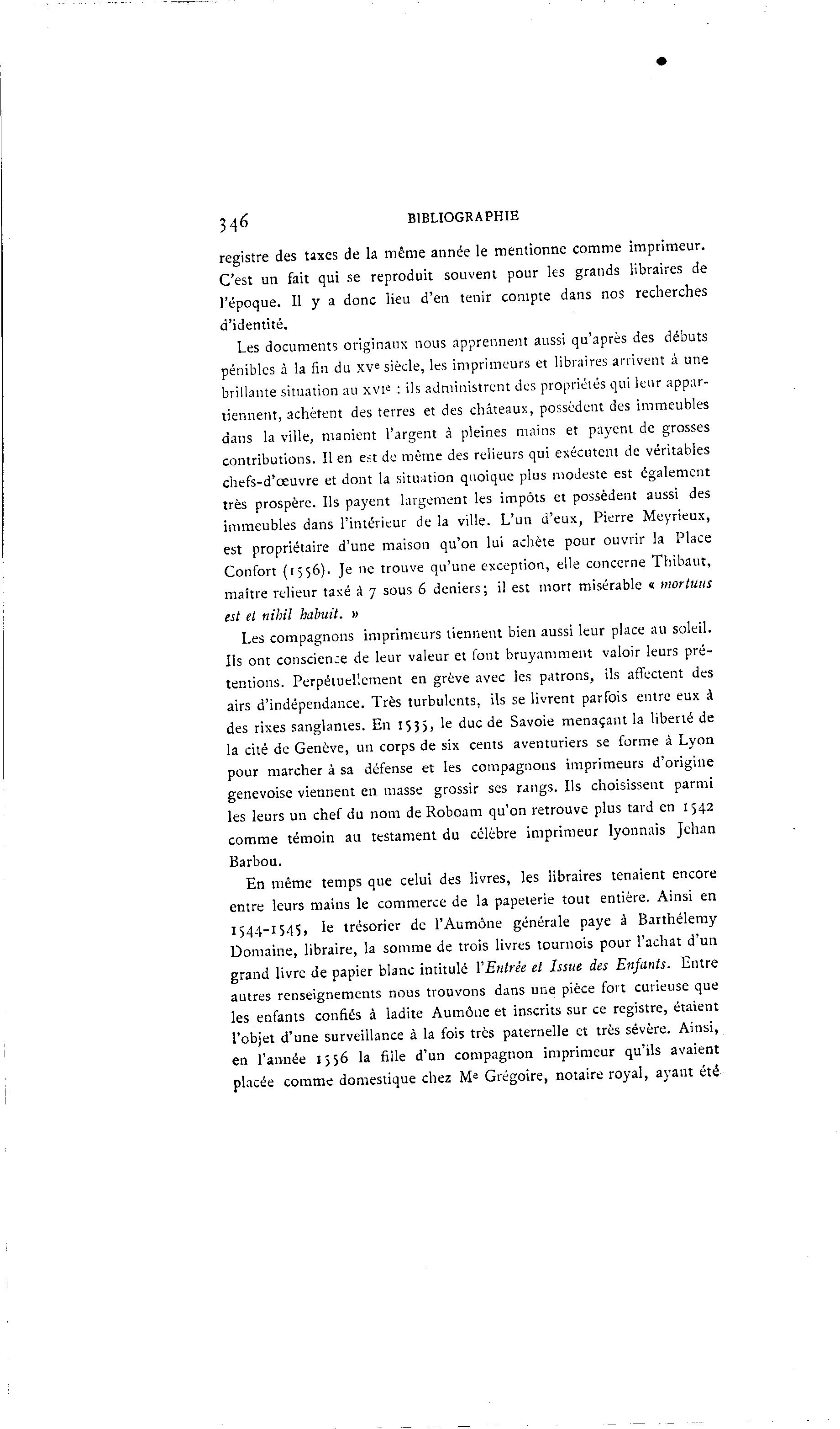 • 346 BIBLIOGRAPHIE registre des taxes de la même année le mentionne comme imprimeur. C'est un fait qui se reproduit souvent pour les grands libraires de l'époque. Il y a donc lieu d'en tenir compte dans nos recherches d'identité. Les documents originaux nous apprennent aussi qu'après des débuts pénibles à la fin du XVe siècle, les imprimeurs et libraires arrivent à une brillante situation au xvi e : ils administrent des propriétés qui leur appar- tiennent, achètent des terres et des châteaux, possèdent des immeubles dans la ville, manient l'argent à pleines mains et payent de grosses contributions. Il en est de même des relieurs qui exécutent de véritables chefs-d'œuvre et dont la situation quoique plus modeste est également très prospère. Ils payent largement les impôts et possèdent aussi des immeubles dans l'intérieur de la ville. L'un d'eux, Pierre Meyrieux, est propriétaire d'une maison qu'on lui achète pour ouvrir la Place Confort (1556). Je ne trouve qu'une exception, elle concerne Thibaut, maître relieur taxé à 7 sous 6 deniers; il est mort misérable « mortuits est et nihil habuit. » Les compagnons imprimeurs tiennent bien aussi leur place au soleil. Ils ont conscien:e de leur valeur et font bruyamment valoir leurs pré- tentions. Perpétuellement en grève avec les patrons, ils affectent des airs d'indépendance. Très turbulents, ils se livrent parfois entre eux à des rixes sanglantes. En 1535, le duc de Savoie menaçant la liberté de la cité de Genève, un corps de six cents aventuriers se forme à Lyon pour marcher à sa défense et les compagnons imprimeurs d'origine genevoise viennent en masse grossir ses rangs. Ils choisissent parmi les leurs un chef du nom de Roboam qu'on retrouve plus tard en 1542 comme témoin au testament du célèbre imprimeur lyonnais Jehan Barbou. En même temps que celui des livres, les libraires tenaient encore entre leurs mains le commerce de la papeterie tout entière. Ainsi en 1544-154 5, le trésorier de l'Aumône générale paye à Barthélémy Domaine, libraire, la somme de trois livres tournois pour l'achat d'un grand livre de papier blanc intitulé l'Entrée et Issue des Enfants. Entre autres renseignements nous trouvons dans une pièce fort curieuse que les enfants confiés à ladite Aumône et inscrits sur ce registre, étaient l'objet d'une surveillance à la fois très paternelle et très sévère. Ainsi, en l'année 1556 la fille d'un compagnon imprimeur qu'ils avaient placée comme domestique chez Me Grégoire, notaire royal, ayant été