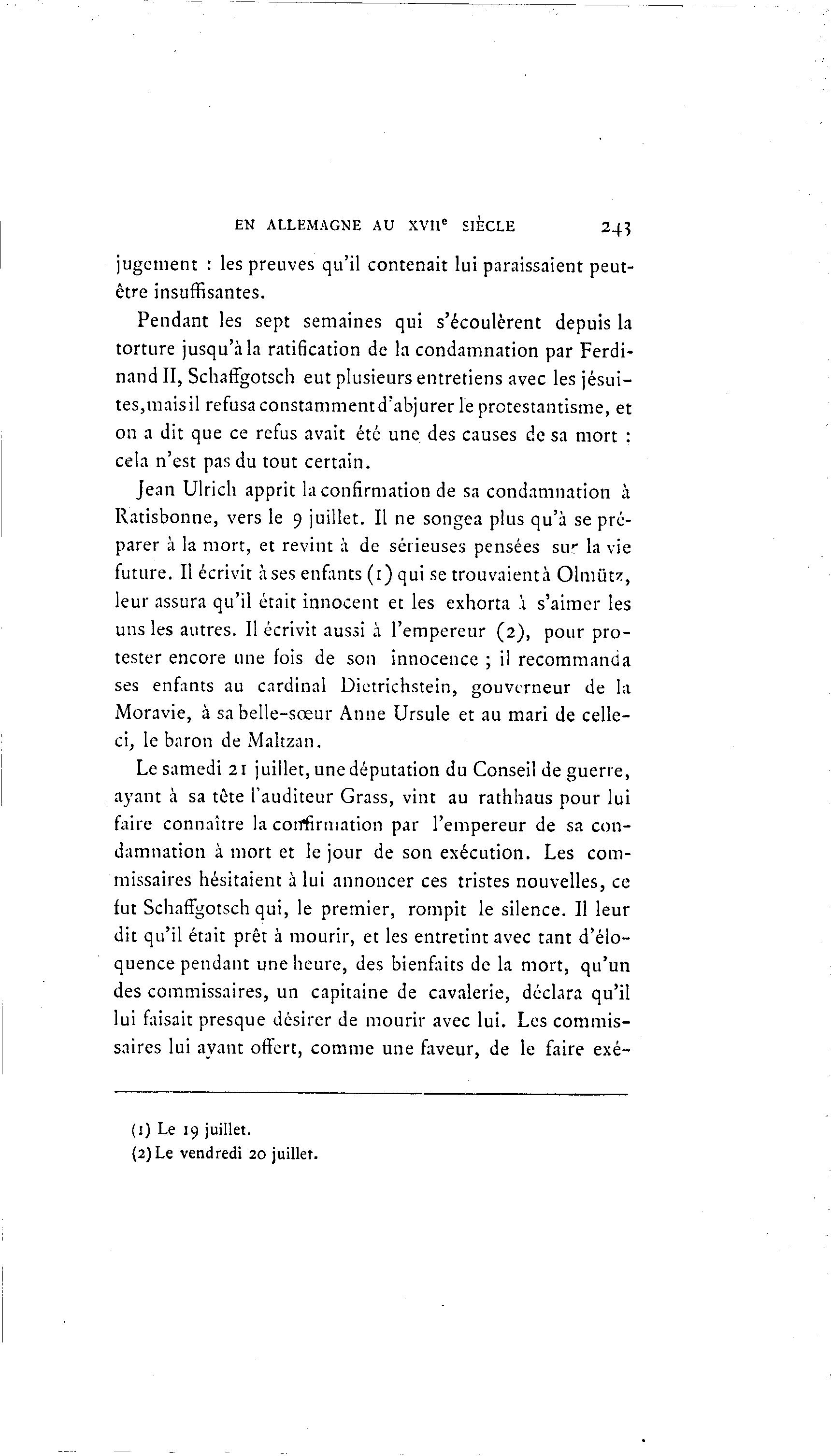 EN ALLEMAGNE AU XVIIe SIÈCLE 243 jugement : les preuves qu'il contenait lui paraissaient peut- être insuffisantes. Pendant les sept semaines qui s'écoulèrent depuis la torture jusqu'à la ratification de la condamnation par Ferdi- nand II, Schaffgotsch eut plusieurs entretiens avec les jésui- tes,maisil refusa constamment d'abjurer le protestantisme, et on a dit que ce refus avait été une des causes de sa mort : cela n'est pas du tout certain. Jean Ulrich apprit la confirmation de sa condamnation à Ratisbonne, vers le 9 juillet. Il ne songea plus qu'à se pré- parer à la mort, et revint à de sérieuses pensées sw la vie future. Il écrivit à ses enfants (1) qui se trouvaientà Olmiïtz, leur assura qu'il était innocent et les exhorta .'1 s'aimer les uns les autres. Il écrivit aussi à l'empereur (2), pour pro- tester encore une fois de son innocence ; il recommanda ses enfants au cardinal Dietrichstein, gouverneur de la Moravie, à sa belle-sœur Anne Ursule et au mari de celle- ci, le baron de Maltzan. Le samedi 21 juillet, unedéputation du Conseil de guerre, ayant à sa tête l'auditeur Grass, vint au ratlihaus pour lui faire connaître la confirmation par l'empereur de sa con- damnation à mort et le jour de son exécution. Les com- missaires hésitaient à lui annoncer ces tristes nouvelles, ce fut Schaffgotsch qui, le premier, rompit le silence. Il leur dit qu'il était prêt à mourir, et les entretint avec tant d'élo- quence pendant une heure, des bienfaits de la mort, qu'un des commissaires, un capitaine de cavalerie, déclara qu'il lui faisait presque désirer de mourir avec lui. Les commis- saires lui ayant offert, comme une faveur, de le faire exé- (1) Le 19 juillet. (2) Le vendredi 20 juillet.