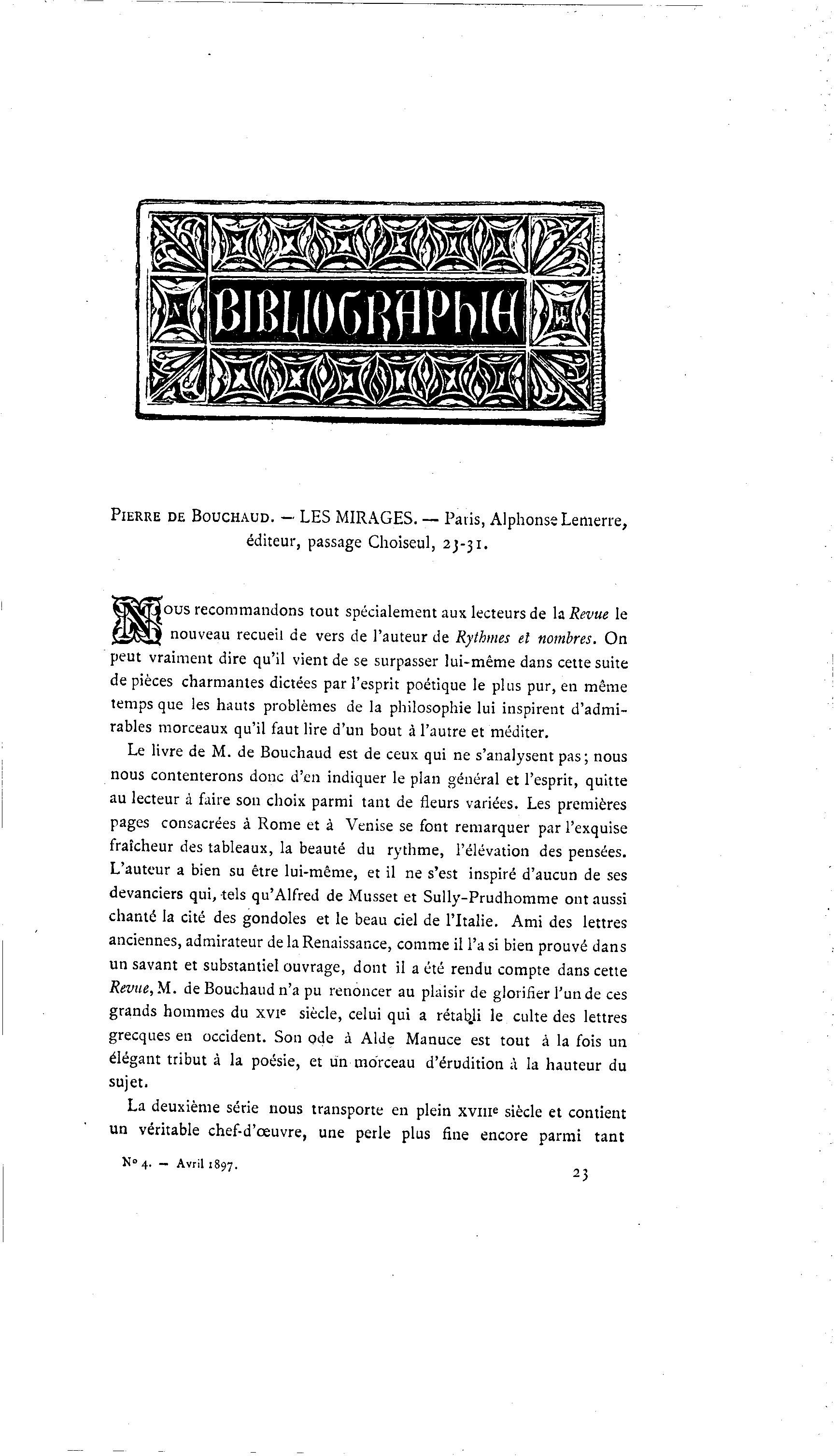 PIERRE DE BOUCHAUD. — LES MIRAGES. — Paris, Alphonse Lemerre,