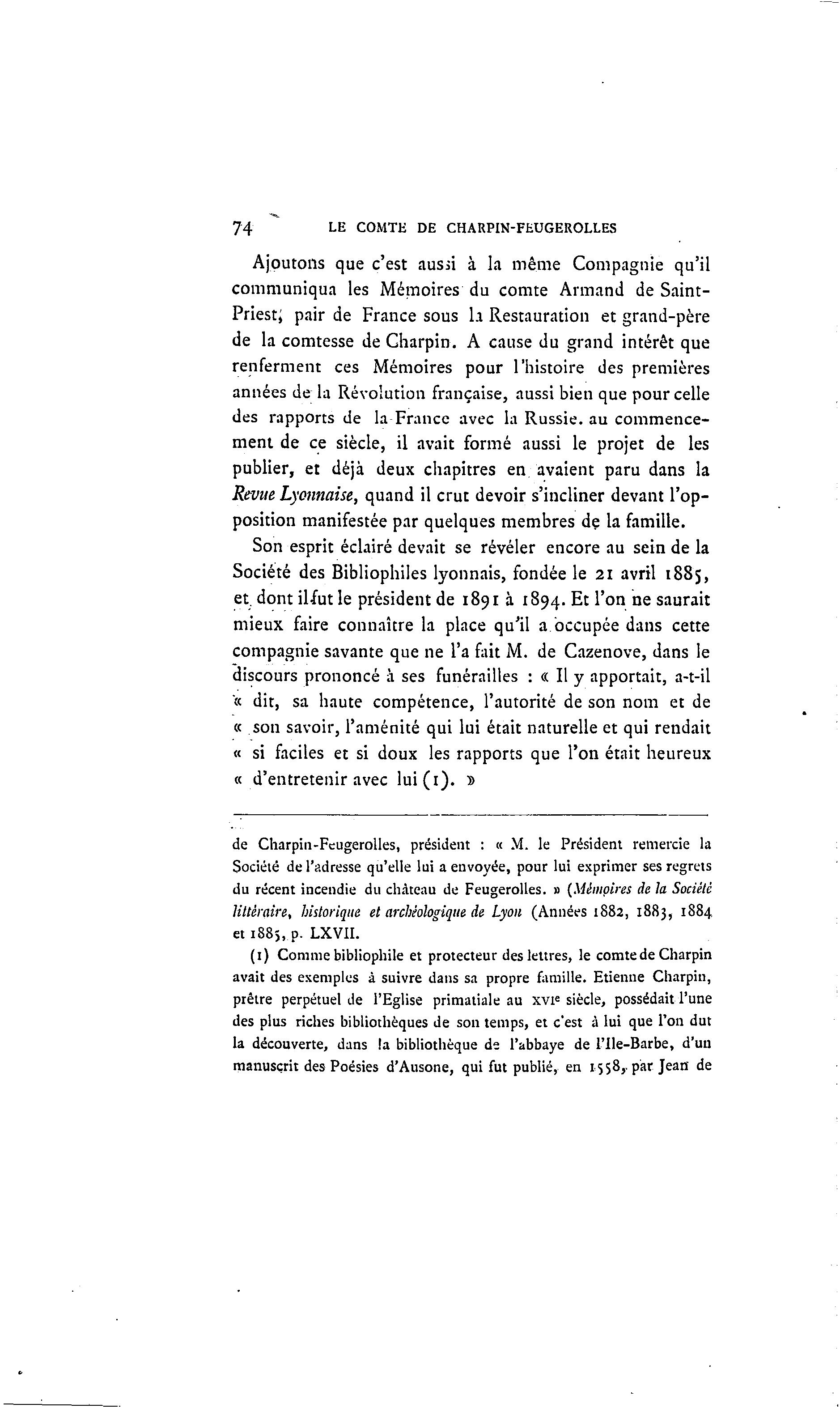 (1) Comme bibliophile et protecteur des lettres, le comte de Charpin