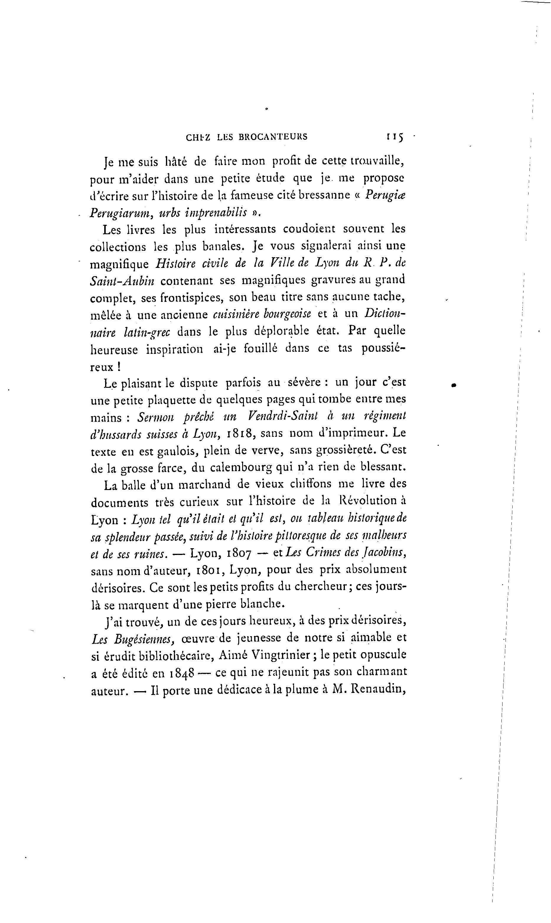CHbZ LliS BROCANTEURS H5 ]e me suis hâté de faire mon profit de cette trouvaille, pour m'aider dans une petite étude que je me propose d'écrire sur l'histoire de la fameuse cité bressanne « Périma Perugiarum, urbs imprenabilis ». Les livres les plus intéressants coudoient souvent les collections les plus banales. Je vous signalerai ainsi une magnifique Histoire civile de la Ville de Lyon du R P. de Saint-Aubin contenant ses magnifiques gravures au grand complet, ses frontispices, son beau titre sans aucune tache, mêlée à une ancienne cuisinière bourgeoise et à un Diction- naire latin-grec dans le plus déplorable état. Par quelle heureuse inspiration ai-je fouillé dans ce tas poussié- reux ! Le plaisant le dispute parfois au sévère : un jour c'est une petite plaquette de quelques pages qui tombe entre mes mains : Sermon prêché un Vendrdi-Saint à un régiment d'hussards suisses à Lyon, 1818, sans nom d'imprimeur. Le texte en est gaulois, plein de verve, sans grossièreté. C'est de la grosse farce, du calembourg qui n'a rien de blessant. La balle d'un marchand de vieux chiffons me livre des documents très curieux sur l'histoire de la Révolution à Lyon : Lyon tel qu'Hélait et qu'il est, ou tableau historique de sa splendeur passée, suivi de l'histoire pittoresque de ses malheurs et de ses ruines. — Lyon, 1807 — eiLes Crimes des Jacobins, sans nom d'auteur, 1801, Lyon, pour des prix absolument dérisoires. Ce sont les petits profits du chercheur; ces jours- là se marquent d'une pierre blanche. J'ai trouvé, un de ces jours heureux, à des prix dérisoires, Les Bugésiennes, œuvre de jeunesse de notre si aimable et si érudit bibliothécaire, Aimé Vingtrinier ; le petit opuscule a été édité en 1848 — ce qui ne rajeunit pas son charmant auteur. — Il porte une dédicace à la plume à M. Renaudin,