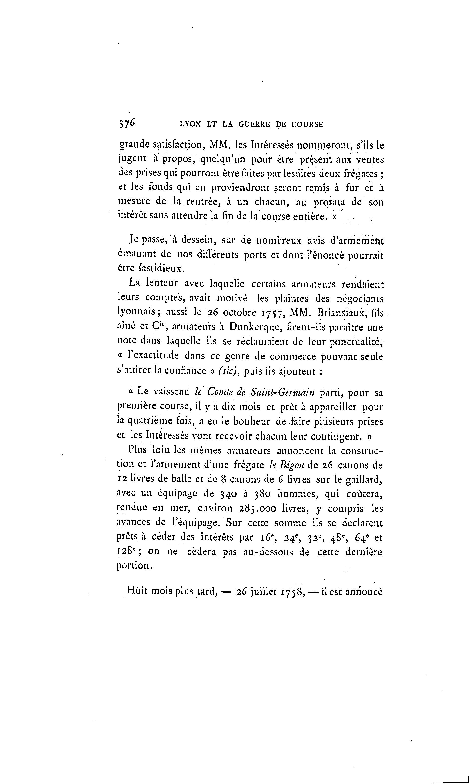 376 LYON ET LA GUERRE DE.COURSE grande satisfaction, MM. les Intéressés nommeront, s'ils le jugent à propos, quelqu'un pour être présent aux ventes des prises qui pourront être faites par lesdites deux frégates ; et les fonds qui en proviendront seront remis à fur et à mesure de la rentrée, à un chacun, au prorata de son intérêt sans attendre la fin de la course entière. » Je passe, à dessein, sur de nombreux avis d'armement émanant de nos différents ports et dont l'énoncé pourrait être fastidieux. La lenteur avec laquelle certains armateurs rendaient leurs comptes, avait motivé les plaintes des négociants lyonnais; aussi le 26 octobre 1757, MM. Briansiaux,; fils aine et C ie , armateurs à Dunkerque, firent-ils paraître une note dans laquelle ils se réclamaient de leur ponctualité,1 « l'exactitude dans ce genre de commerce pouvant seule s'attirer la confiance » (sic), puis ils ajoutent : « Le vaisseau le Comte de Saint-Germain parti, pour sa première course, il y a dix mois et prêt à appareiller pour la quatrième fois, a eu le bonlieur de faire plusieurs prises et les Intéressés vont recevoir chacun leur contingent. » Plus loin les mêmes armateurs annoncent la construc- tion et l'armement d'une frégate le Bégon de 26 canons de 12 livres de balle et de 8 canons de 6 livres sur le gaillard, avec un équipage de 340 à 380 hommes, qui coûtera, rendue en mer, environ 285.000 livres, y compris les avances de l'équipage. Sur cette somme ils se déclarent prêts à céder des intérêts par 16% 24 e , 32 e , 48 e , 64 e et 128 e ; on ne cédera pas au-dessous de cette dernière portion. Huit mois plus tard, — 26 juillet 1758, — il est annoncé