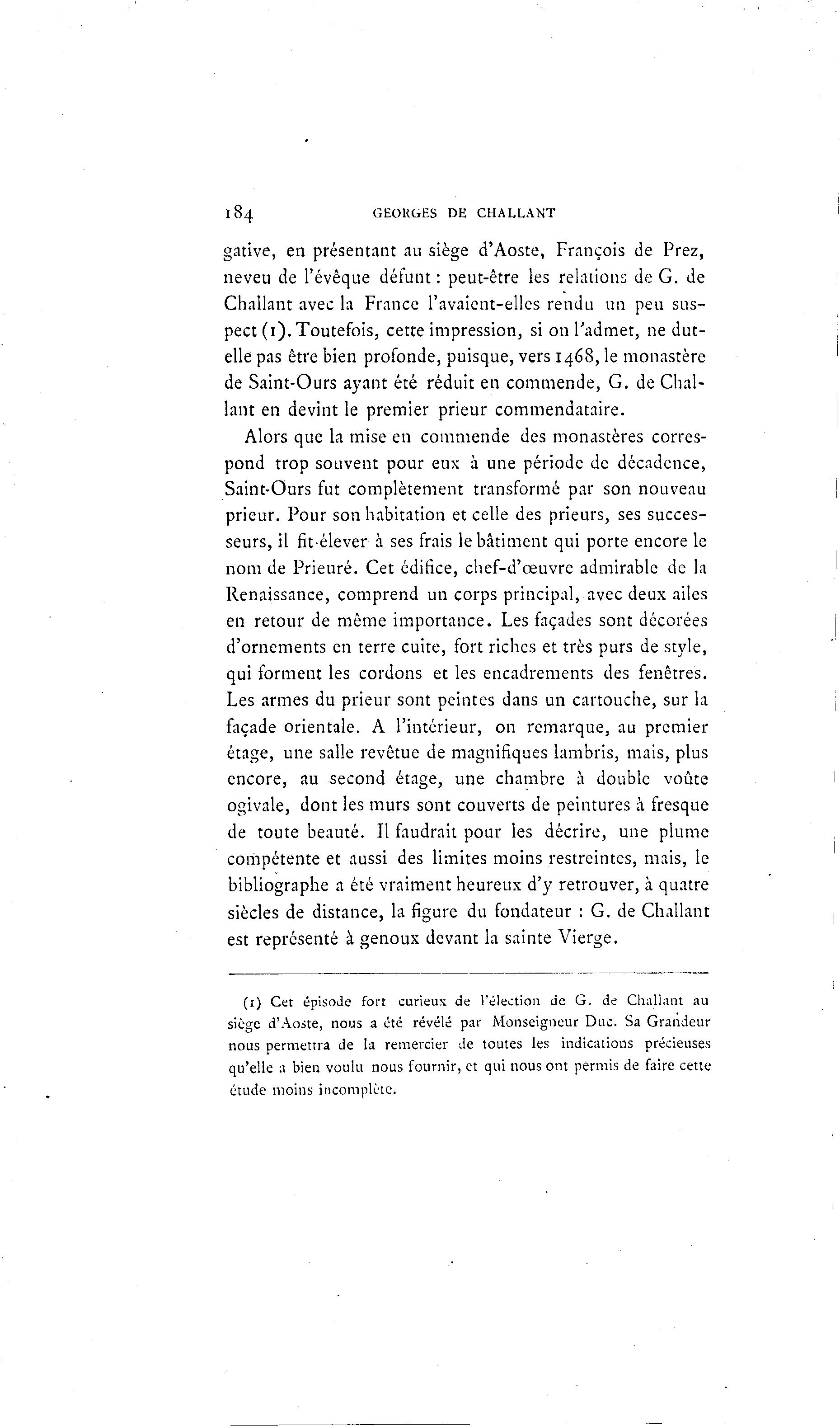 184 GEORGES DE CHALLANT gative, en présentant au siège d'Aoste, François de Prez, neveu de l'évêque défunt: peut-être les relations de G. de Challant avec la France l'avaient-elles rendu un peu sus- pect (1). Toutefois, cette impression, si on l'admet, ne dut- elle pas être bien profonde, puisque, vers 1468, le monastère de Saint-Ours ayant été réduit en commende, G. de Chal- lant en devint le premier prieur commendataire. Alors que la mise en commende des monastères corres- pond trop souvent pour eux à une période de décadence, Saint-Ours fut complètement transformé par son nouveau prieur. Pour son habitation et celle des prieurs, ses succes- seurs, il fit-élever à ses frais le bâtiment qui porte encore le nom de Prieuré. Cet édifice, chef-d'œuvre admirable de la Renaissance, comprend un corps principal, avec deux ailes en retour de même importance. Les façades sont décorées d'ornements en terre cuite, fort riches et très purs de style, qui forment les cordons et les encadrements des fenêtres. Les armes du prieur sont peintes dans un cartouche, sur la façade orientale. A l'intérieur, on remarque, au premier étage, une salle revêtue de magnifiques lambris, mais, plus encore, au second étage, une chambre à double voûte ogivale, dont les murs sont couverts de peintures à fresque de toute beauté. Il faudrait pour les décrire, une plume compétente et aussi des limites moins restreintes, mais, le bibliographe a été vraiment heureux d'y retrouver, à quatre siècles de distance, la figure du fondateur : G. de Challant est représenté à genoux devant la sainte Vierge. (1) Cet épisode fort curieux de l'élection de G. de Challant au siège d'Aoste, nous a été révélé par Monseigneur Duc. Sa Grandeur nous permettra de !a remercier de toutes les indications précieuses qu'elle a bien voulu nous fournir, et qui nous ont permis de faire cette étude moins incomplète.