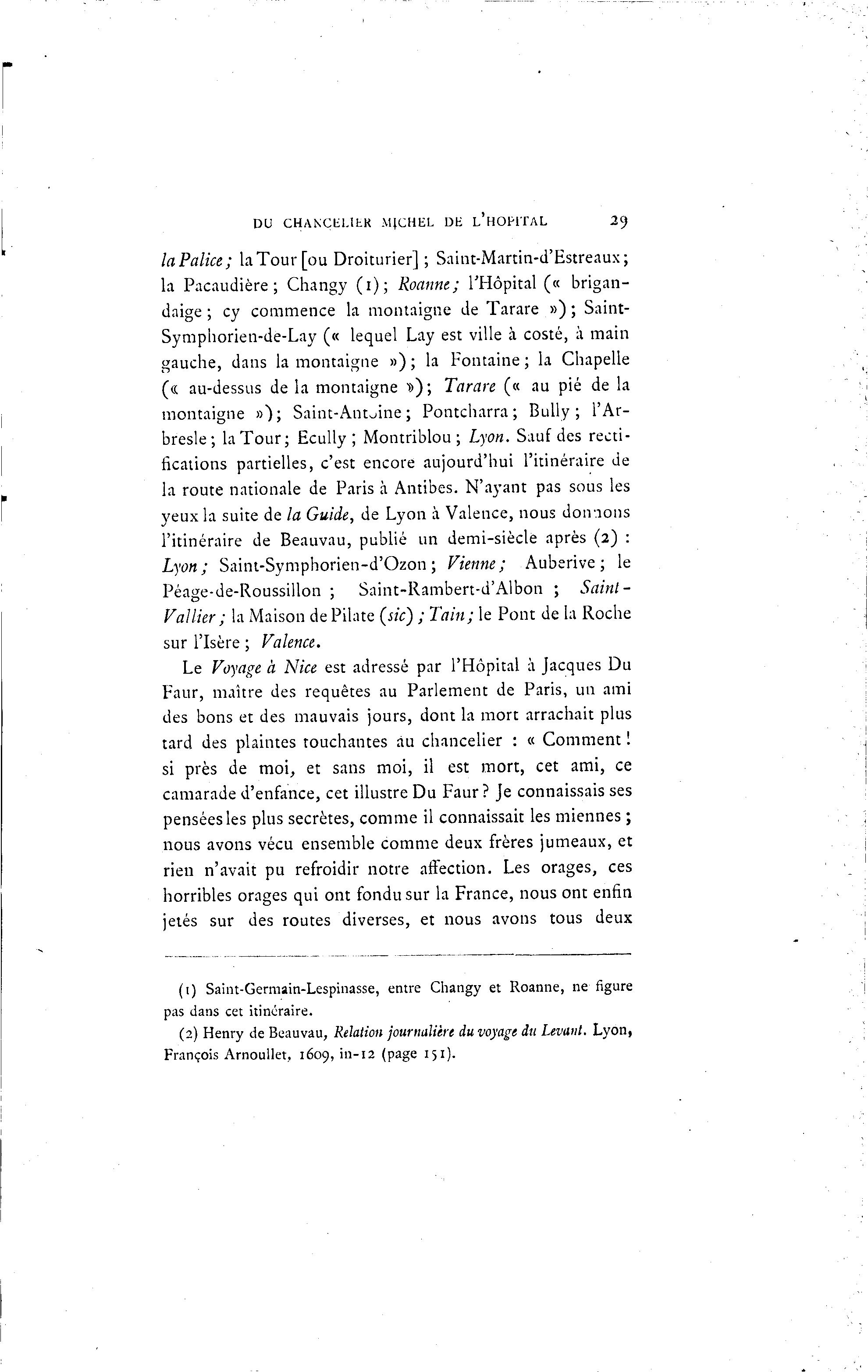 DU CHANCELIER MICHEL DE L'HOHTAL 2<-) laPalice; la Tour [ou Droiturier] ; Saint-Martin-d'Estreaux; la Pacaudière ; Changy ( i ) ; Roanne; l'Hôpital (« brigan- daige ; cy commence la montaigne de Tarare ») ; Saint- Symphorien-de-Lay (« lequel Lay est ville à costé, à main gauche, dans la montaigne ») ; la Fontaine ; la Chapelle (ce au-dessus de la montaigne D); Tarare (« au pié de la montaigne » ) ; Saint-Antoine; Pontcharra ; Bully ; l'Ar- bresle; la Tour; Ecully ; Montriblou ; Lyon. Sauf des recti- fications partielles, c'est encore aujourd'hui l'itinéraire de la route nationale de Paris à Amibes. N'ayant pas sous les yeux la suite de la Guide, de Lyon à Valence, nous donnons l'itinéraire de Beauvau, publié un demi-siècle après (2) : Lyon; Saint-Symphorien-d'Ozon ; Vienne; Auberive ; le Péage-de-Roussillon ; Saint-Rambert-d'Albon ; Saint - Val lier ; la Maison de Pilate (sic) ; Tain; le Pont de la Roche sur l'Isère ; Faïence. Le Voyage à Nice est adressé par l'Hôpital à Jacques Du Faur, maître des requêtes au Parlement de Paris, un ami des bons et des mauvais jours, dont la mort arrachait plus tard des plaintes touchantes au chancelier : « Comment ! si près de moi, et sans moi, il est mort, cet ami, ce camarade d'enfance, cet illustre Du Faur ? Je connaissais ses pensées les plus secrètes, comme il connaissait les miennes ; nous avons vécu ensemble comme deux frères jumeaux, et rien n'avait pu refroidir notre affection. Les orages, ces horribles orages qui ont fondu sur la France, nous ont enfin jetés sur des routes diverses, et nous avons tous deux (1) Saint-Germain-Lespinasse, entre Changy et Roanne, ne figure pas dans cet itinéraire. (2) Henry de Beauvau, Relation journalière du voyage du Levant. Lyon, François Arnoullet, 1609, in-12 (page 151).